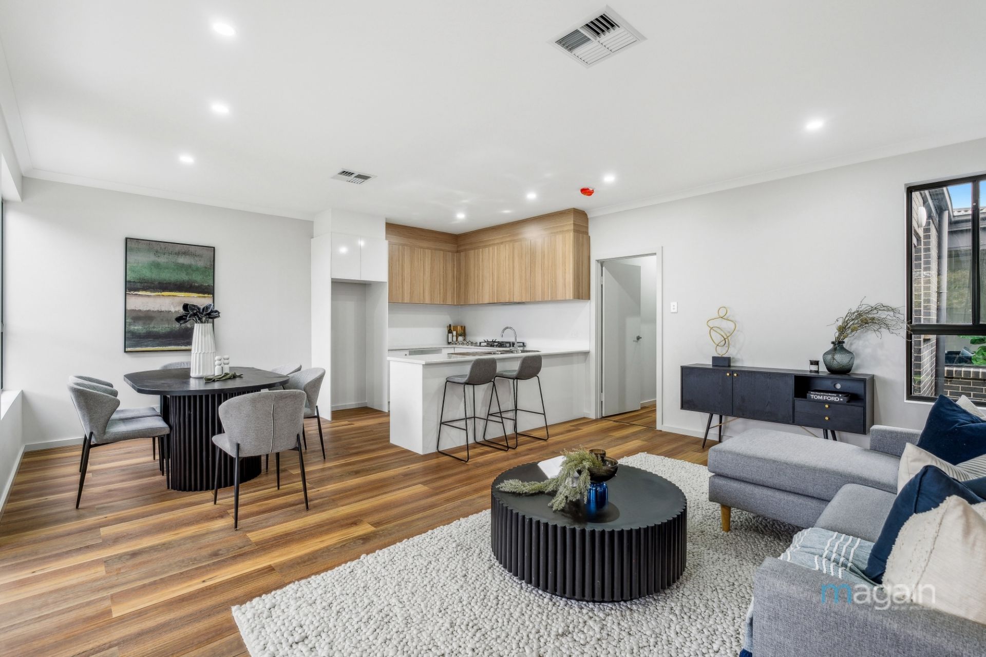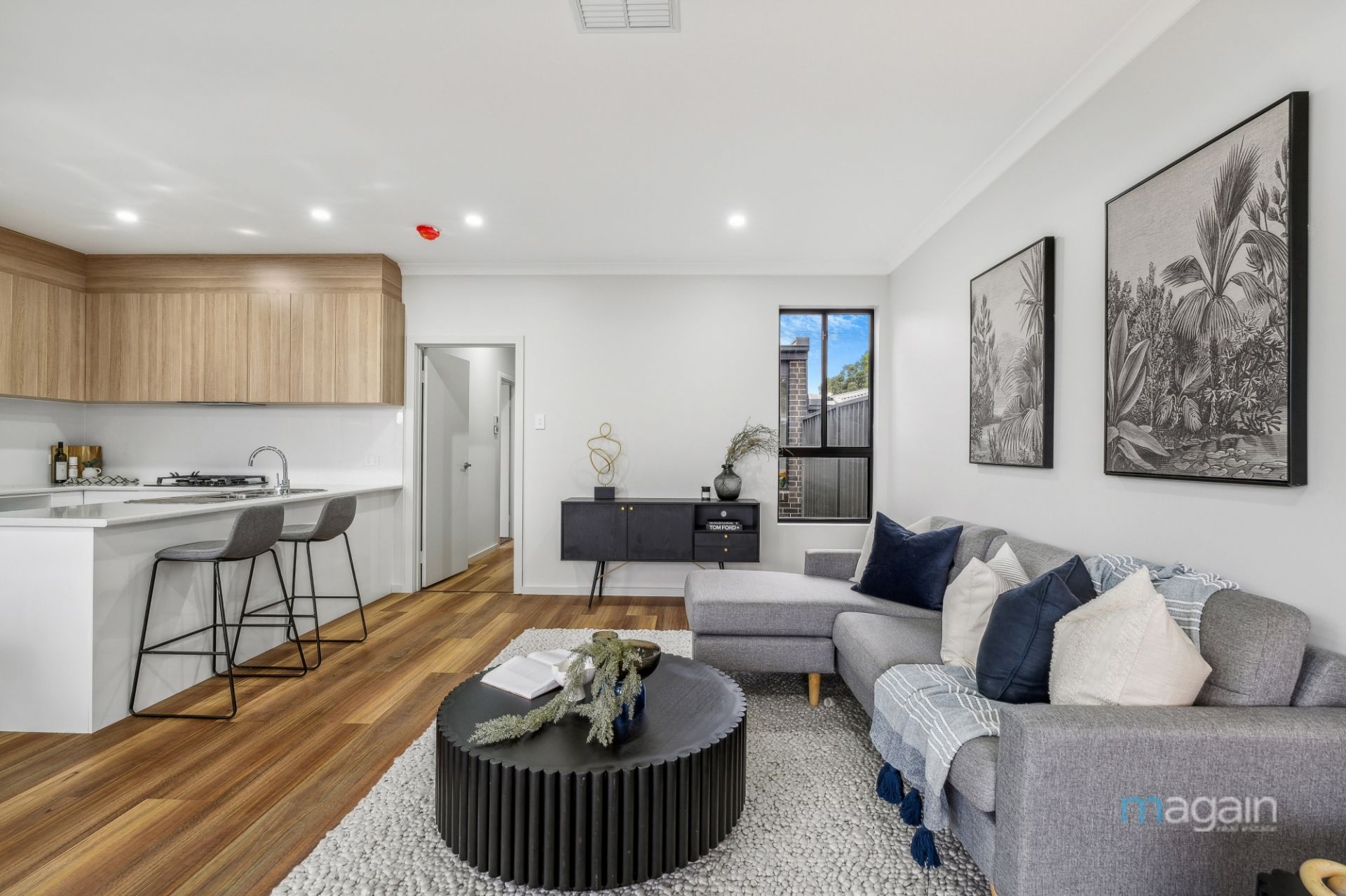 Upon entry, a neat hallway welcomes you, seamlessly leading past a formal lounge to a spacious, light-filled open-plan lounge and dining area with timber-like floors and 2.7m ceilings, all overlooked by a modern kitchen. Beautifully designed with a stylish combination of white and timber cabinetry, the kitchen boasts quality stainless steel appliances, including a gas cooktop and dishwasher, and a well-appointed breakfast bar, making it a perfect gathering spot for entertaining family and friends. This kitchen is sure to impress those who consider it the heart of the home.