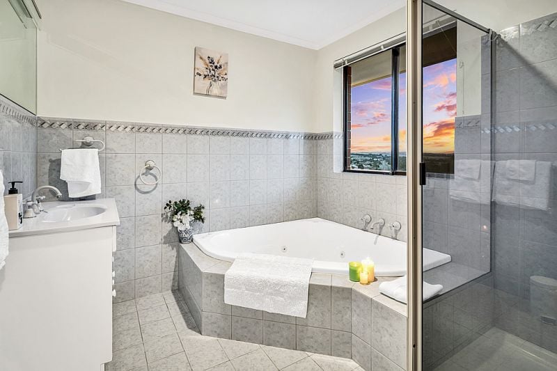 > Upstairs main bathroom with separate shower, spa bath and toilet