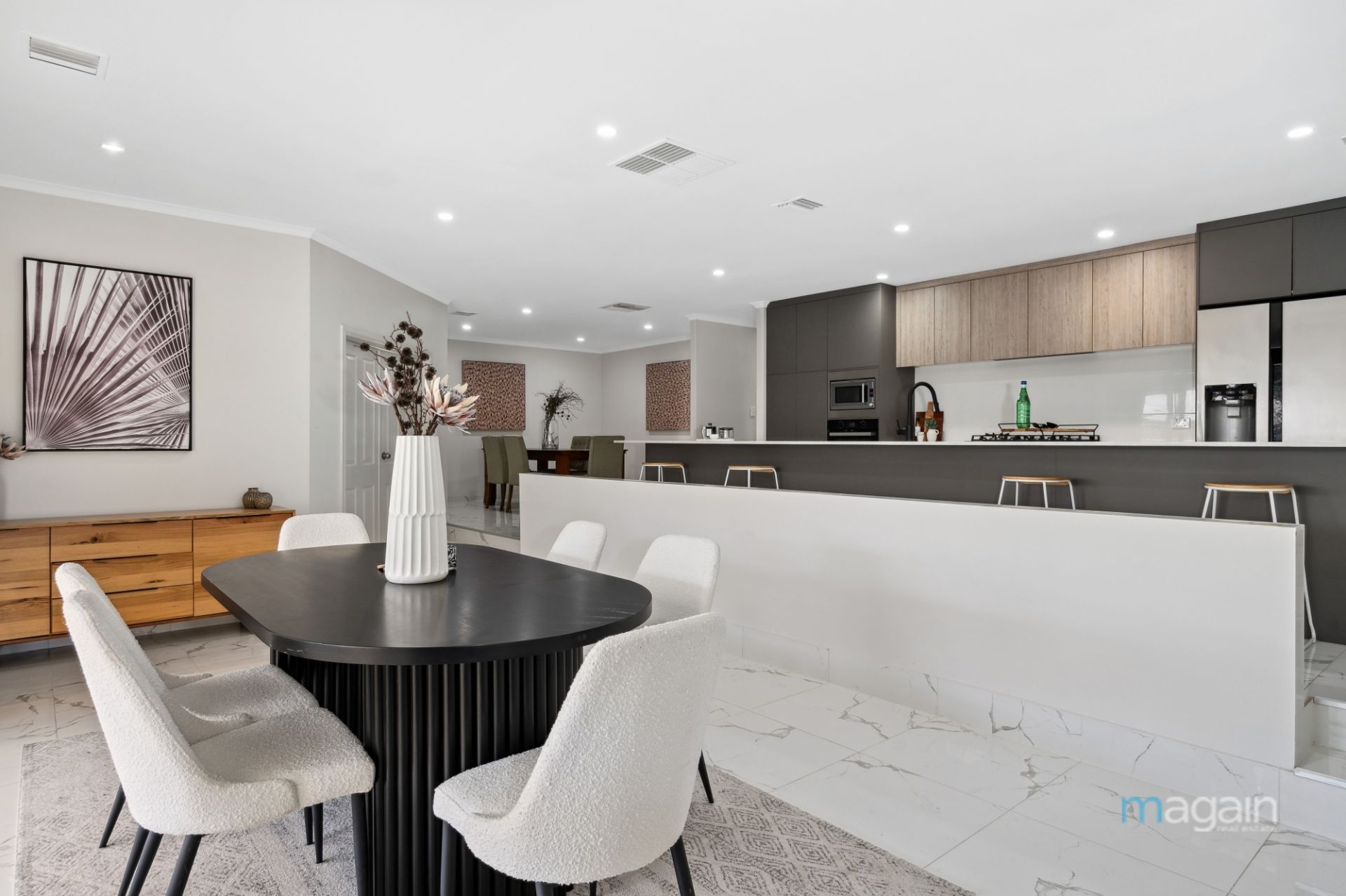 This kitchen overlooks a formal dining area and a warm family living space. Adjacent to this open-plan haven is a sophisticated formal lounge, and through double doors awaits a dedicated theatre room, providing the perfect setting for entertainment.