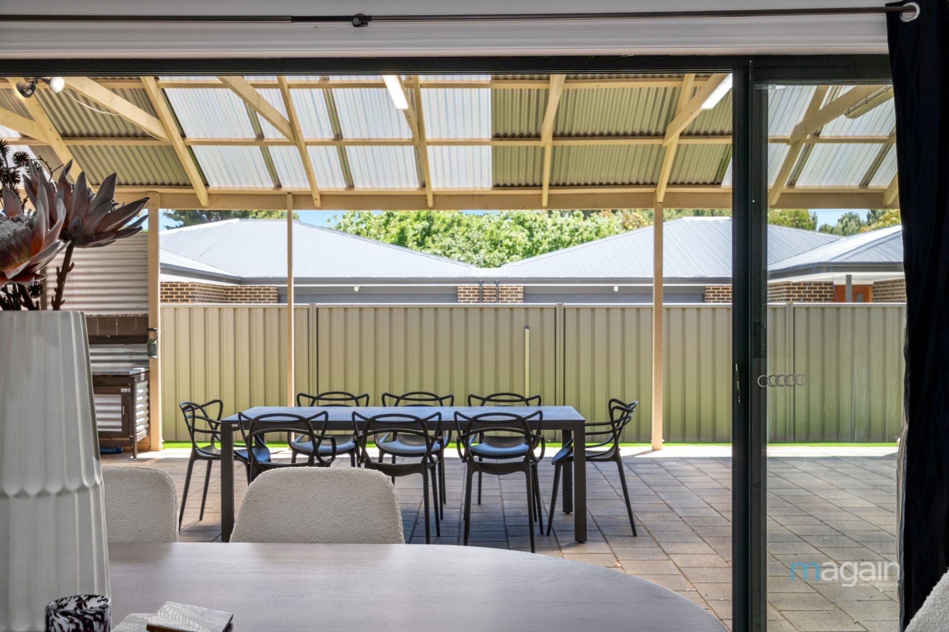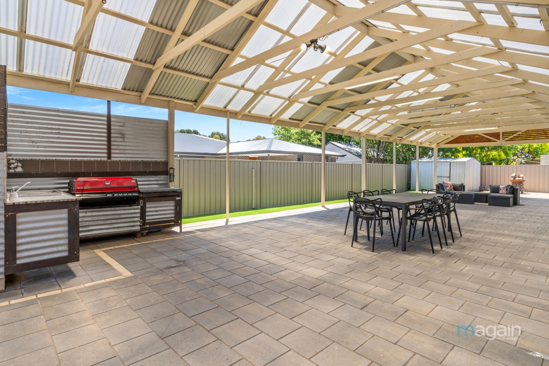 Glass double stacker doors seamlessly connect the family living area to a vast paved entertaining space with a pitched roof pergola. This area is perfect for hosting large gatherings and comes equipped with a built-in BBQ, storage room, and a garden shed.