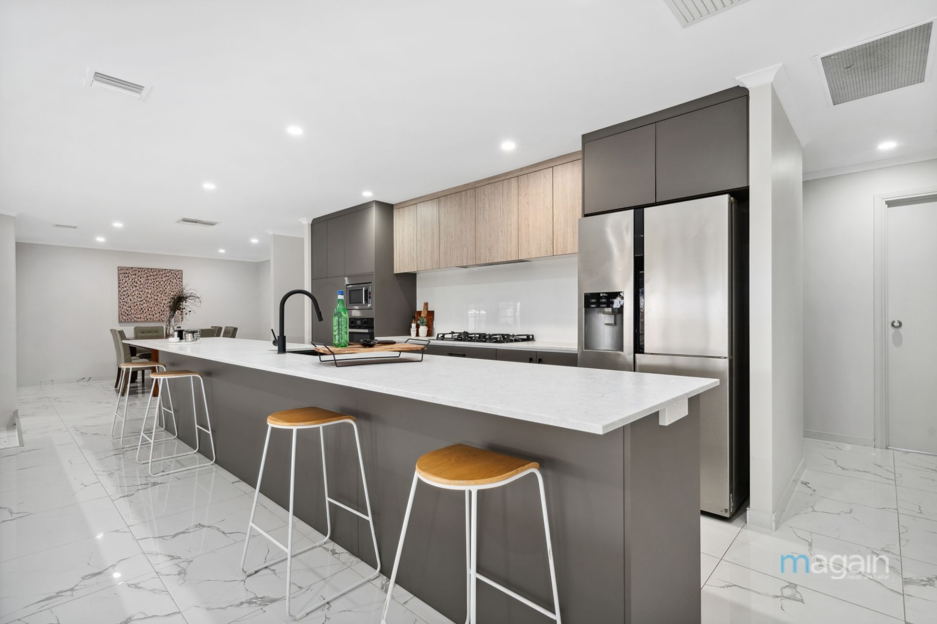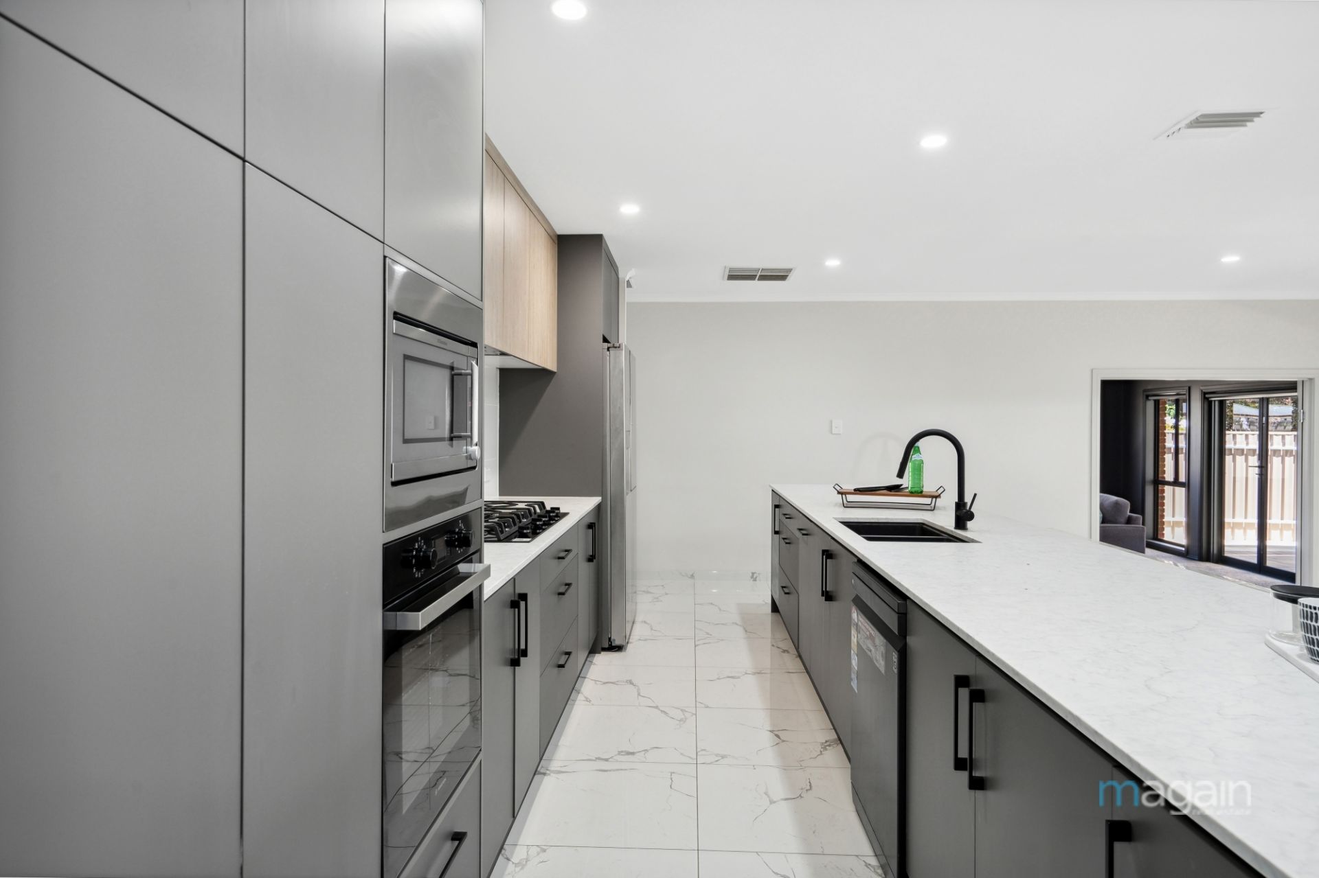 The true heart of this home lies in the remarkable kitchen, a contemporary masterpiece with on-trend modern black fittings, and featuring a substantial breakfast bar that beckons for gatherings and casual meals. Boasting a gas cooktop, dishwasher, and a built-in oven, this kitchen is designed to delight the culinary enthusiast in you. Every detail has been carefully considered to ensure a seamless blend of functionality and style, making this kitchen the focal point of the residence.