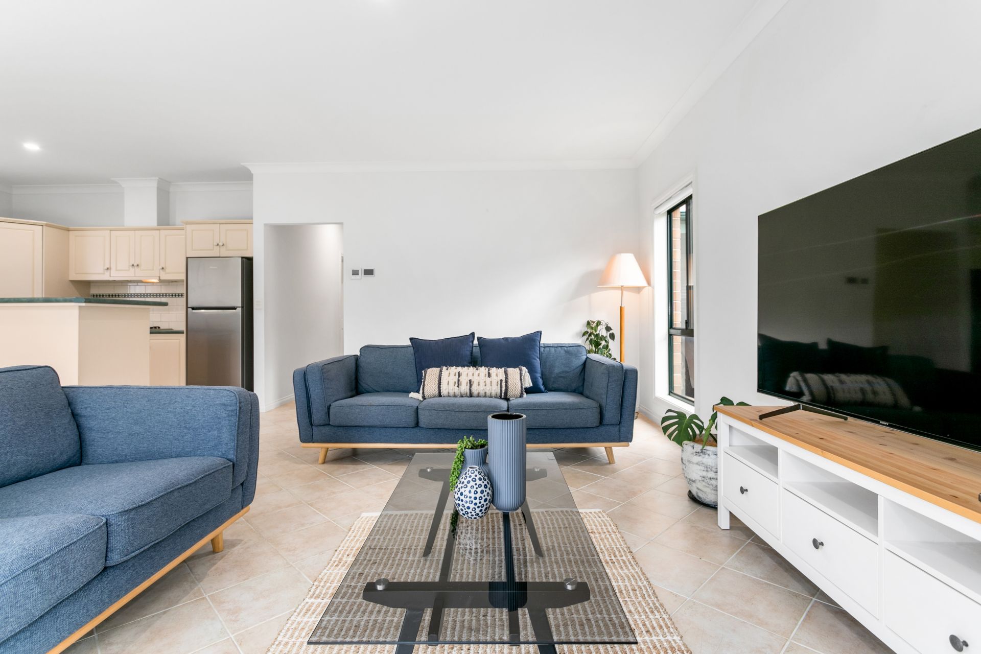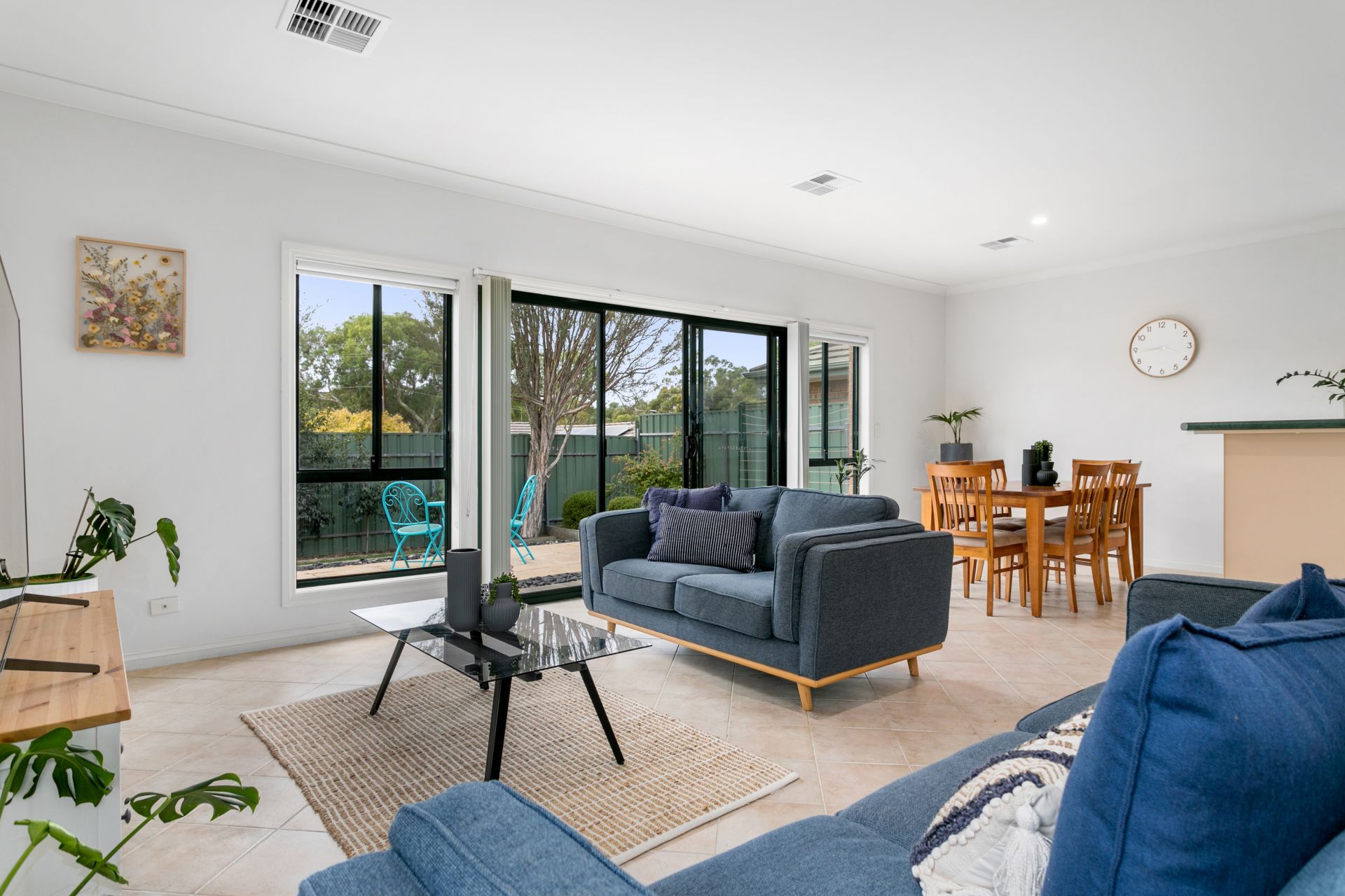 > open plan living blends seamlessly through glass sliding doors that provide the perfect inside/outside transition to a low maintenance backyard with lovely garden beds and established trees
