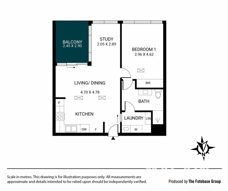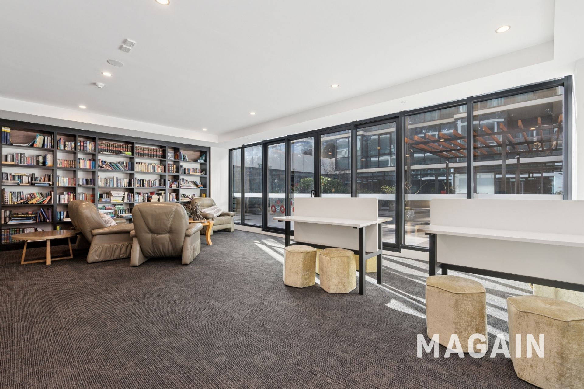 > The apartment features a spacious bedroom with built-in robe, a separate study ideal for working from home, and a central bathroom with modern finishes. A separate laundry with storage adds to the practicality