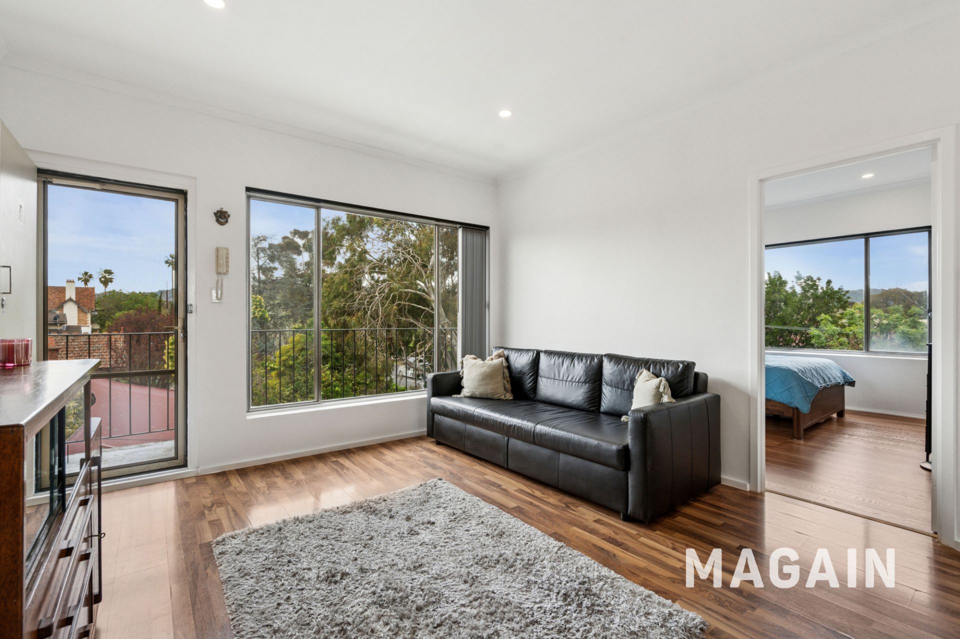 > The home features two spacious bedrooms, a neat bathroom, and a light-filled living area with leafy outlooks