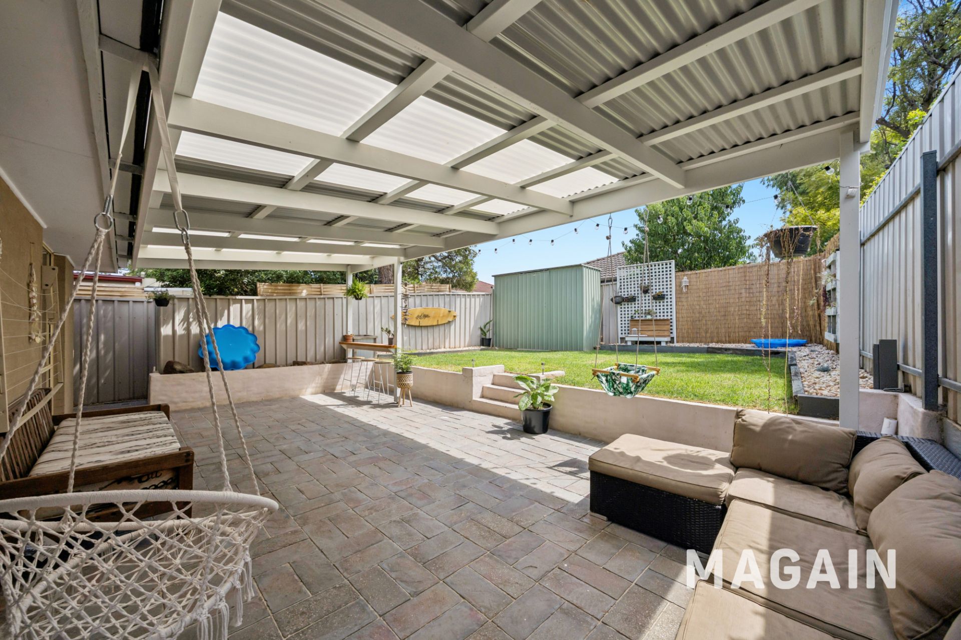 Outdoors is a true highlight. The expansive undercover verandah creates a fantastic all-weather entertaining area, overlooking a secure backyard with established greenery and plenty of lawn to enjoy. Whether hosting gatherings or simply relaxing at home, the outdoor space is generous and versatile. A garden shed provides additional storage, while the yard offers privacy and room to move.