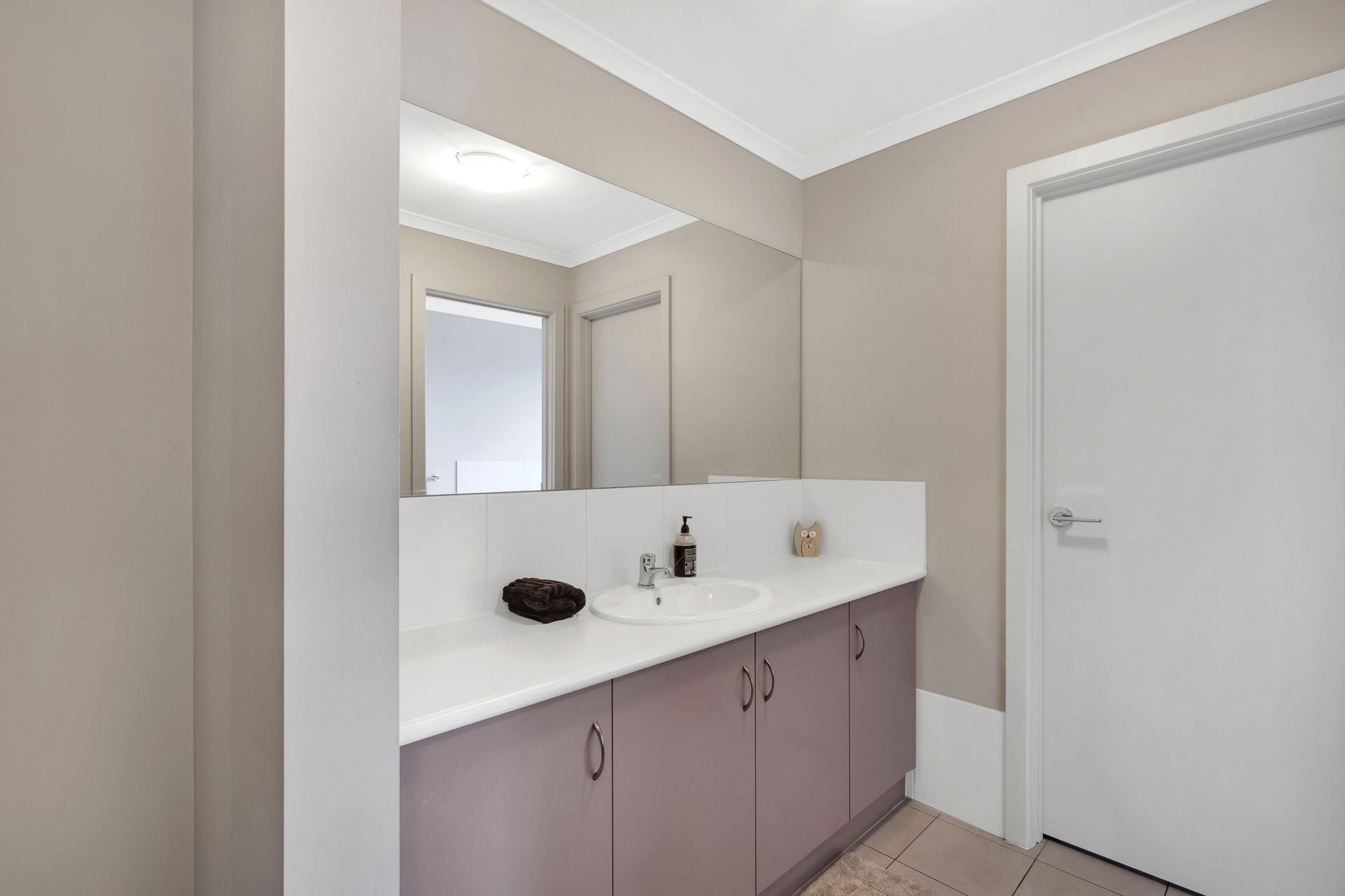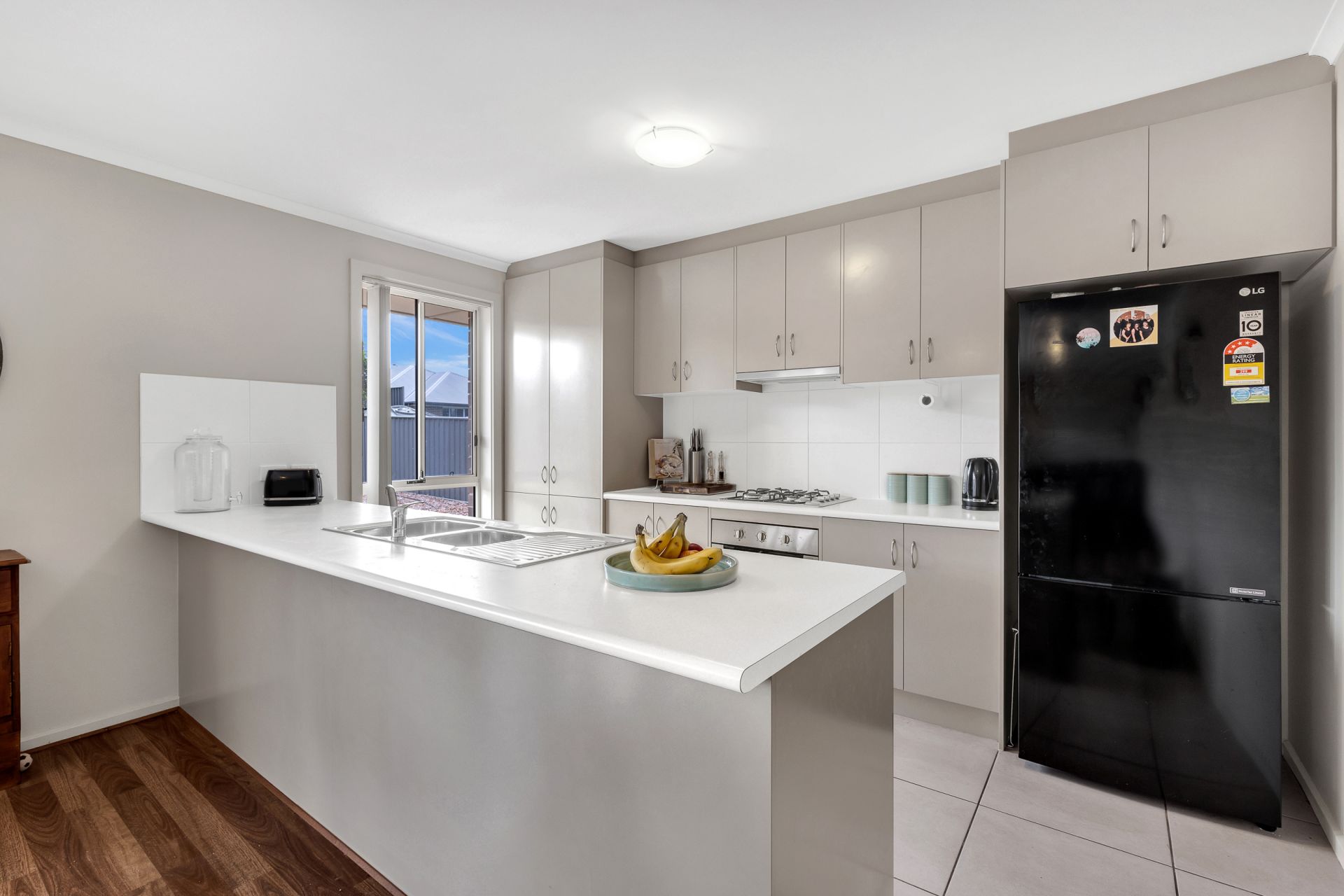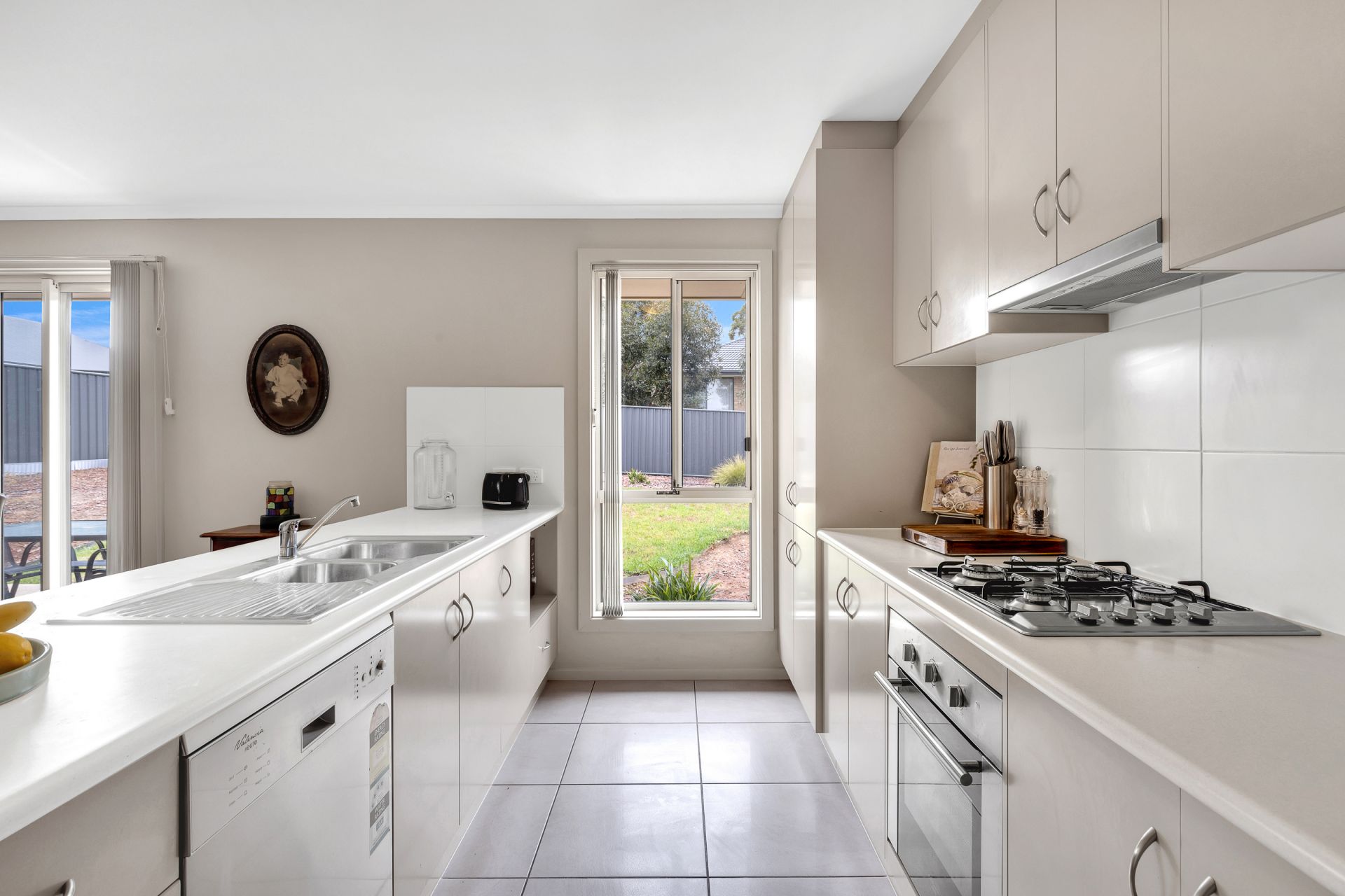 *The modern kitchen continues in the neutral theme with plenty of storage, bench space and stainless-steel oven and gas cooktop.