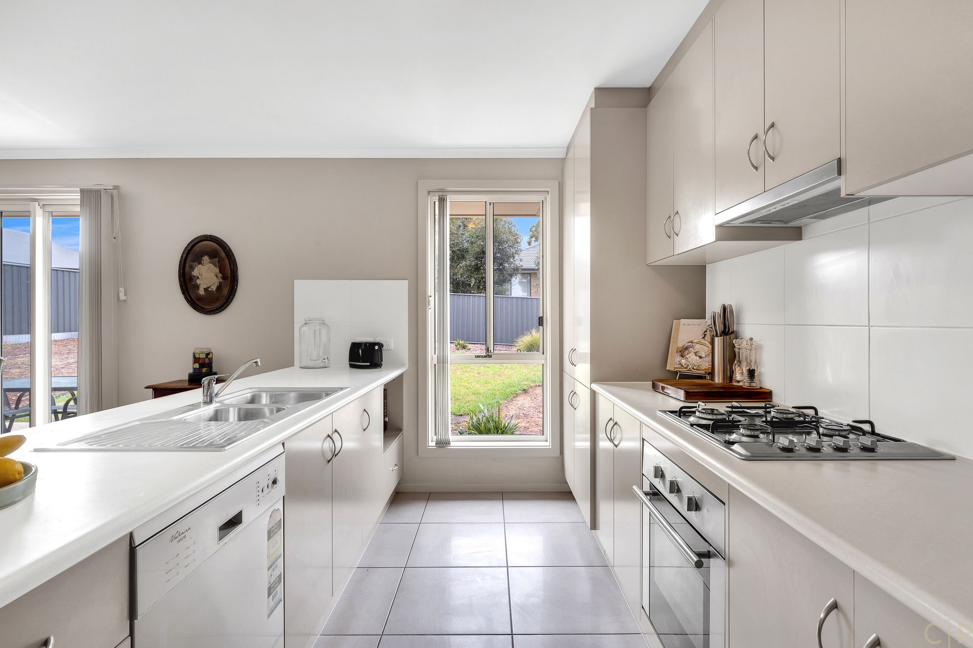 * The modern kitchen continues in the neutral theme with plenty of storage, bench space and Stainless Steel oven and gas cooktop.