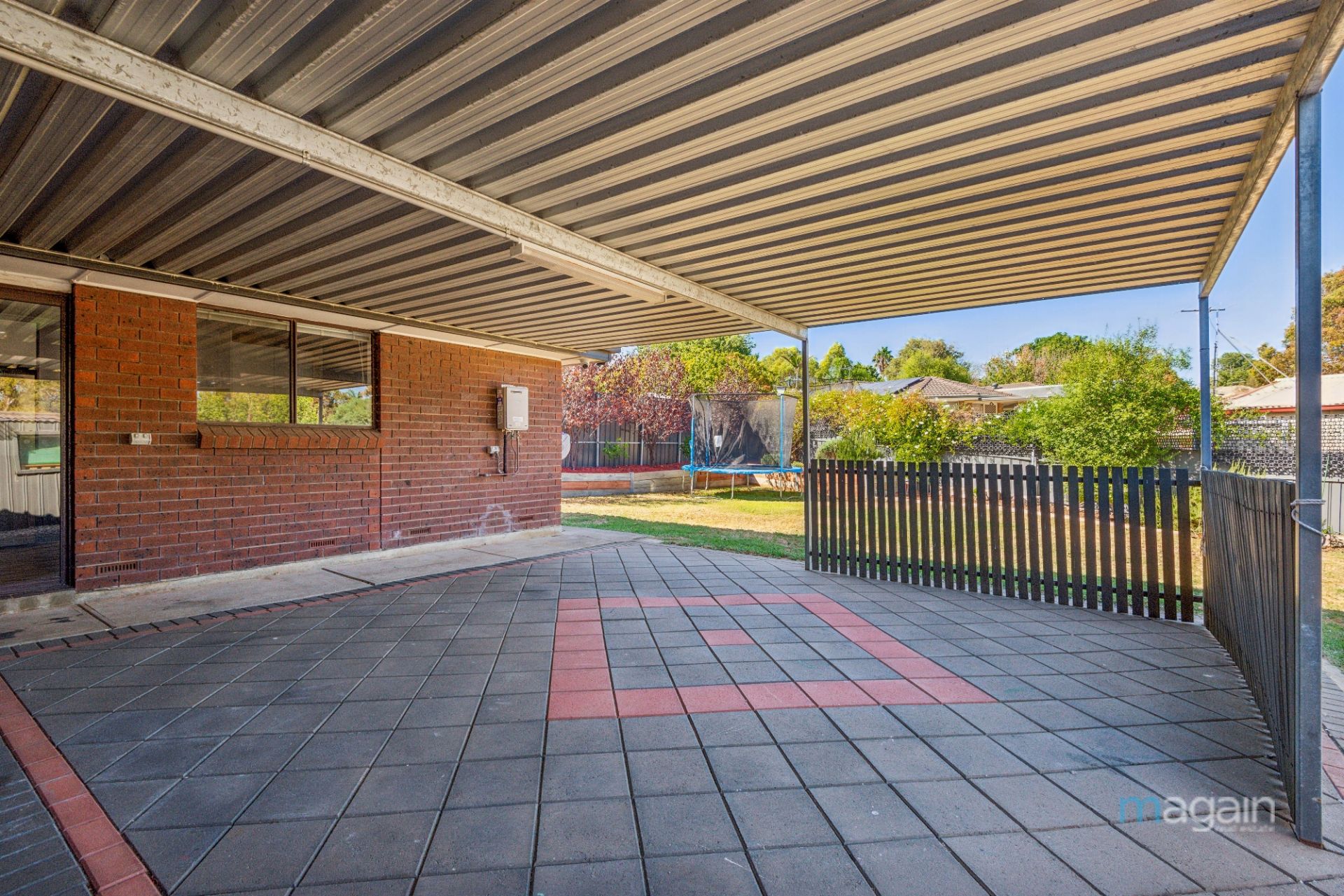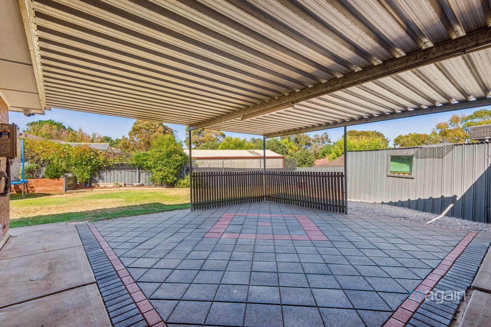 Sliding doors from the generous dining area (or potential second living space) offer seamless access to an expansive, paved entertaining area. A flat-roof pergola ensures year-round enjoyment, while the landscaped backyard-featuring a lush level lawn and established trees-provides a private haven where children and pets can play freely.