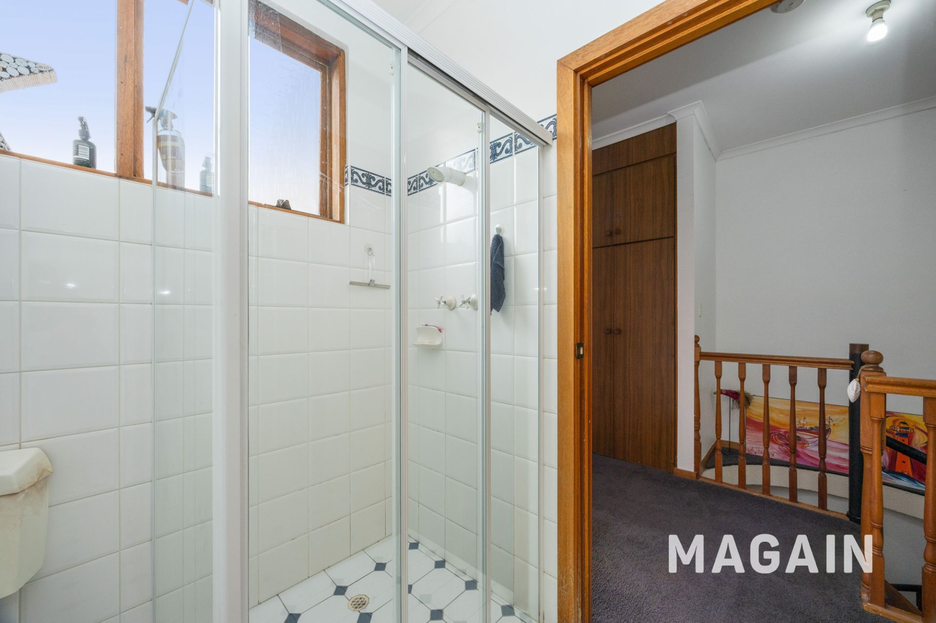> Light and bright bathroom located upstairs with full size bath and separate shower