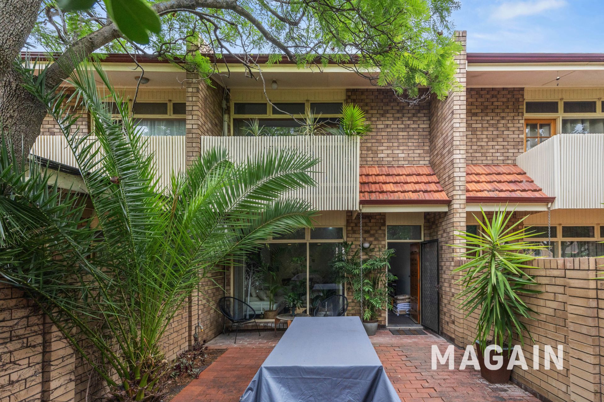 > Large lounge and dining area with split system overlooking the leafy courtyard