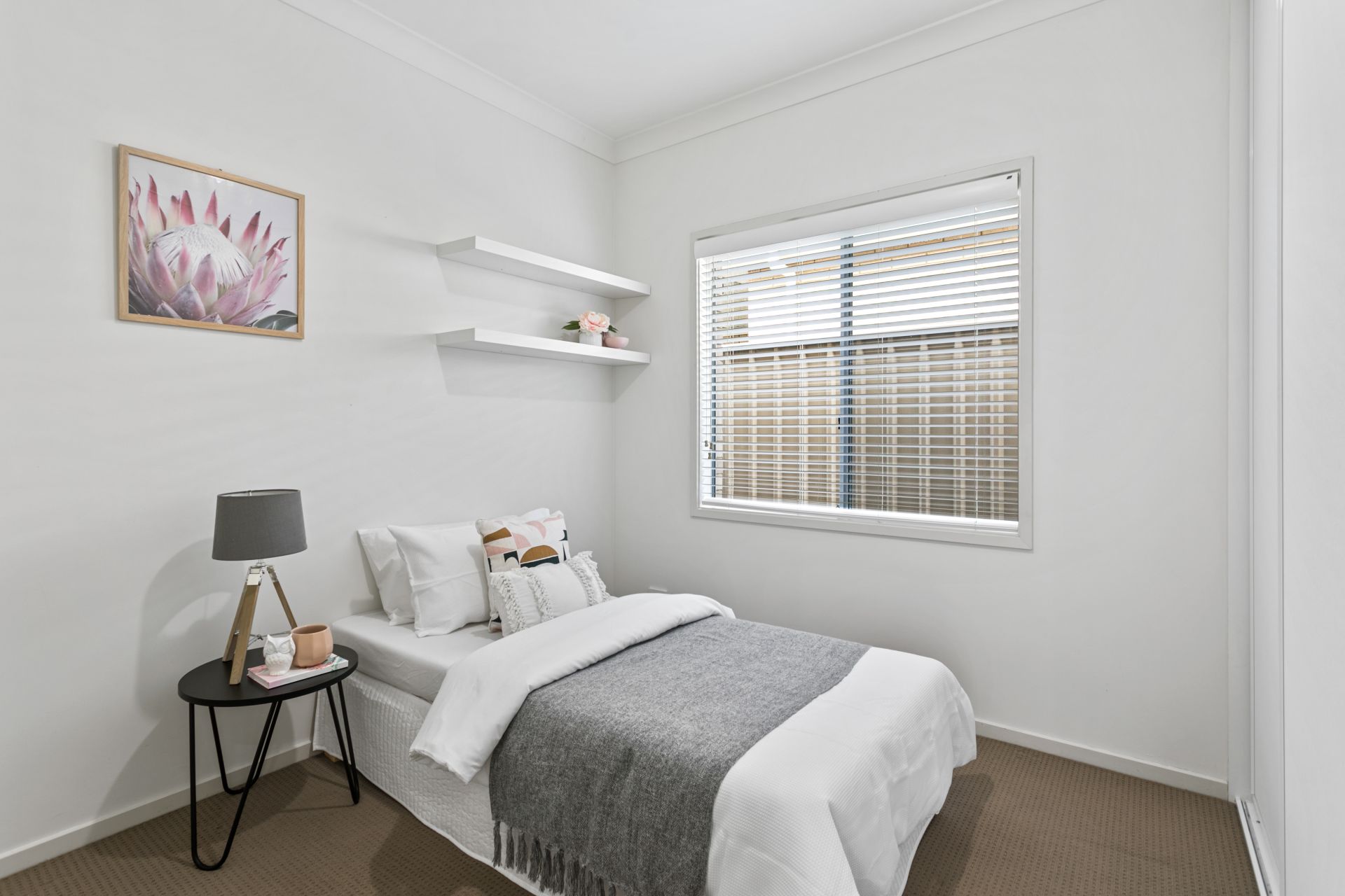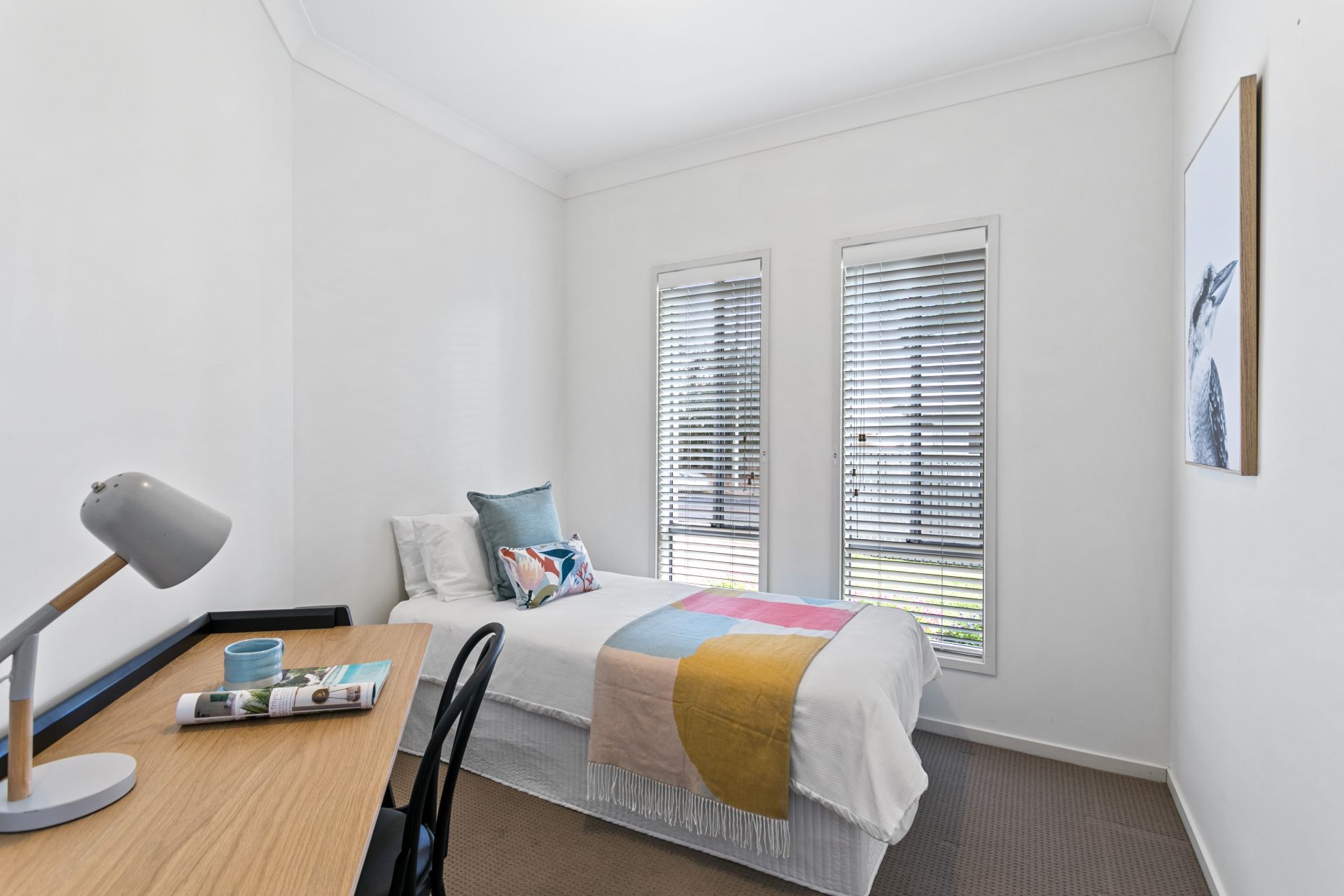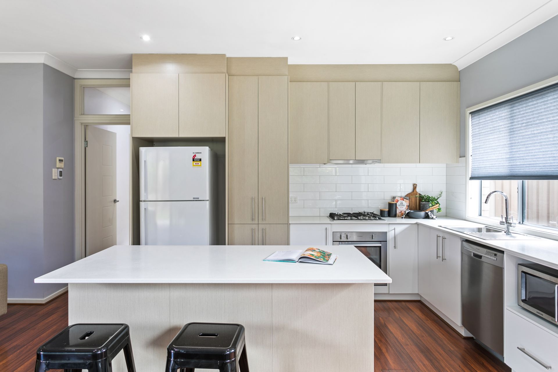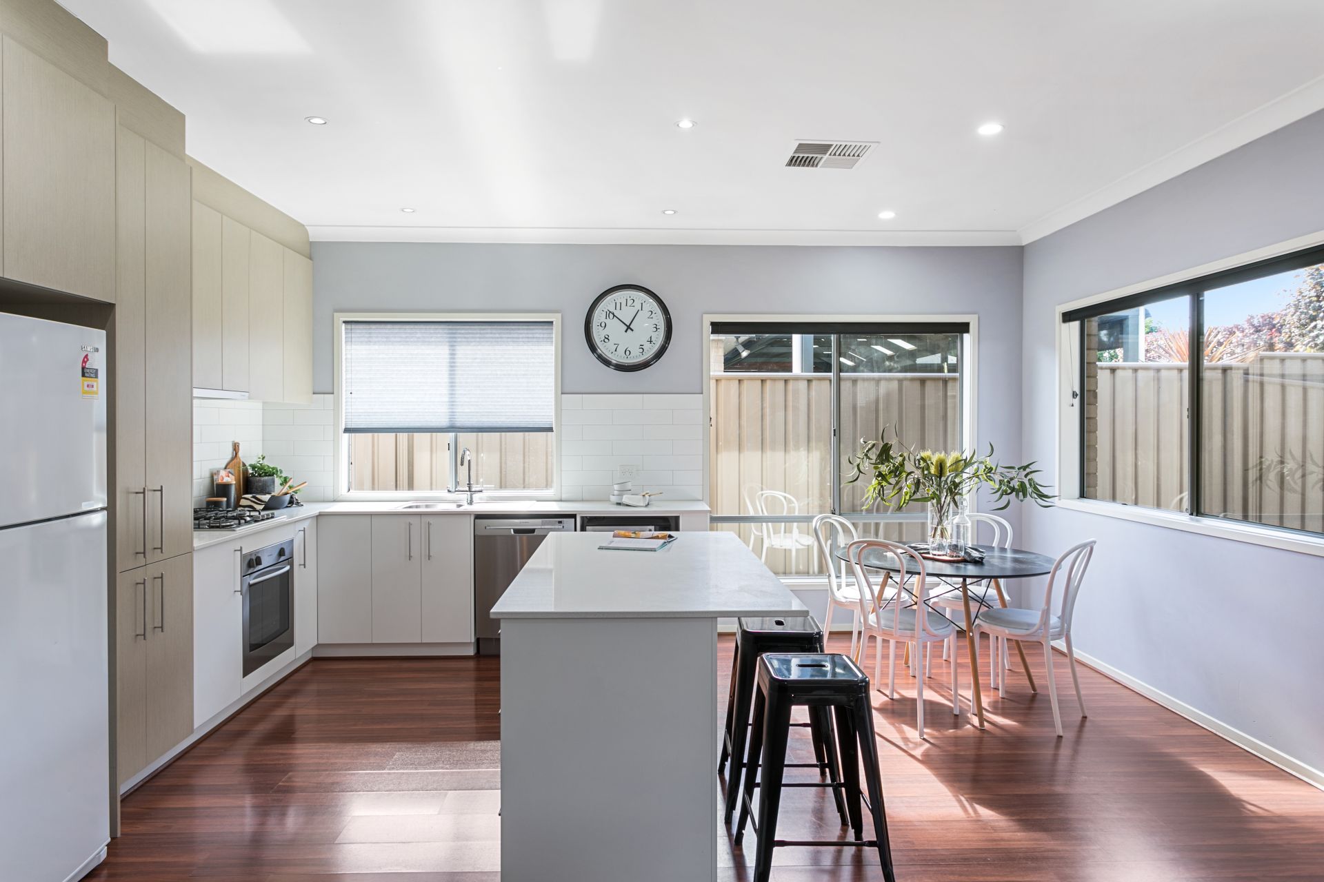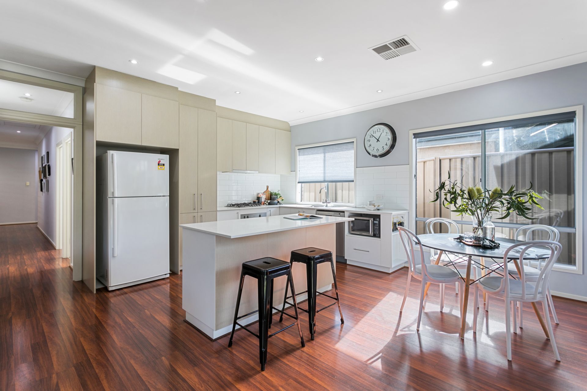 At the heart of the home you will find the open planned kitchen, dining and living space. The chef of the home will be impressed with the amount of bench space on offer, all benches made of ceasar stone. There is ample amounts of cupboard space and all the necessary appliances are installed, including gas cooktop and dishwasher. The kitchen overlooks the living and dining space, which also flows seamlessly onto the back yard. For year round comfort, ducted reverse cycle air conditioning has been installed. There is also a split system in the open plan living space.
