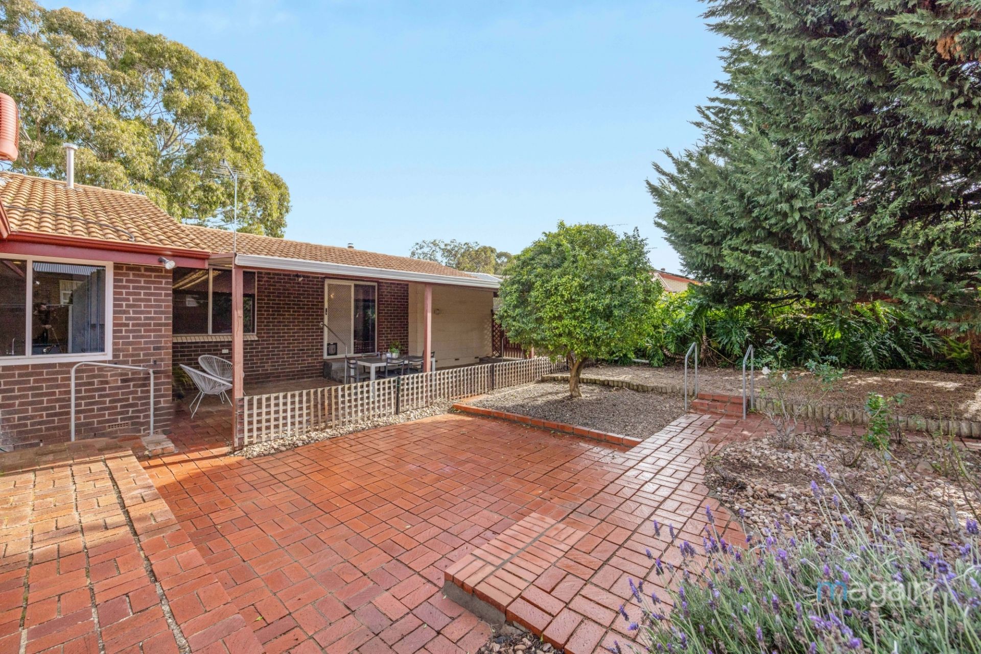 Outdoor living is a delight with a sliding door from the family living room, leading to a paved entertaining area, shaded by a flat roof pergola. This area overlooks a well-maintained split-level yard, bordered by established trees and neat garden beds, creating a perfect setting for relaxation and entertaining, while allowing plenty of space for the kids and pets to run around and explore.