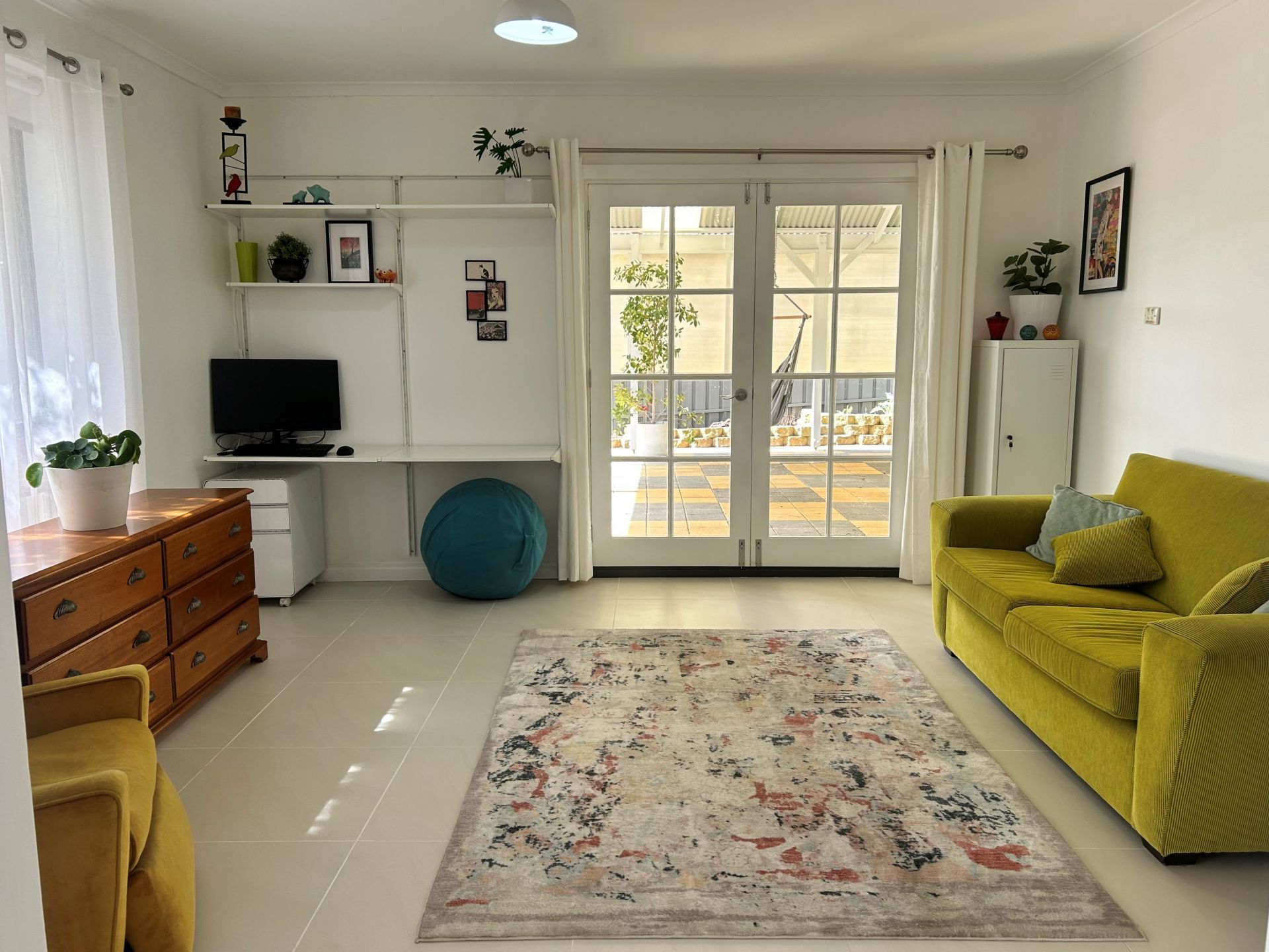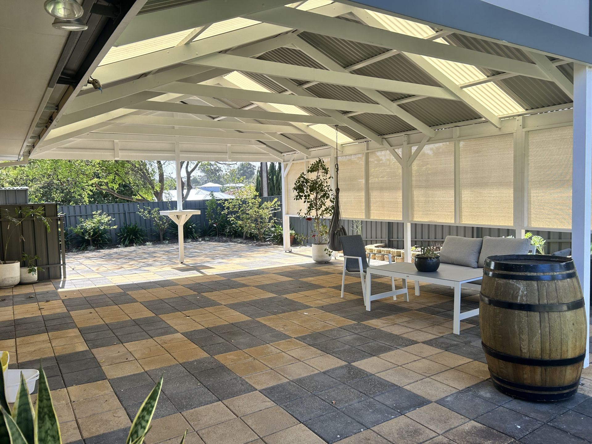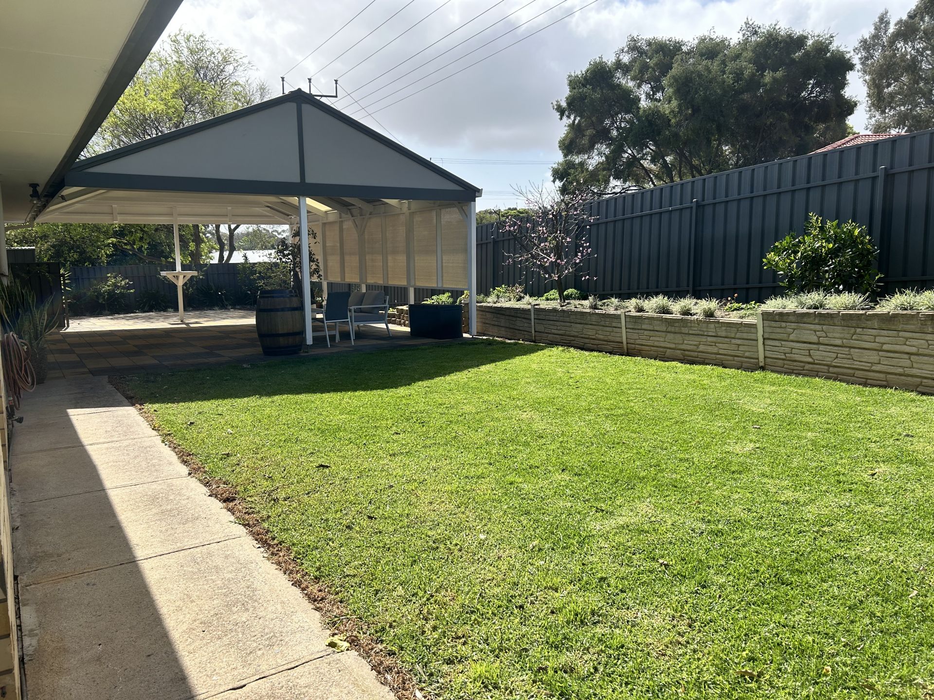 French doors from the second living area open to the expansive backyard, which features a paved entertaining area with a pitched roof pergola for year-round dining, a lush grassy area with a watering system, and eleven fruit trees.