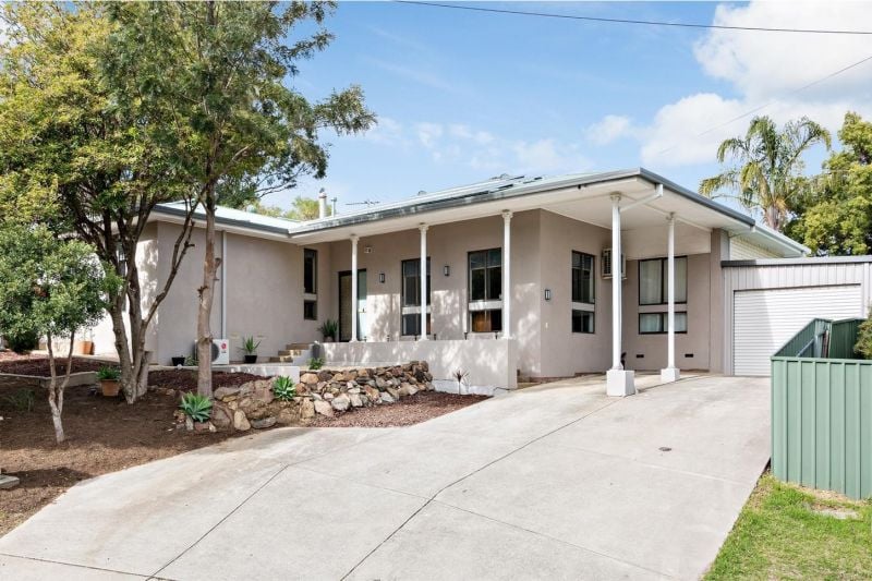 Additional features include a single garage next to a single carport, ample off-street parking, five split system heating and cooling units throughout the home, double brick construction, a cellar, NBN connectivity, gas hot water, a garden shed, and solar panels.