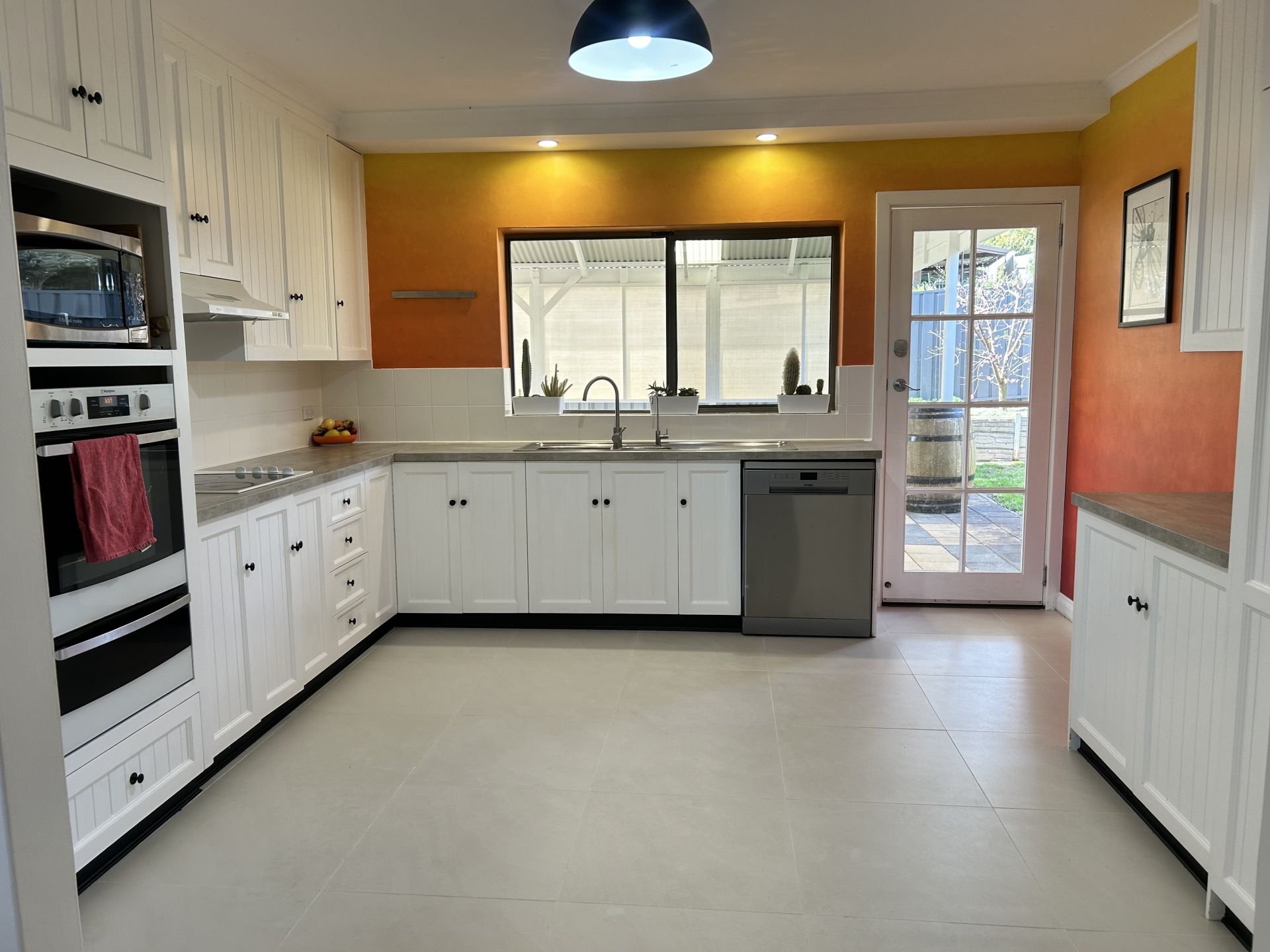 Continuing through, you'll find an upgraded kitchen overlooking a casual meals area, and adjacent to a family living and formal dining. The timeless, neutral-toned kitchen combines character with practicality, equipped with a built-in oven, cooktop with rangehood, and dishwasher.