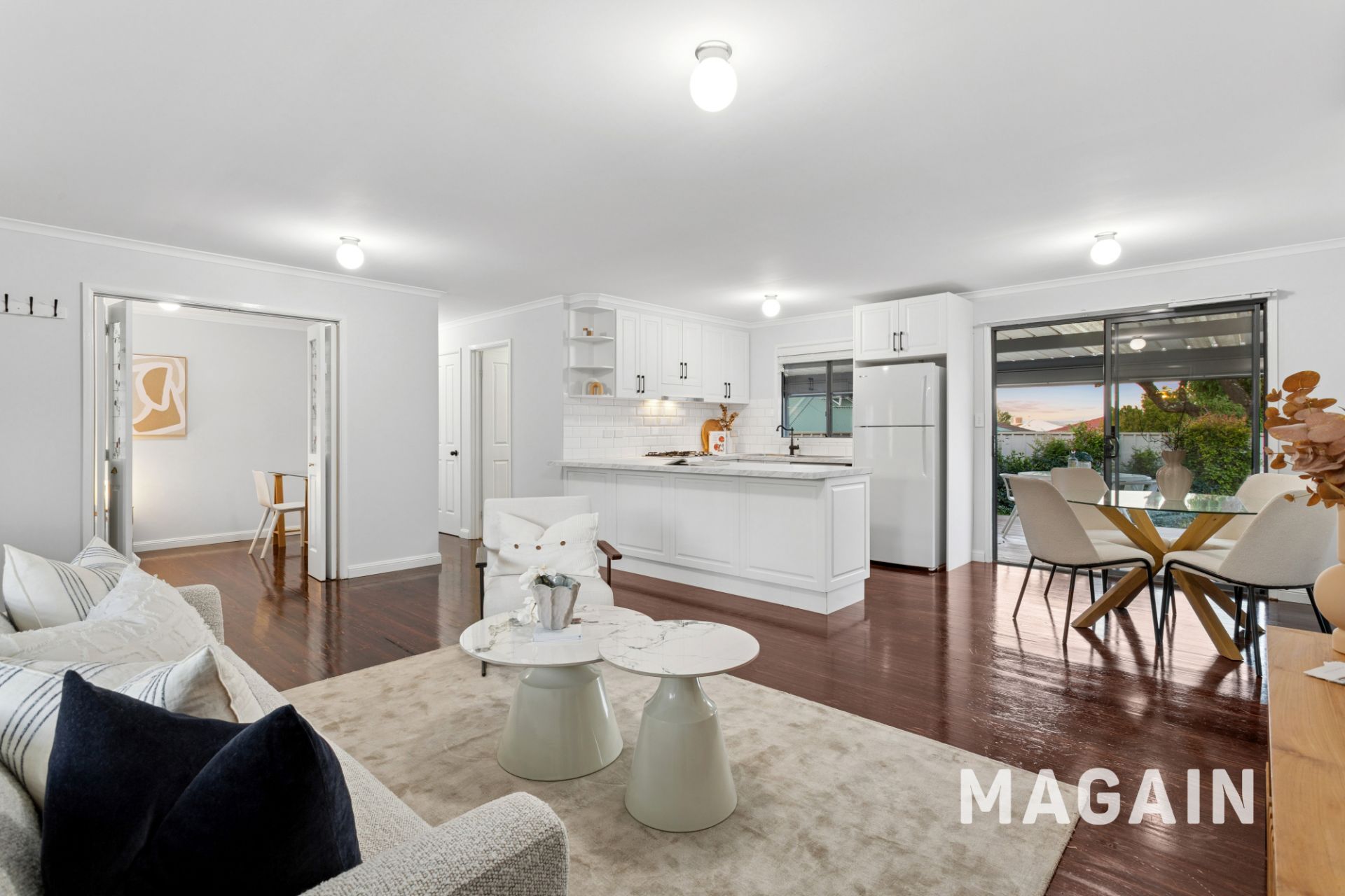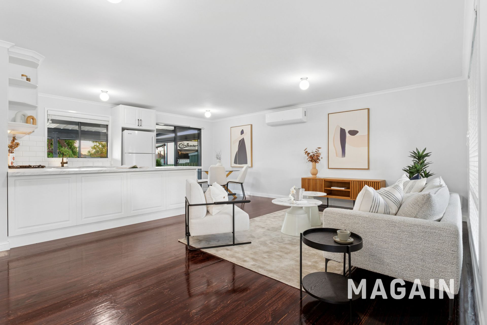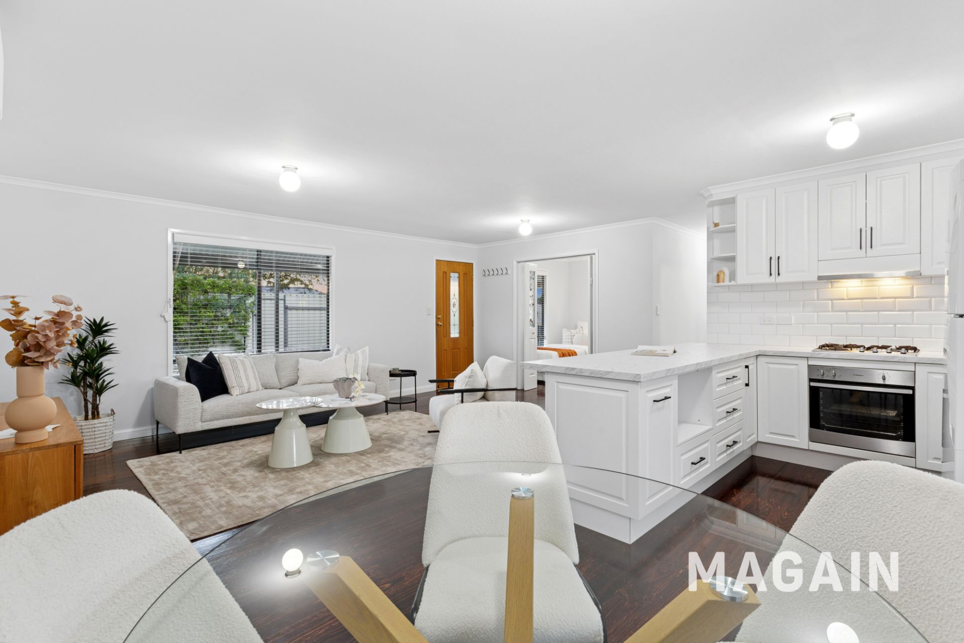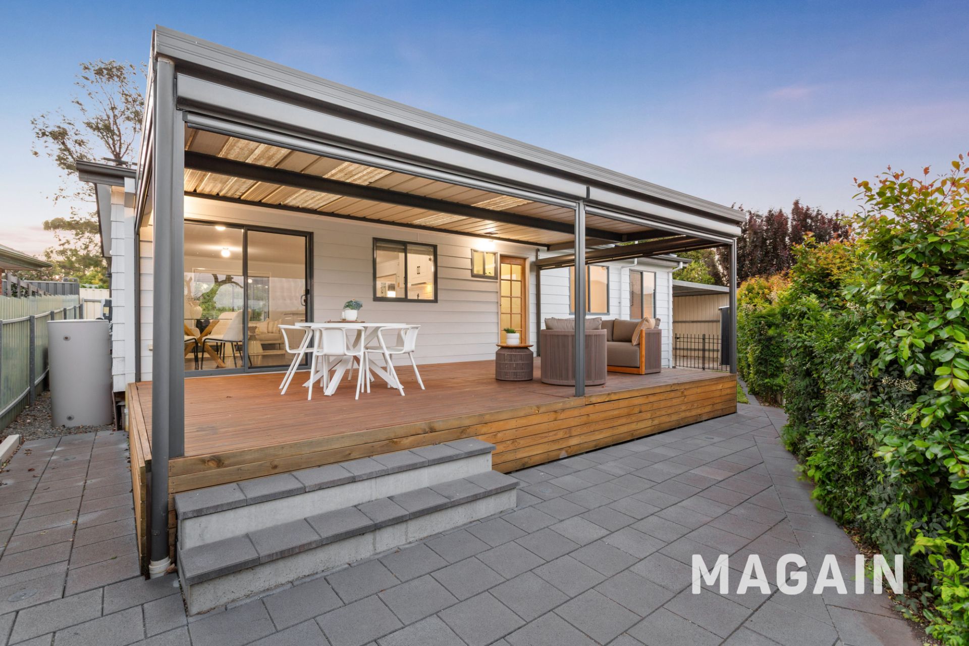 A charming bull-nose verandah and attractive clad exterior set the tone with a courtyard front with near lawn area. Inside you'll find a light-filled open-plan kitchen, dining and living area with warm timber flooring and split-system heating/cooling for year-round comfort. The well-appointed U-shaped kitchen features a gas cooktop, dishwasher, stainless steel double sink, and excellent bench and cupboard space.