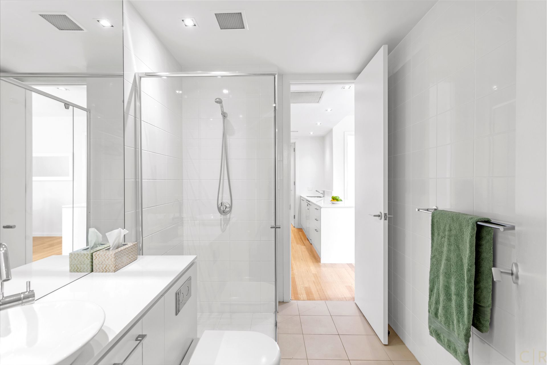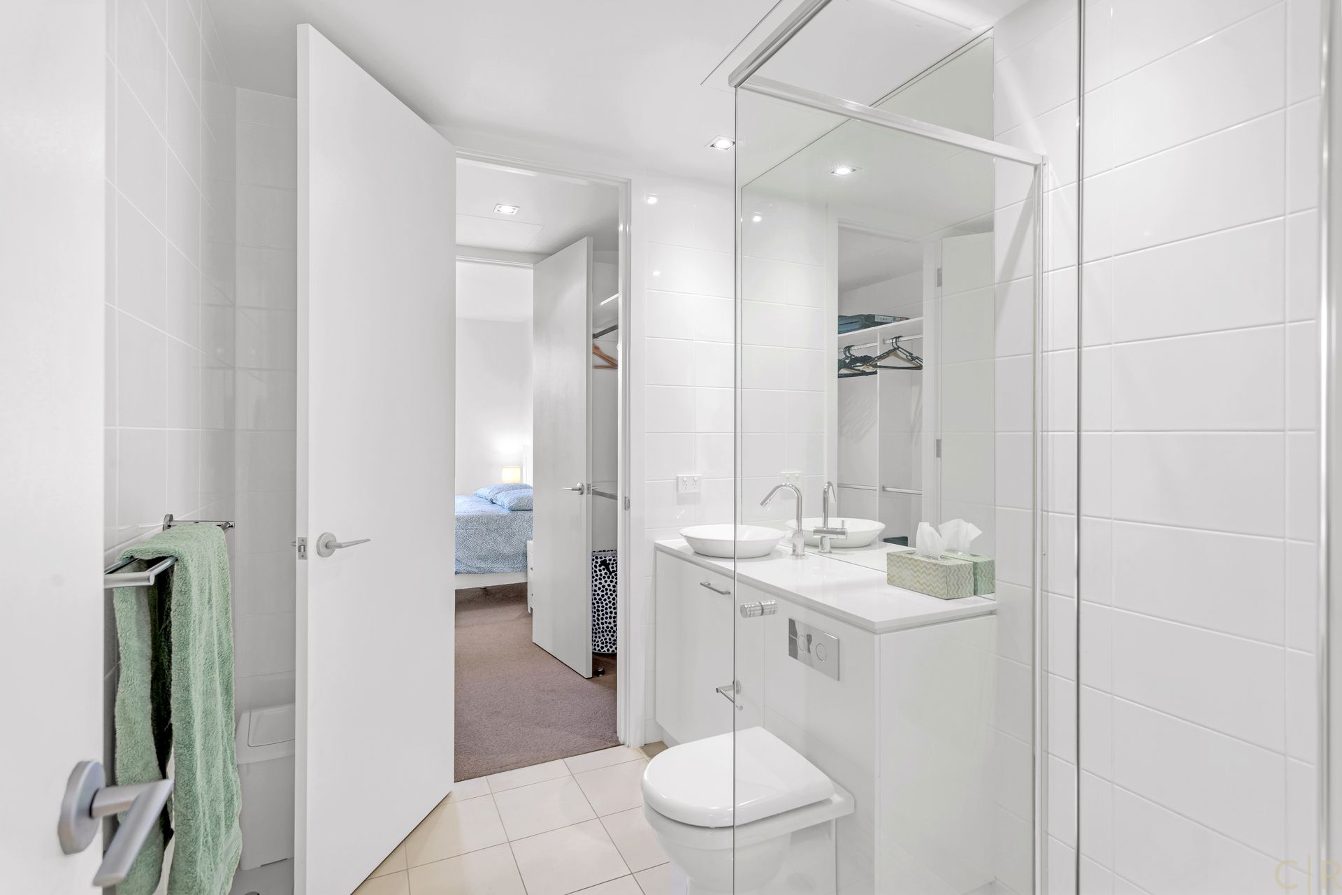 * Sparkling 2 way bathroom with ceiling to floor tiling & separate laundry area