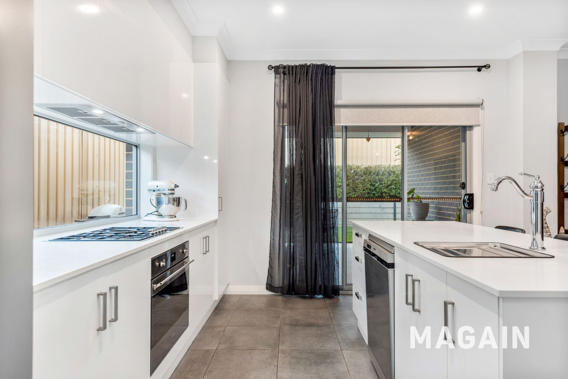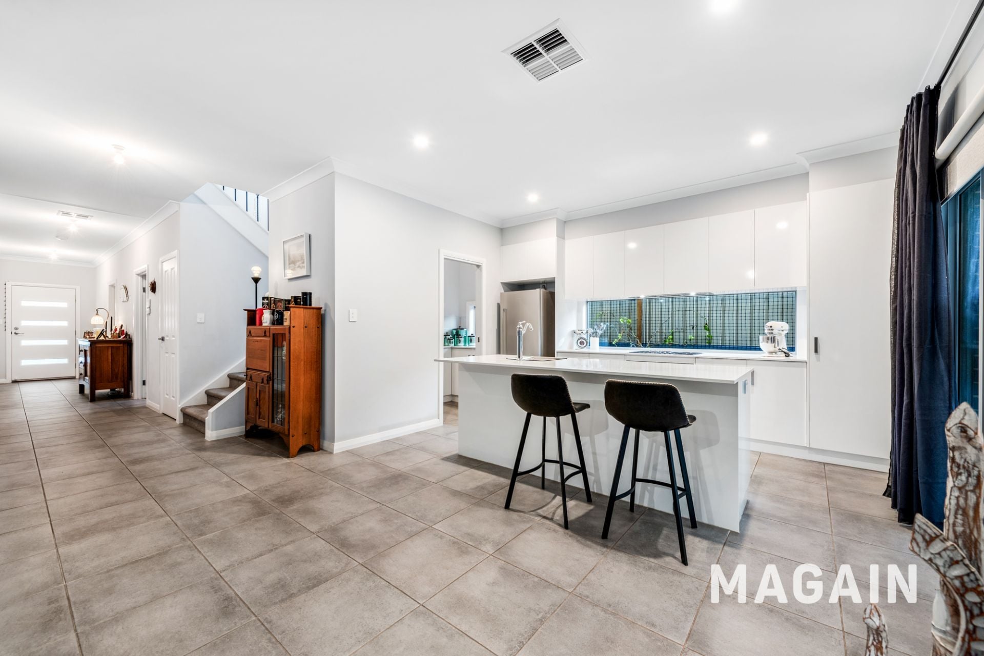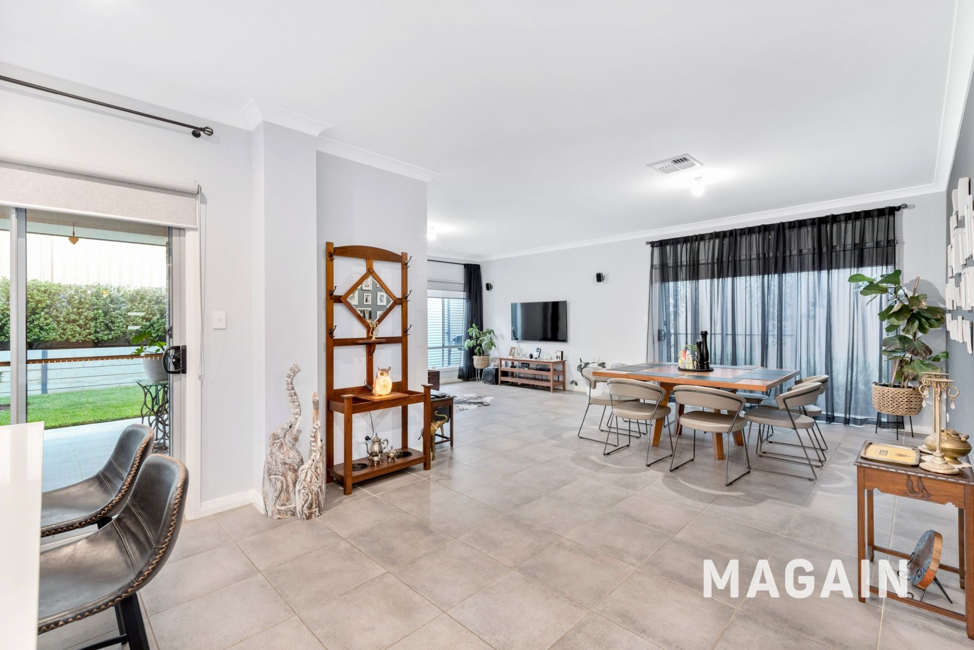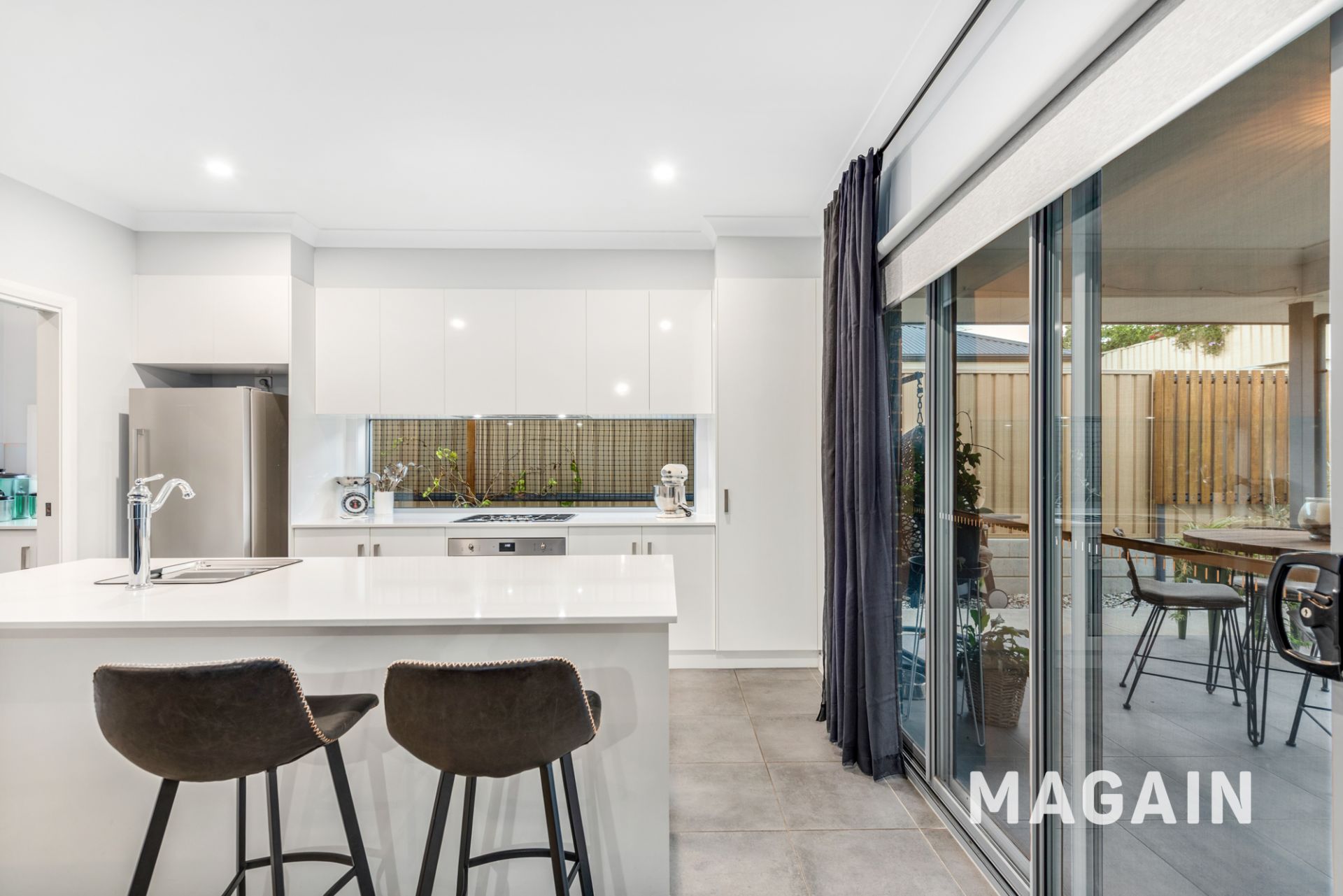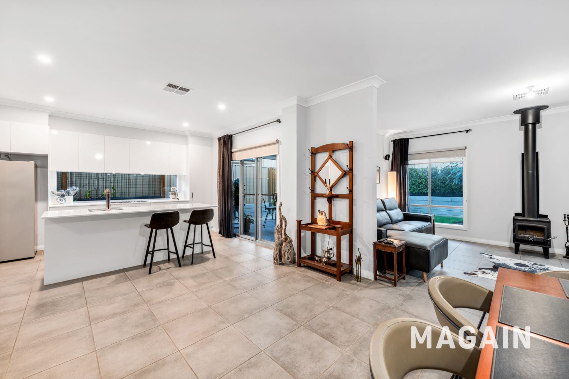 The heart of the home is the light-filled open plan kitchen, meals, and dining area, creating a welcoming space for everyday living and entertaining. The well-appointed kitchen features stone benchtops, quality Smeg appliances, ample cabinetry, and a butler's pantry that provides valuable additional storage and preparation space.