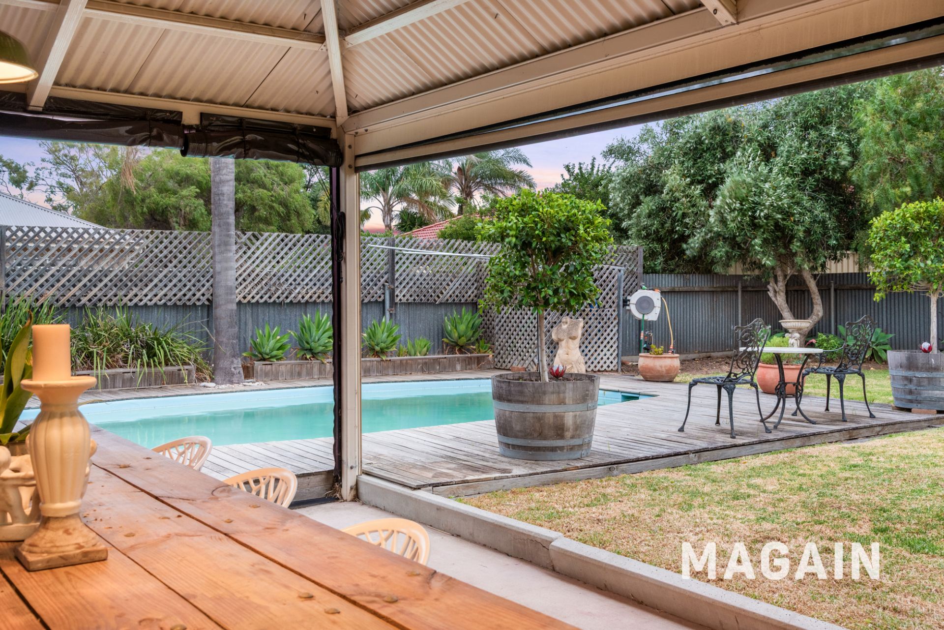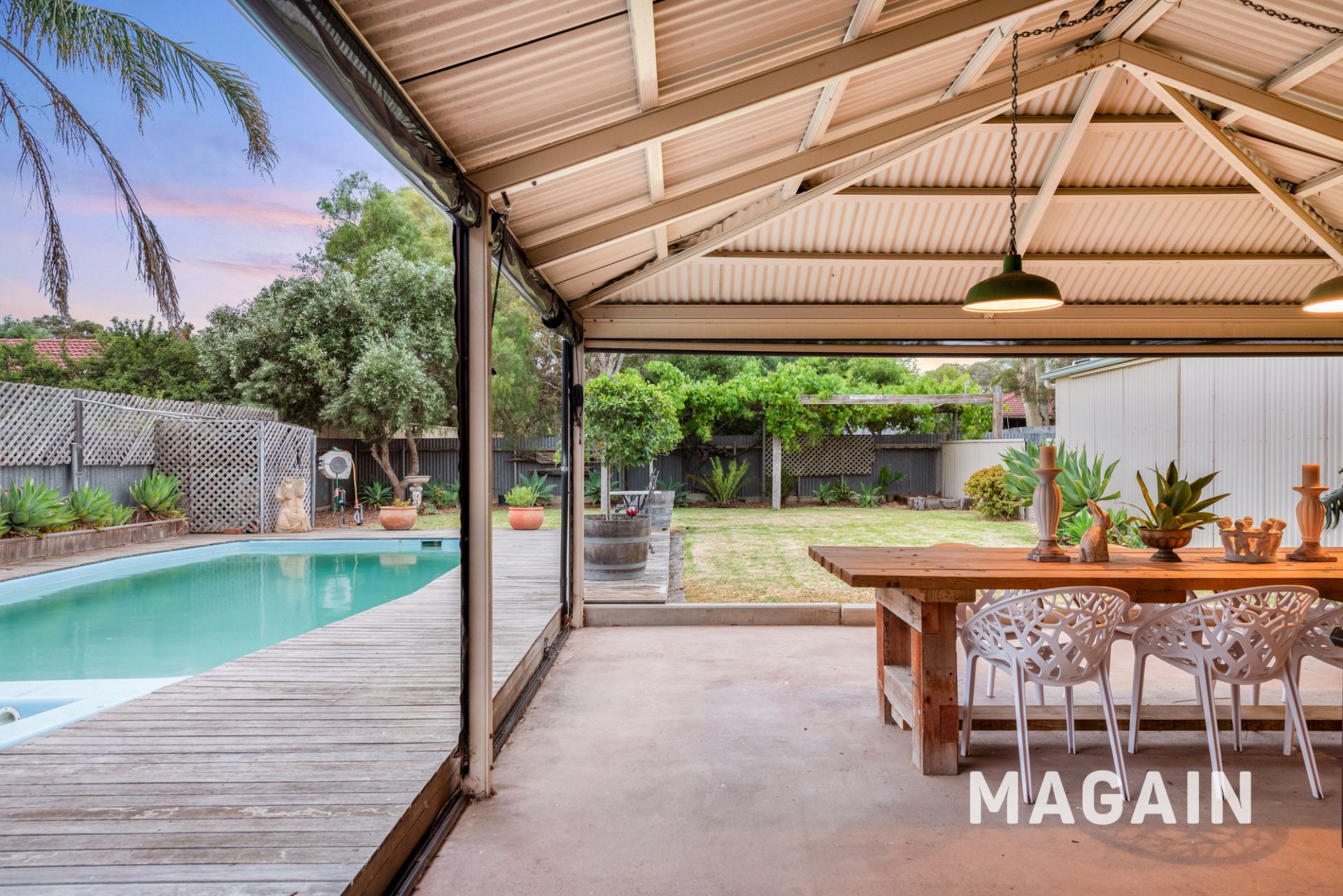 Outdoor living is a standout, with a large enclosed entertaining area complete with café blinds and a combustion heater, creating a true all-seasons space for hosting and relaxing. Beyond, the manicured backyard opens to a sparkling in-ground swimming pool with surrounding decking, generous lawn area and established gardens, offering space for children, pets and entertaining alike.