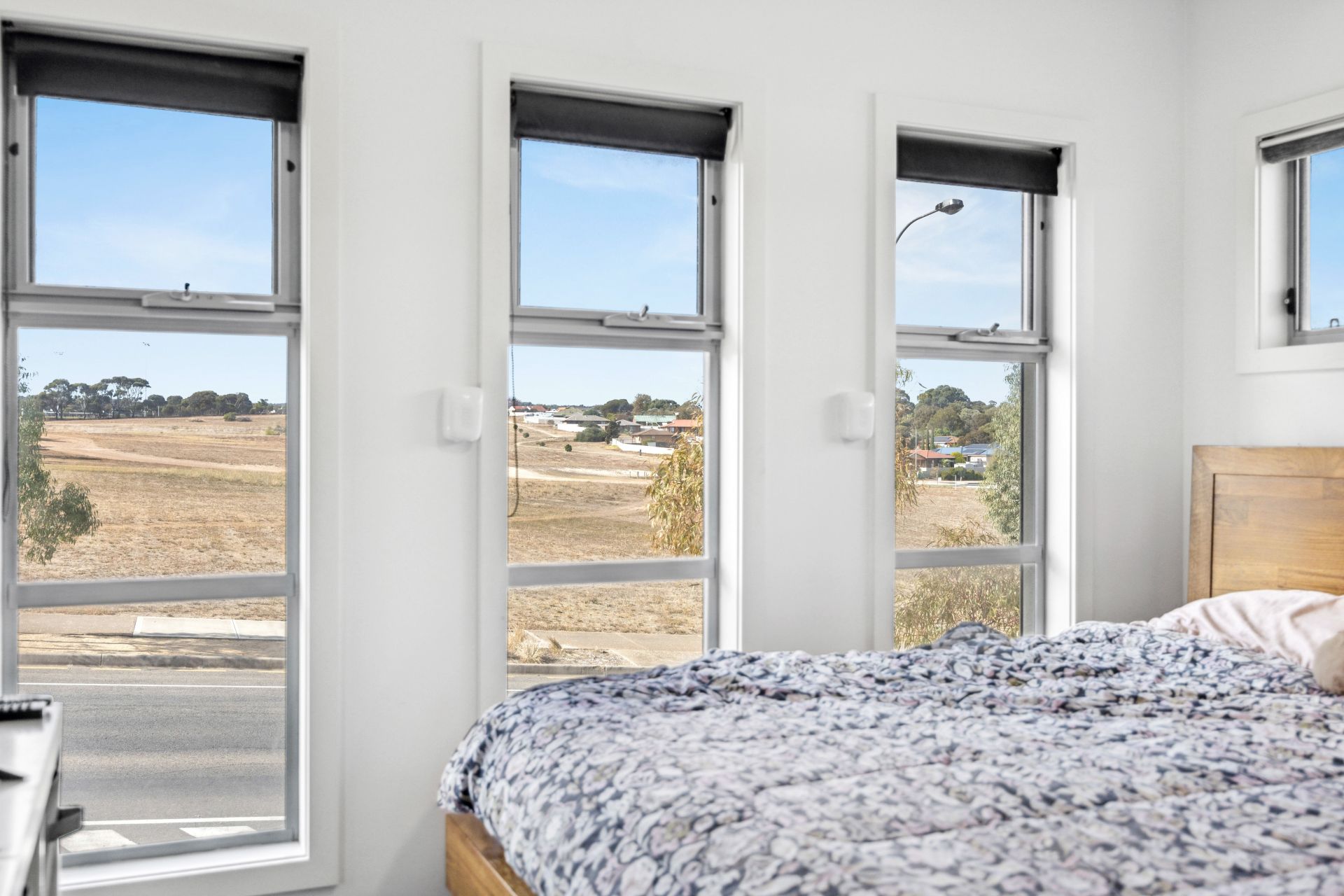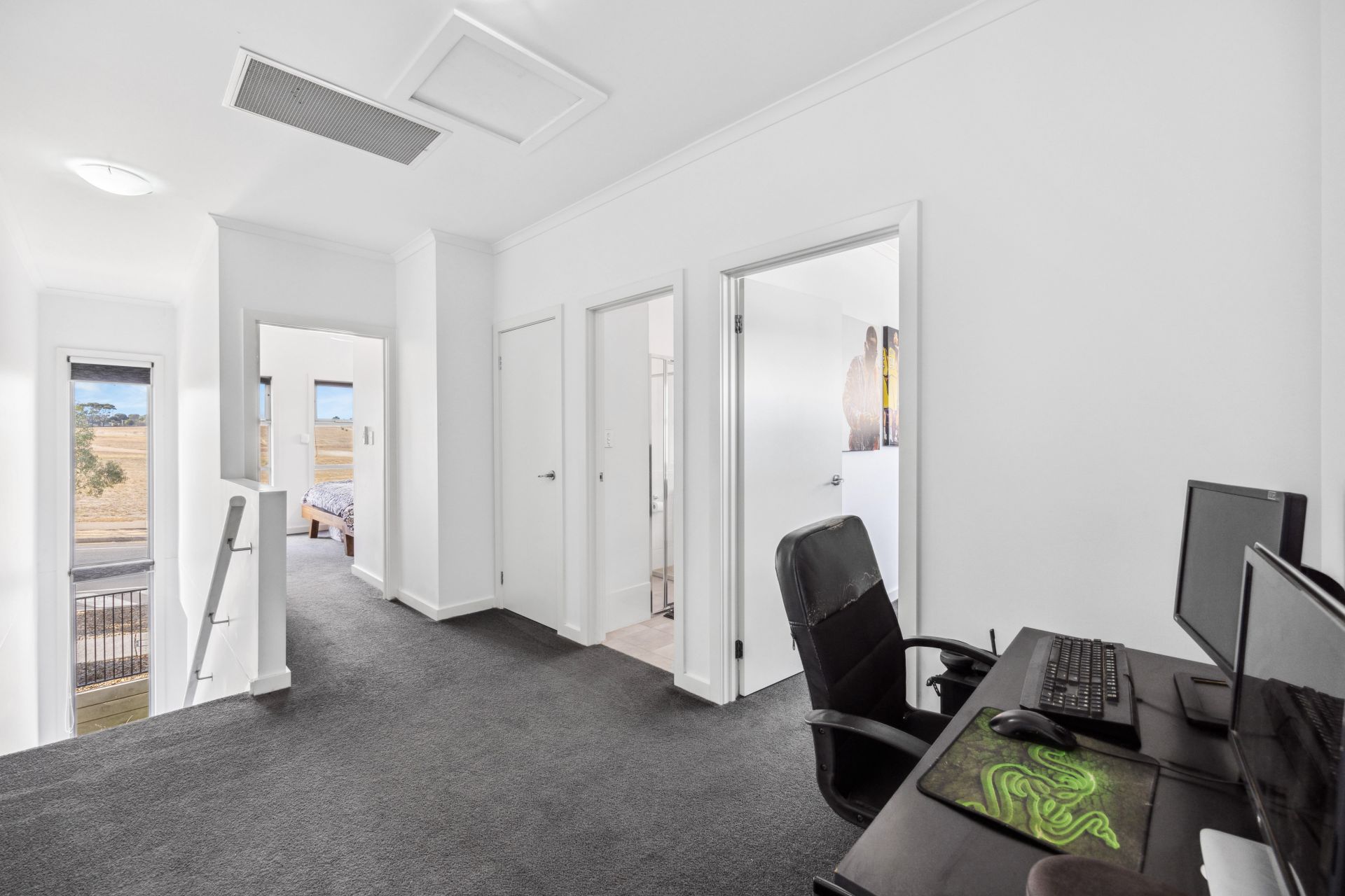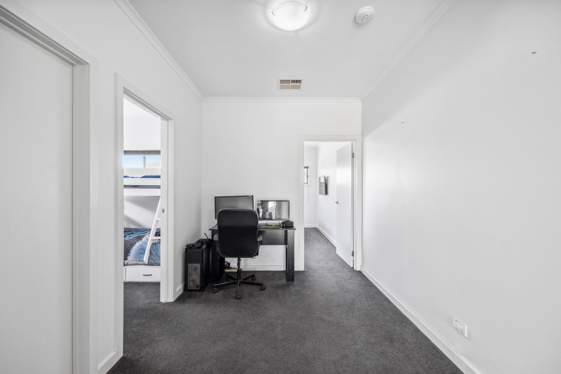 A staircase leads you to the top level of the home where you'll find three bedrooms with comfortable carpet flooring, two well-appointed bathrooms and a second living area/retreat. The master bedroom features a walk-in robe, an ensuite bathroom with a vanity, toilet and shower plus peaceful views over the reserve opposite. Bedrooms two and three are located just a couple of steps away from the main bathroom with a shower, bath, vanity and toilet. Additional features include ducted & zoned reverse cycle air-conditioning for year-round comfort across both levels of the home, 2.7m high ceilings throughout and roller shutters on the main bedroom & living room windows.