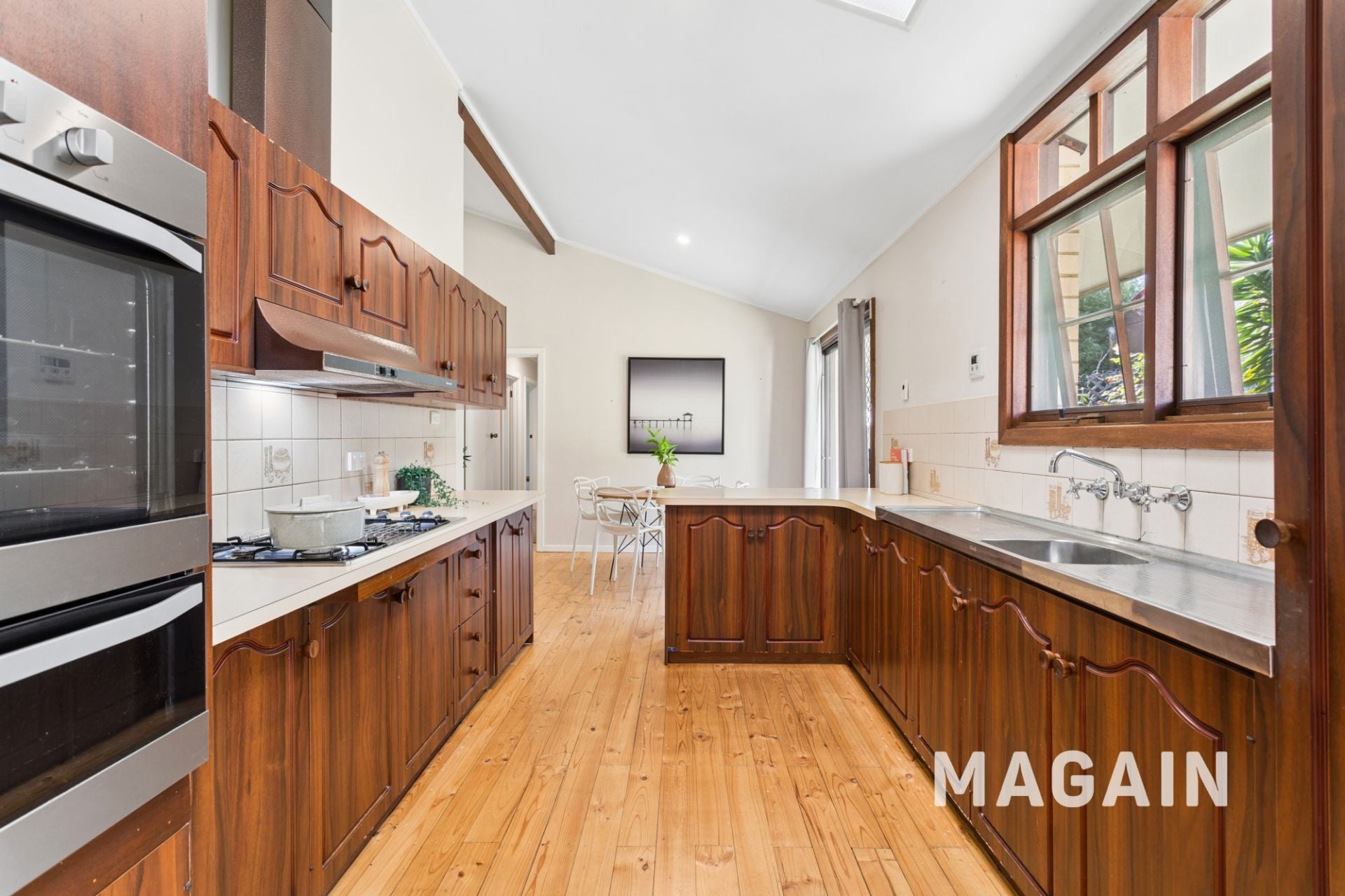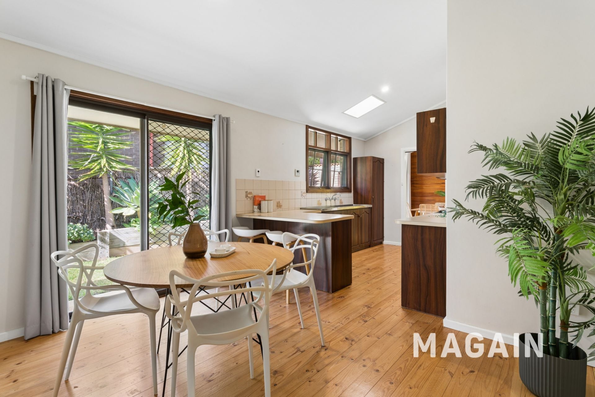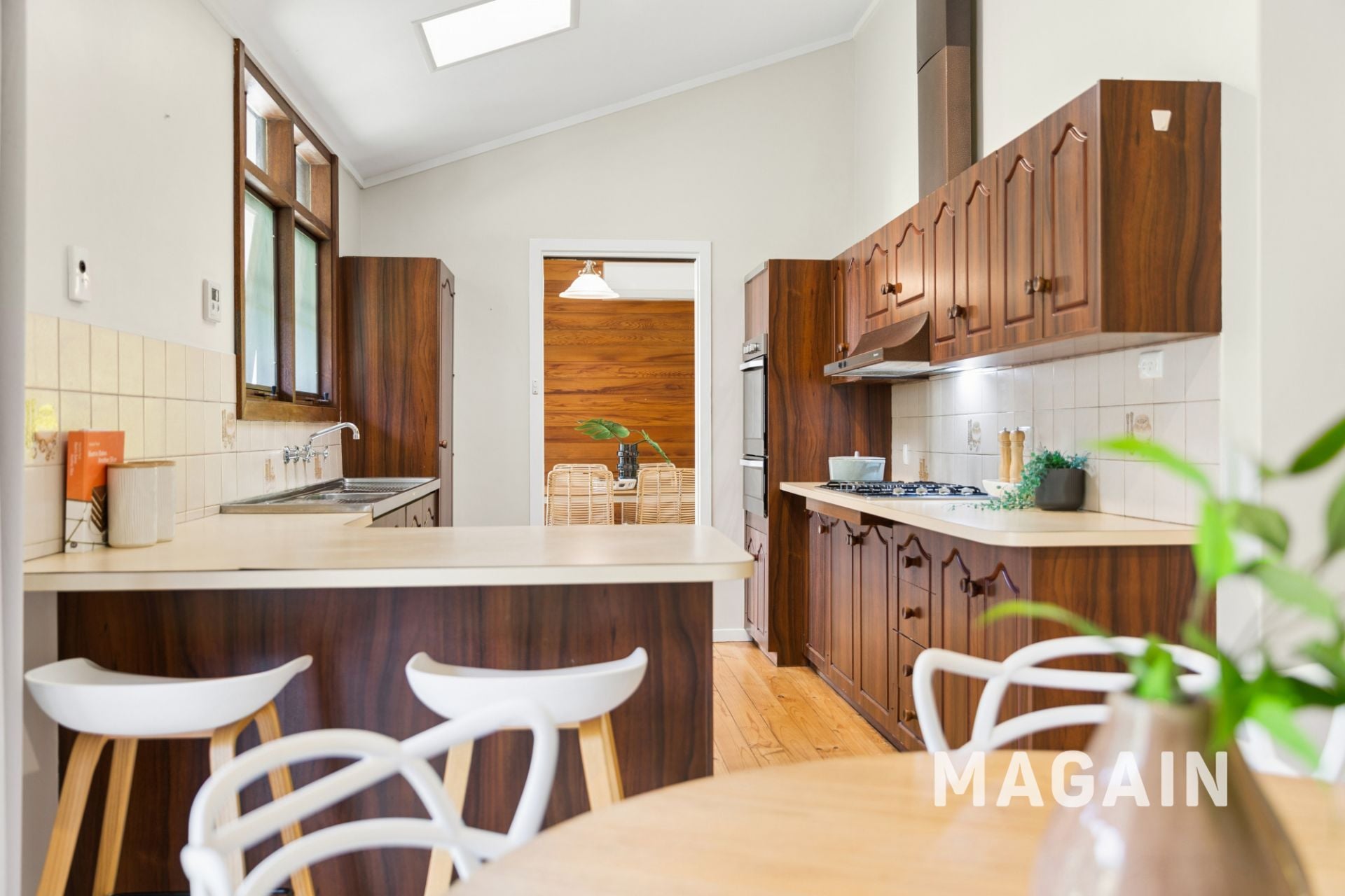 The generous living and dining area offers an open and light-filled space, enhanced by large picture windows that allow natural light to flow throughout. Whether you prefer formal dining or casual meals, the layout caters to both. At the heart of the home, the spacious kitchen is well-appointed with an abundance of cupboard space and gas cooktop, while a skylight above floods the space with natural light, creating a bright and welcoming hub for everyday living.