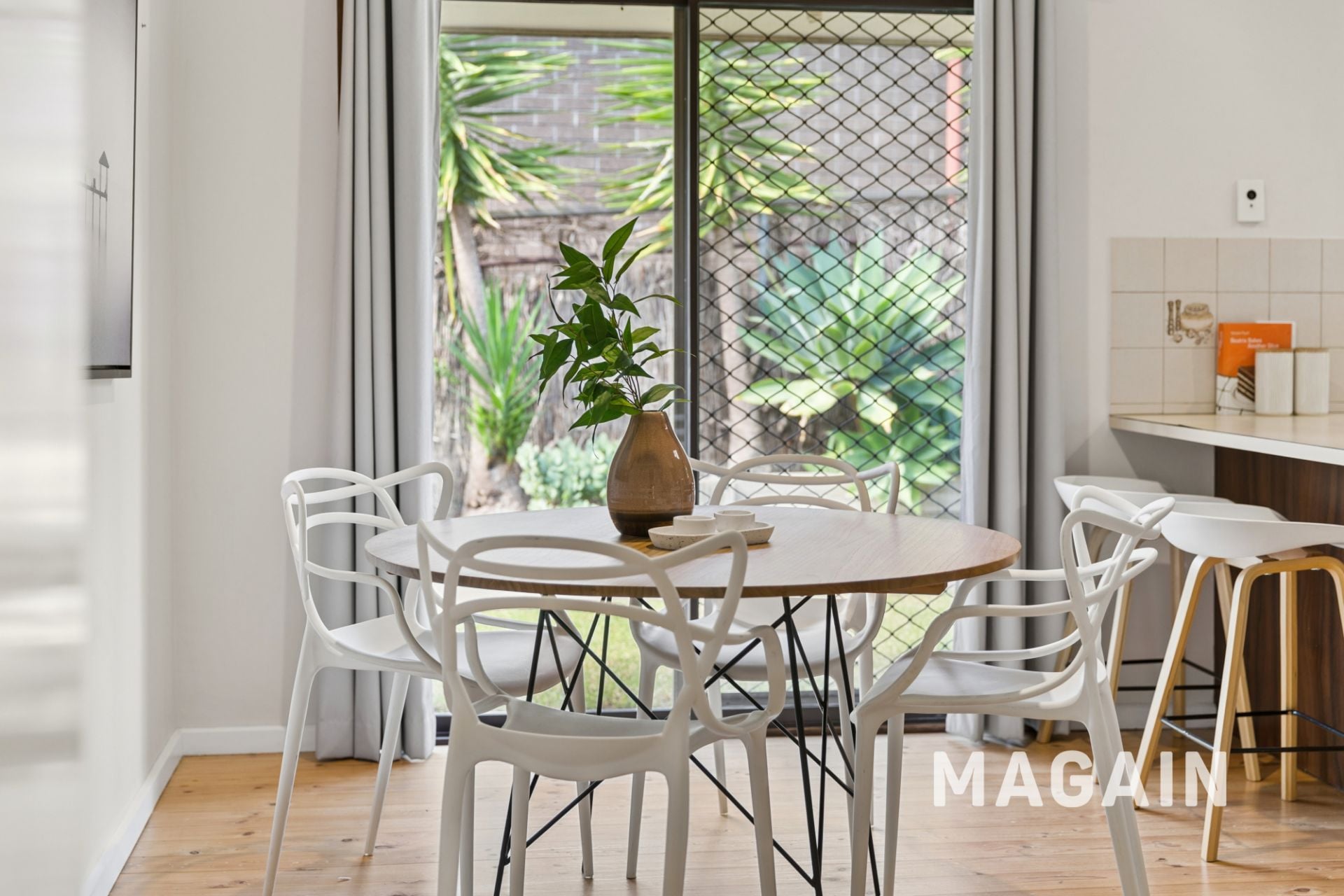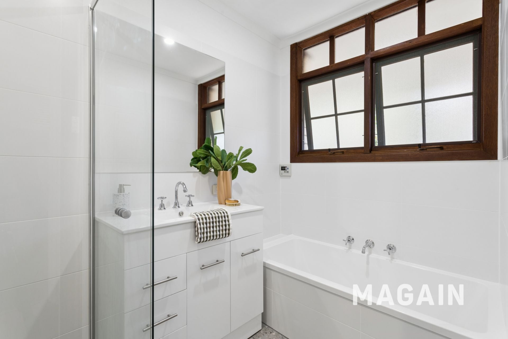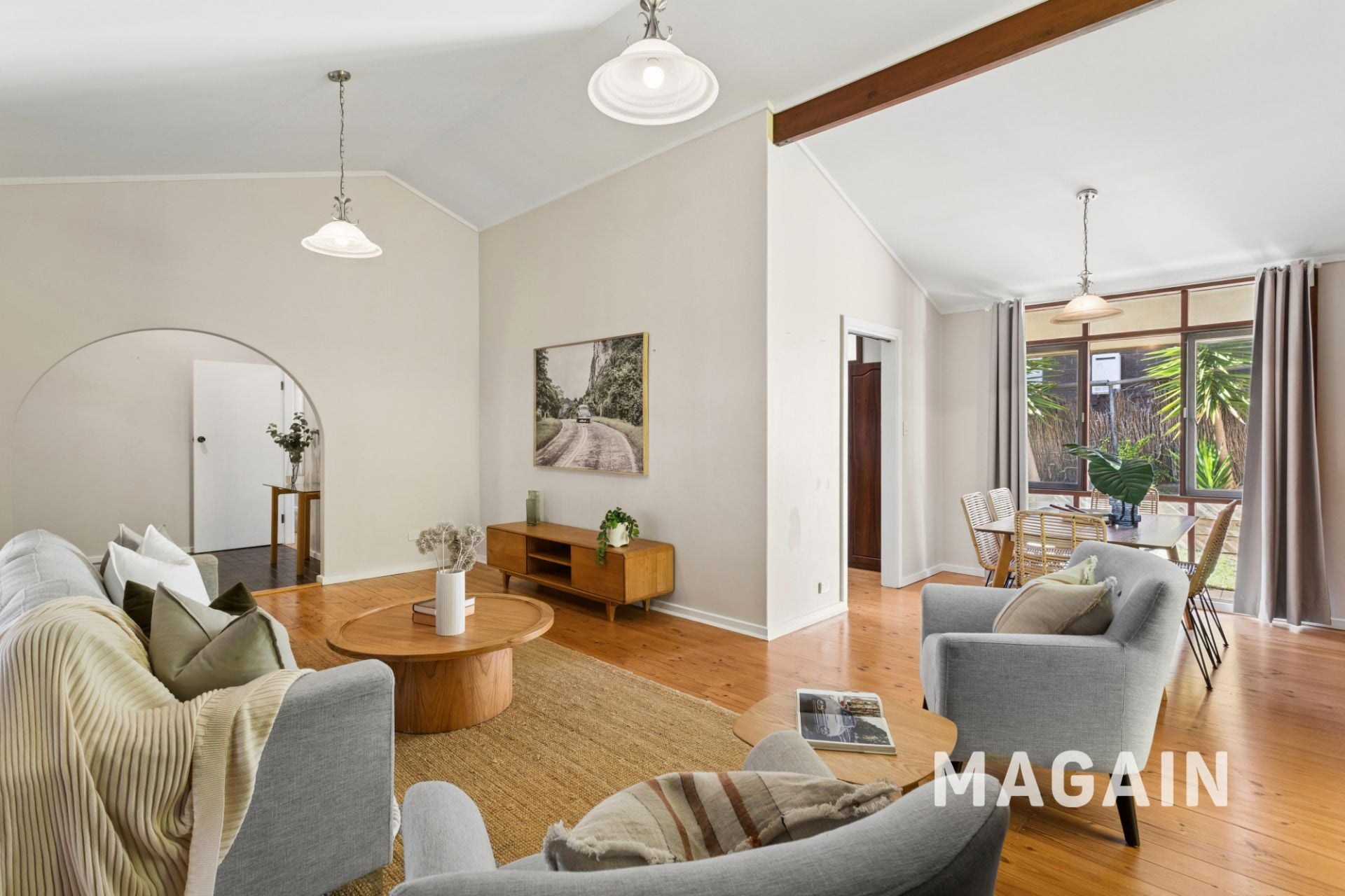 The generous living and dining area offers an open and light-filled space, enhanced by large picture windows that allow natural light to flow throughout. Whether you prefer formal dining or casual meals, the layout caters to both. At the heart of the home, the spacious kitchen is well-appointed with an abundance of cupboard space and gas cooktop, while a skylight above floods the space with natural light, creating a bright and welcoming hub for everyday living.