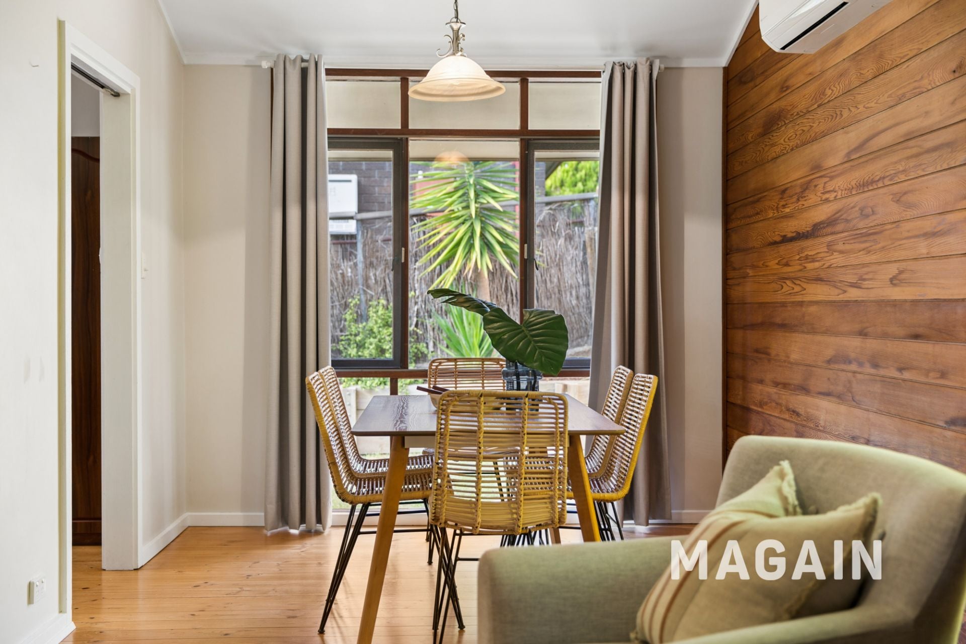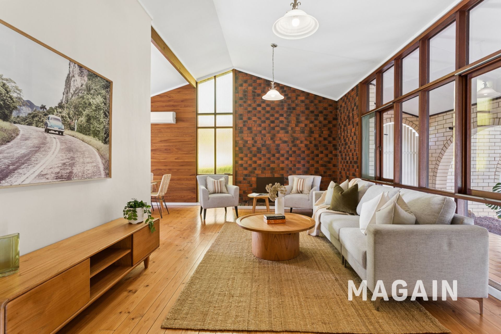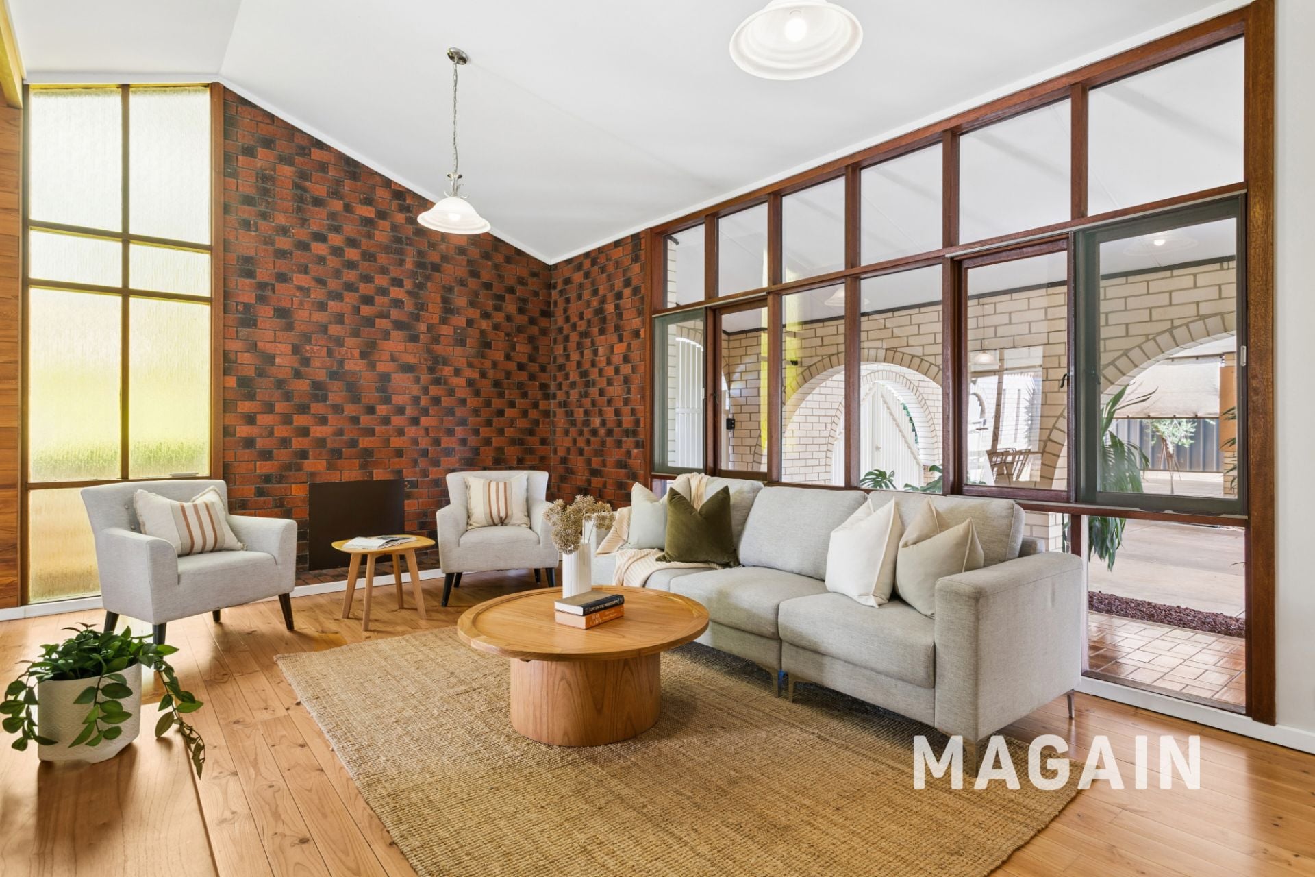 Tucked away from the street, the home provides a sense of privacy and security, with attractive kerbside appeal welcoming you via a double driveway, perfect for off-street parking, leading to two secure carport spaces. Step inside to a spacious foyer, where lofty ceilings enhance the sense of openness, while the exposed brick wall and rich wood panelling create a warm, inviting first impression that instantly feels like home.