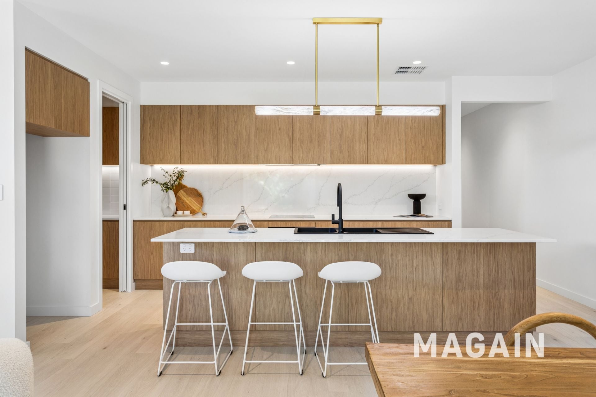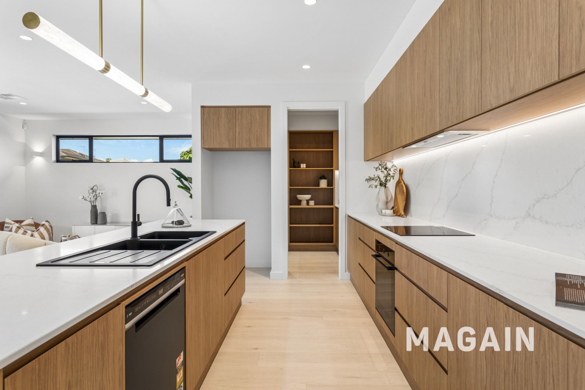 The designer kitchen is a true standout, featuring a striking stone benchtop and matching splashback, quality appliances including an induction cooktop and dishwasher, a spacious walk in pantry, and stylish pendant lighting over the island bench.