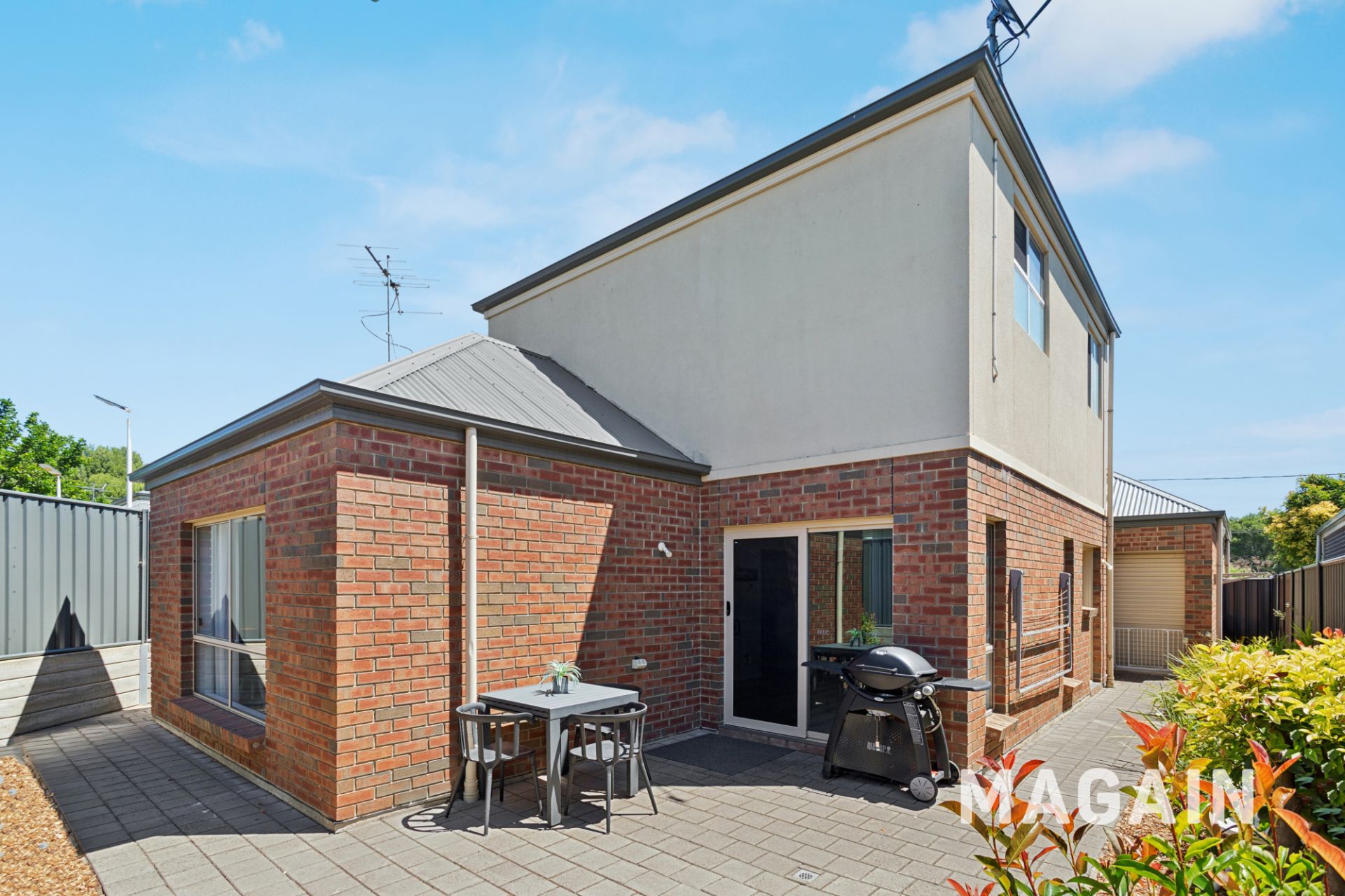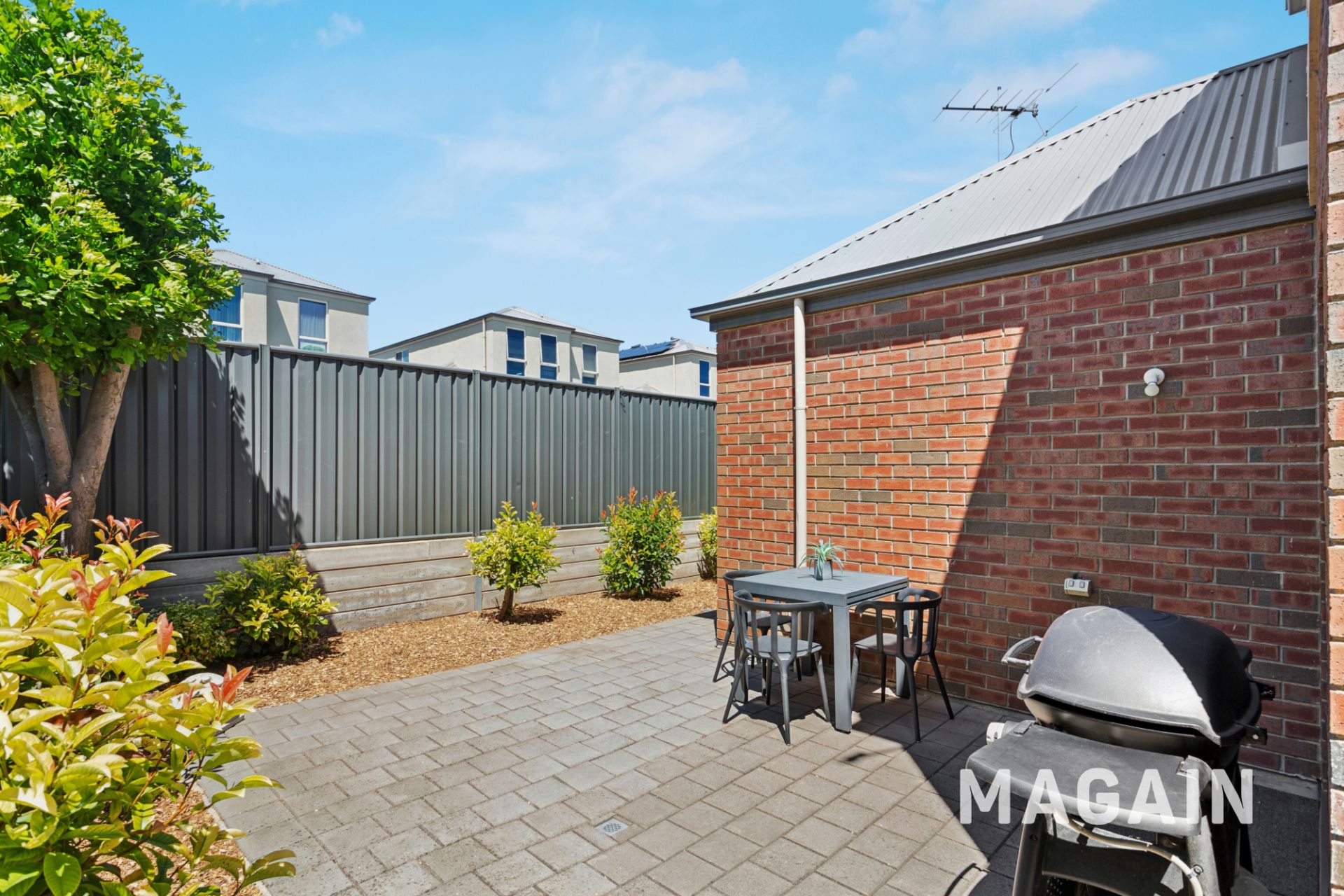 Stepping outside, the low-maintenance rear courtyard is paved and framed by neat garden beds, offering a private setting for outdoor enjoyment without the upkeep. A rainwater tank supports sustainable living, and a storage shed provides further convenience.