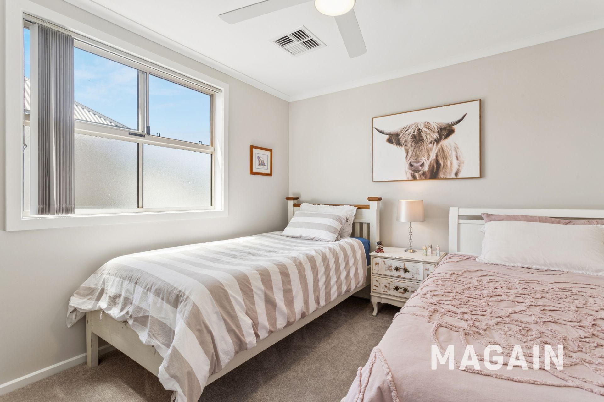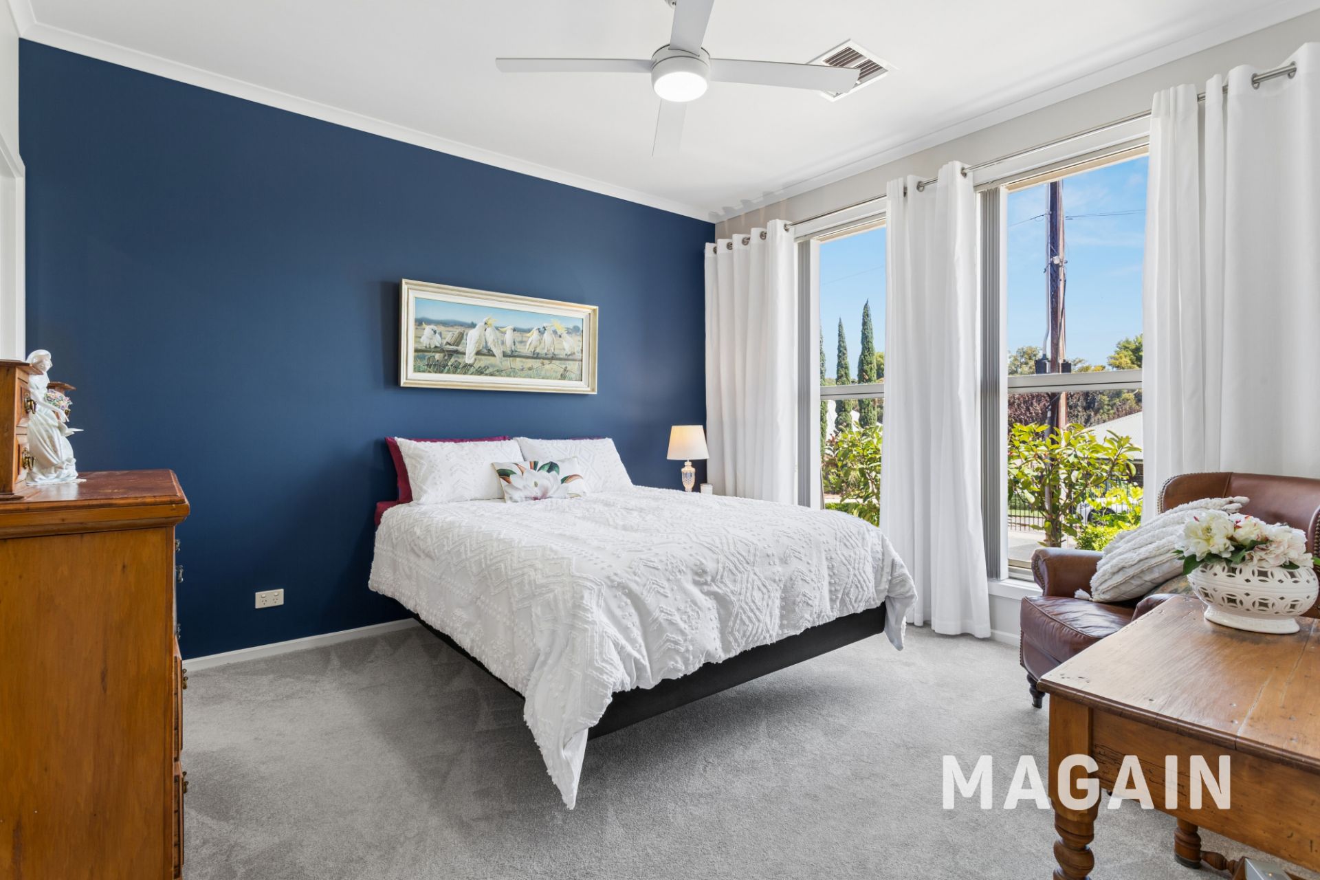 Upstairs, bedrooms two and three are well-proportioned, each featuring built-in robes and ceiling fans. A central main bathroom services this level, complete with a shower, bath, and toilet.