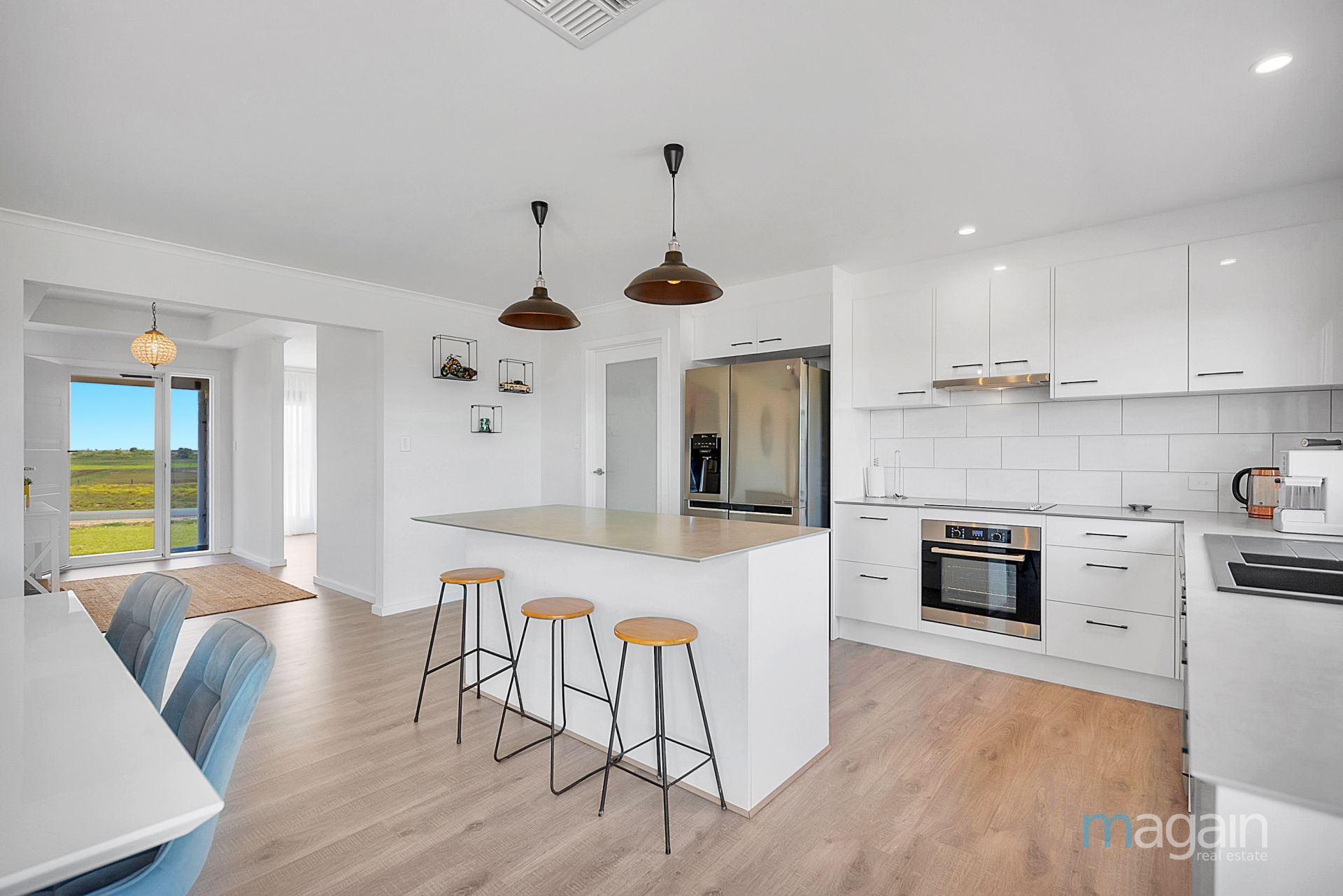 The kitchen includes island breakfast bar, stainless steel appliances, electric cook-top, soft close cupboards and doors with plenty of cabinetry.