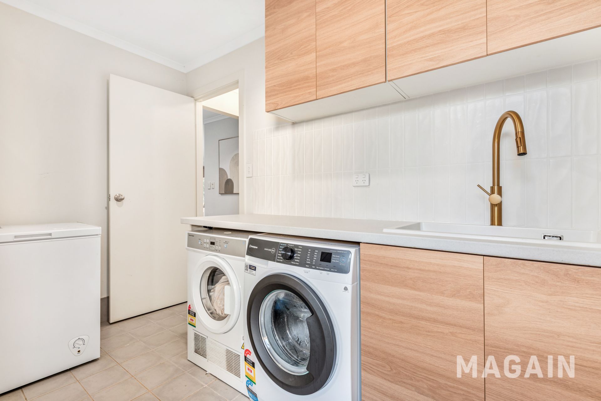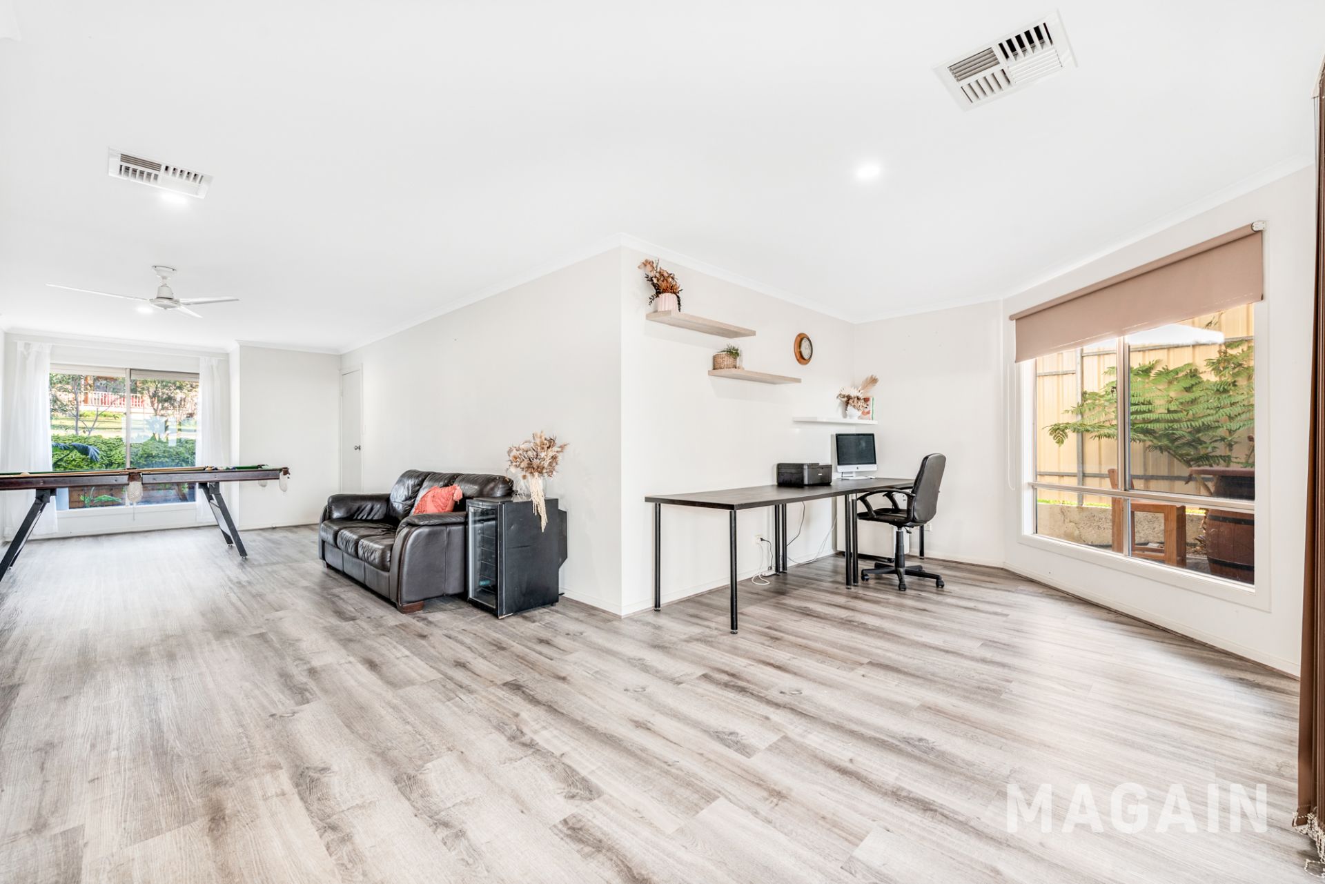 Downstairs, two additional bedrooms are complemented by a large rumpus room, an ideal retreat for teenagers, guests, or a second living area. There's also a dedicated study/office, laundry with built-in storage, and a second bathroom. The lower level connects seamlessly to the outdoor entertaining area a private, covered space that flows onto a beautifully manicured yard framed by established gardens, a lush lawn area, and a variety of established fruit trees.