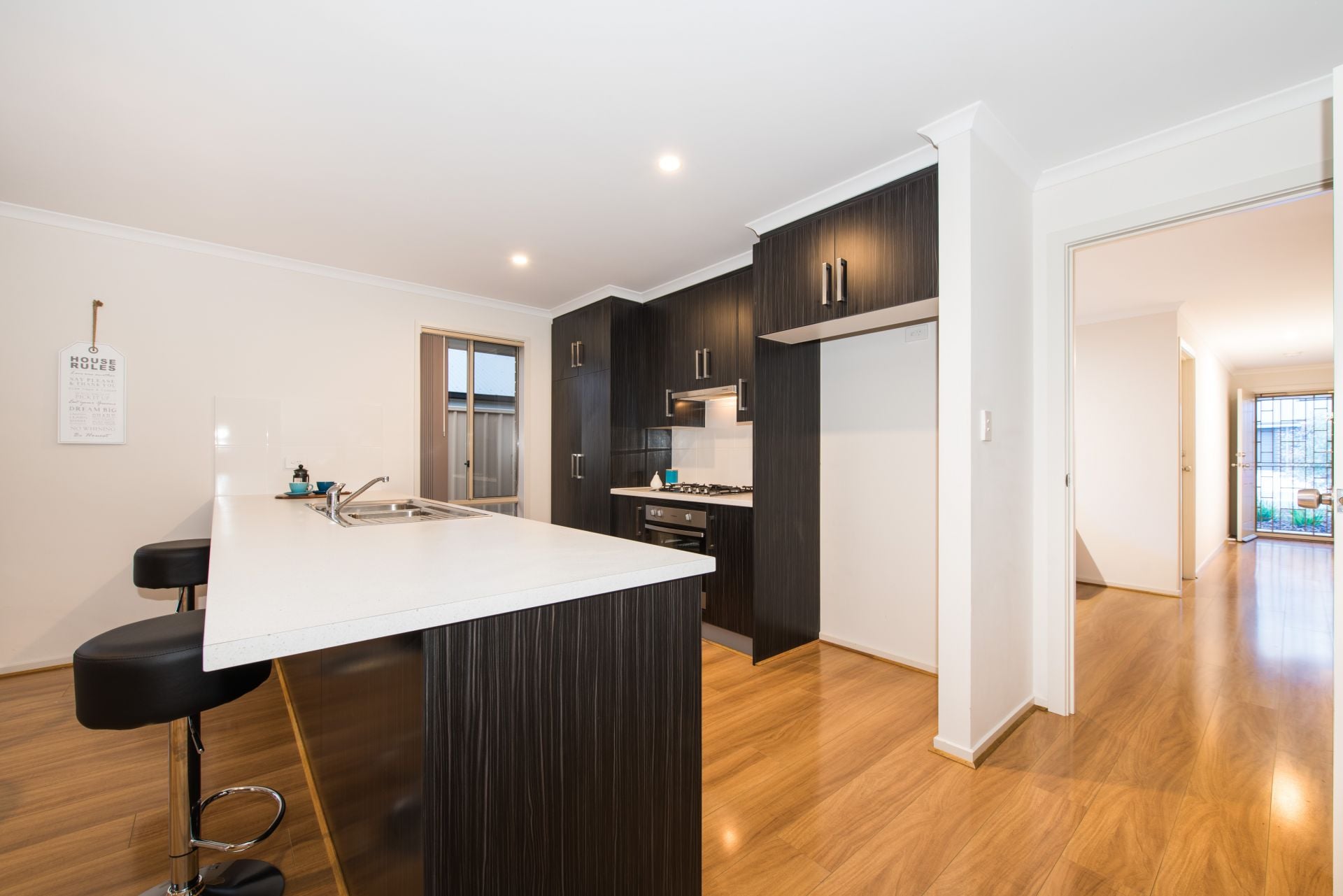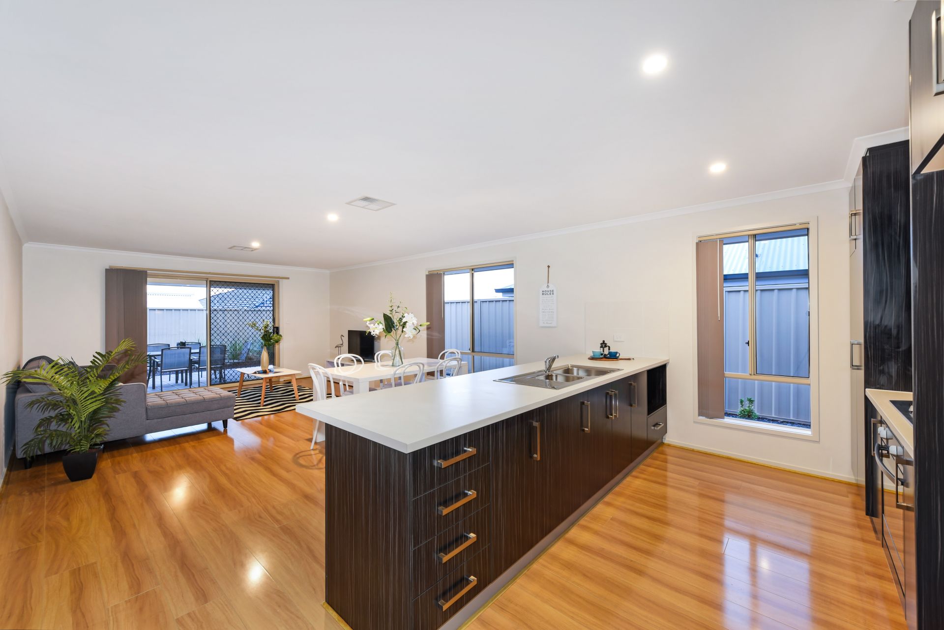 > open kitchen area with ample bench and cupboard space and over looks the meals and family room