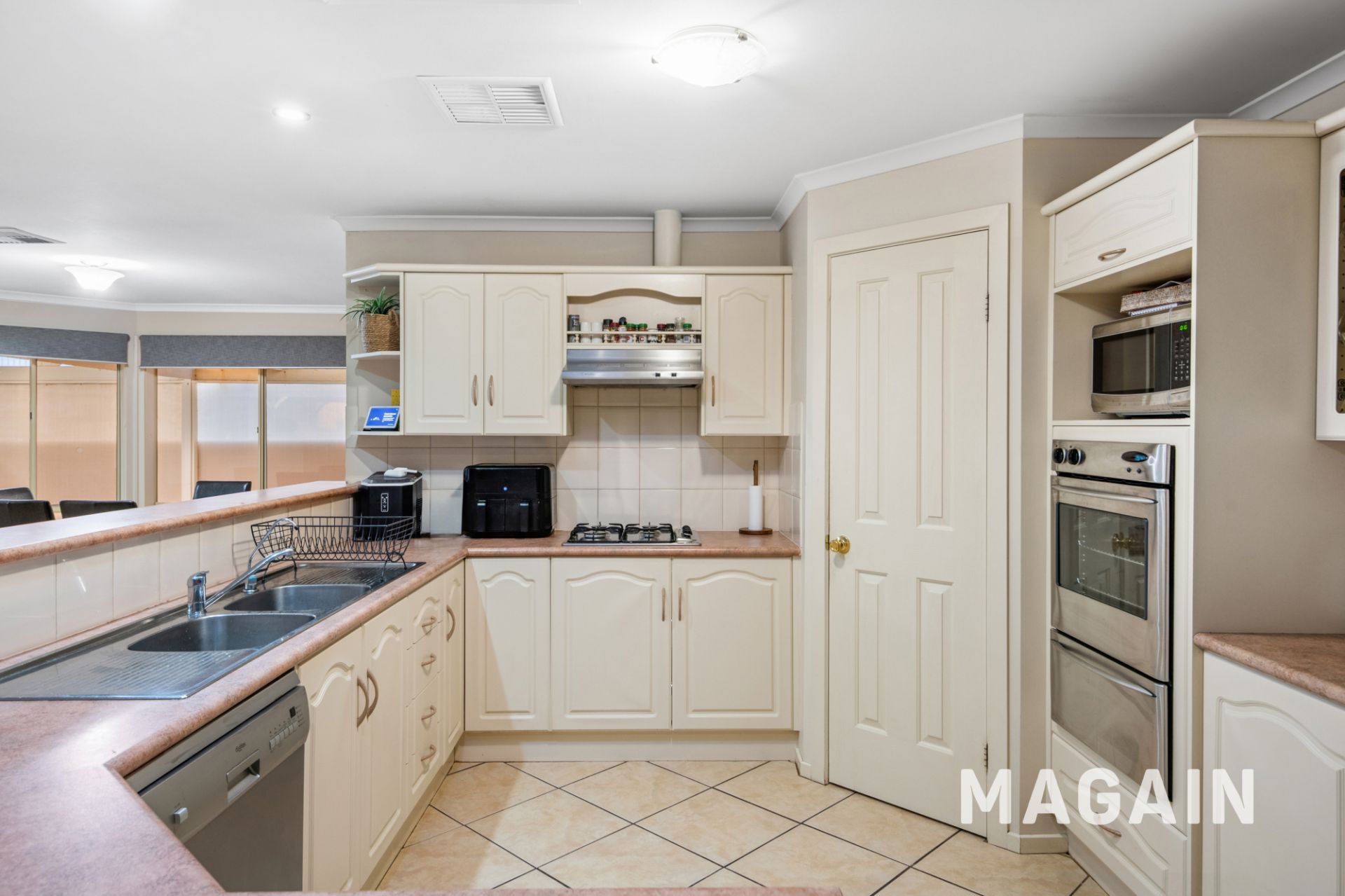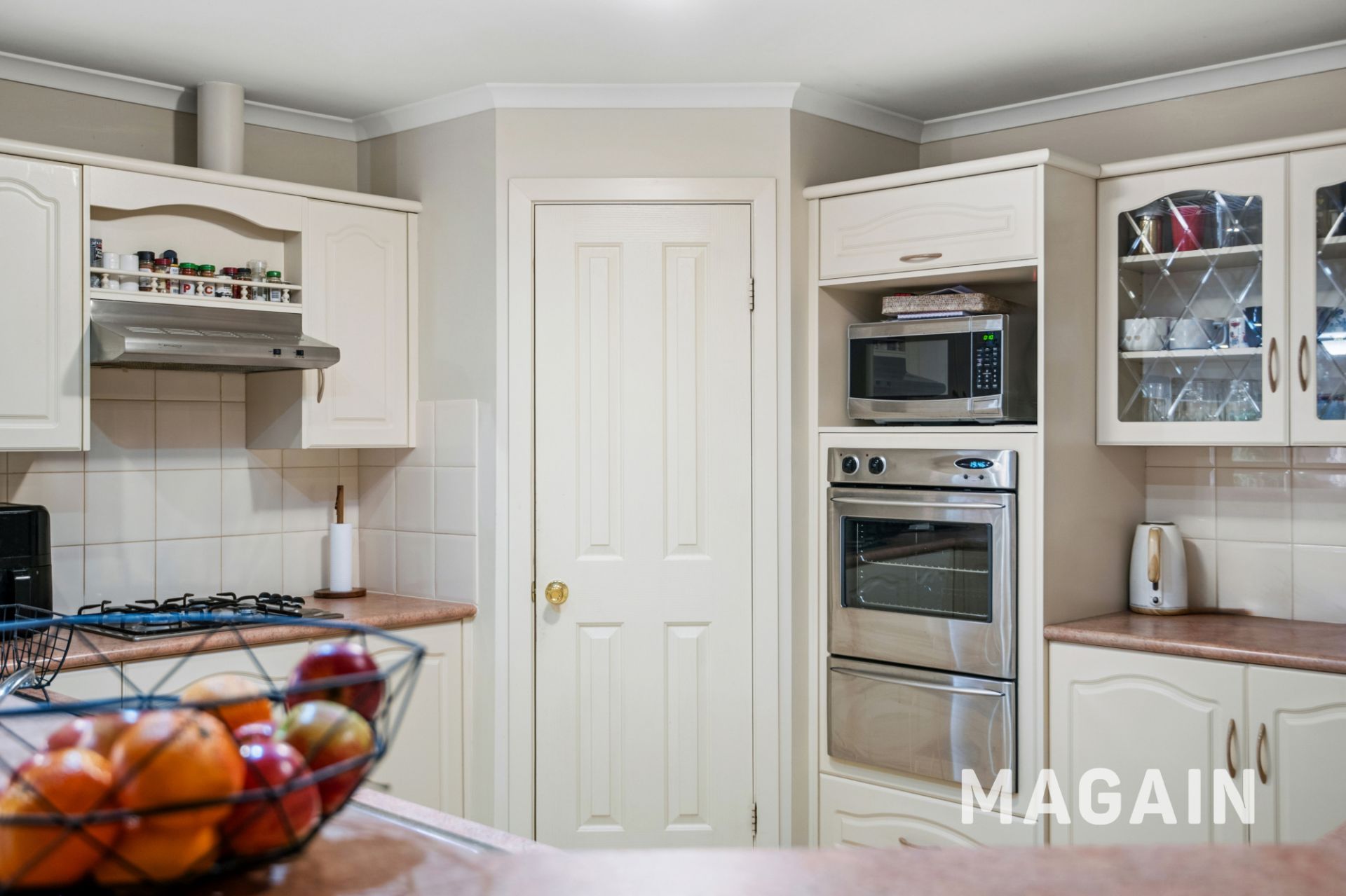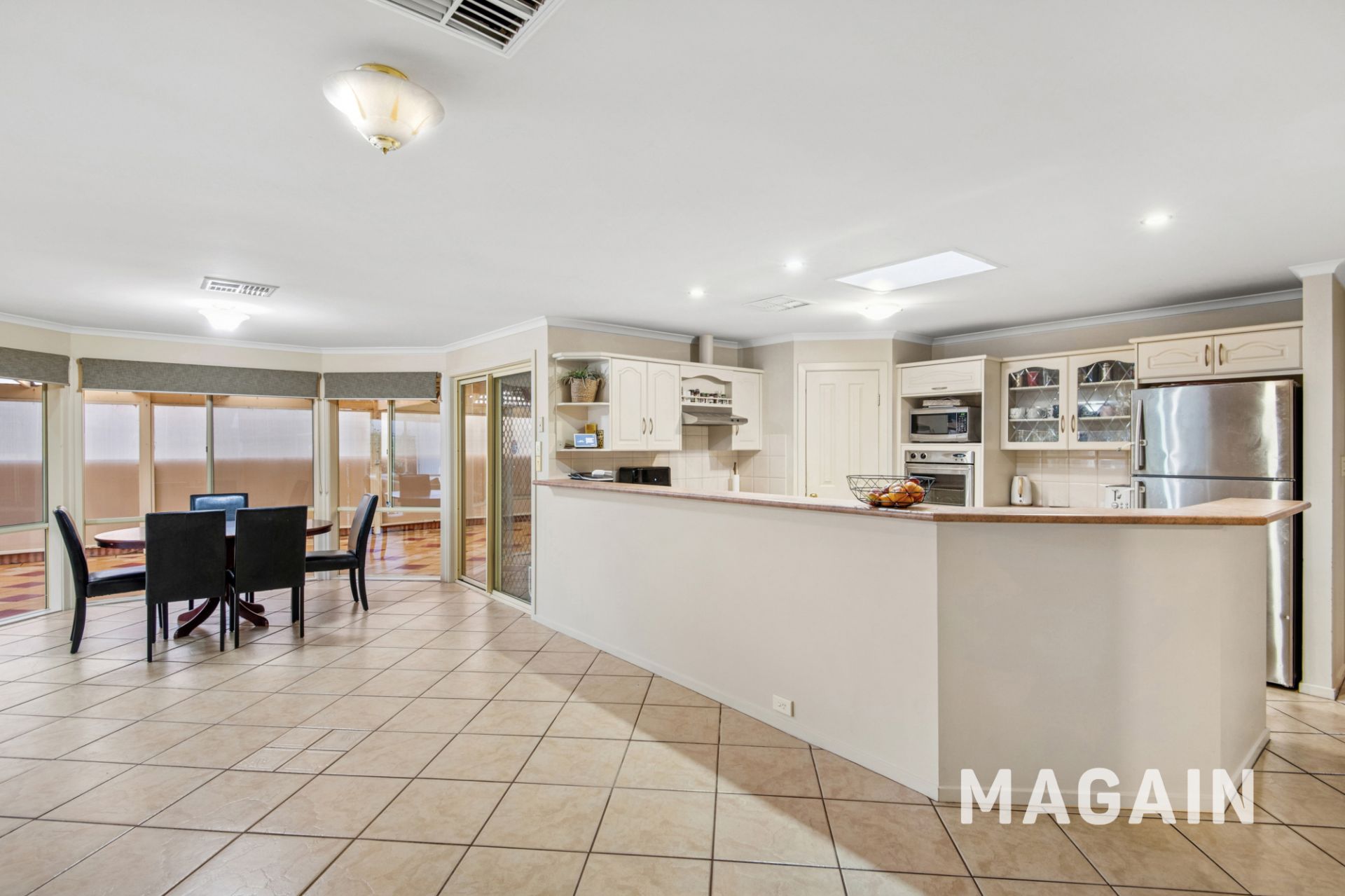 At the heart of the home, the large kitchen offering ample storage including corner pantry, gas cook top, dishwasher and a breakfast bar overlooking the dining and family zones, creating an easy hub for daily life or entertaining. Comfort is assured year-round with ducted reverse-cycle air conditioning, ceiling fans throughout, and the energy efficiency of solar panels adding valuable long-term savings.