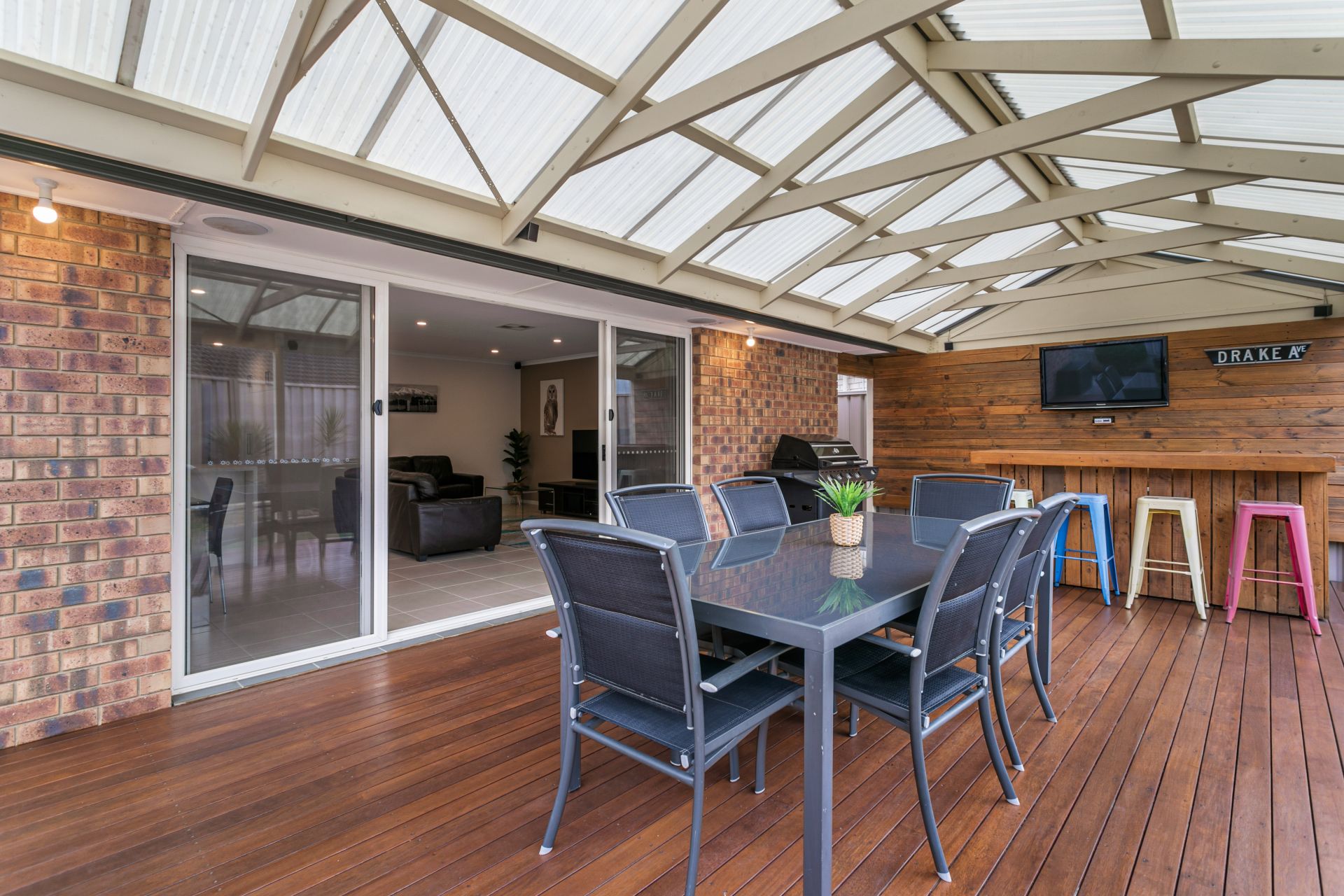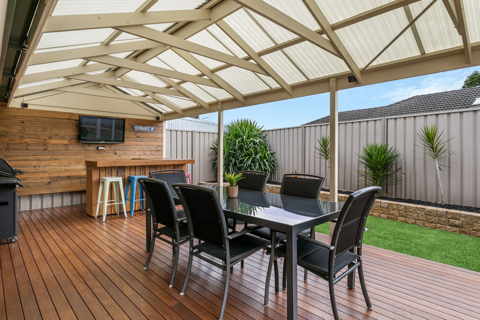 - Outdoor undercover entertaining area with gabled roof, quality decking and built in bar