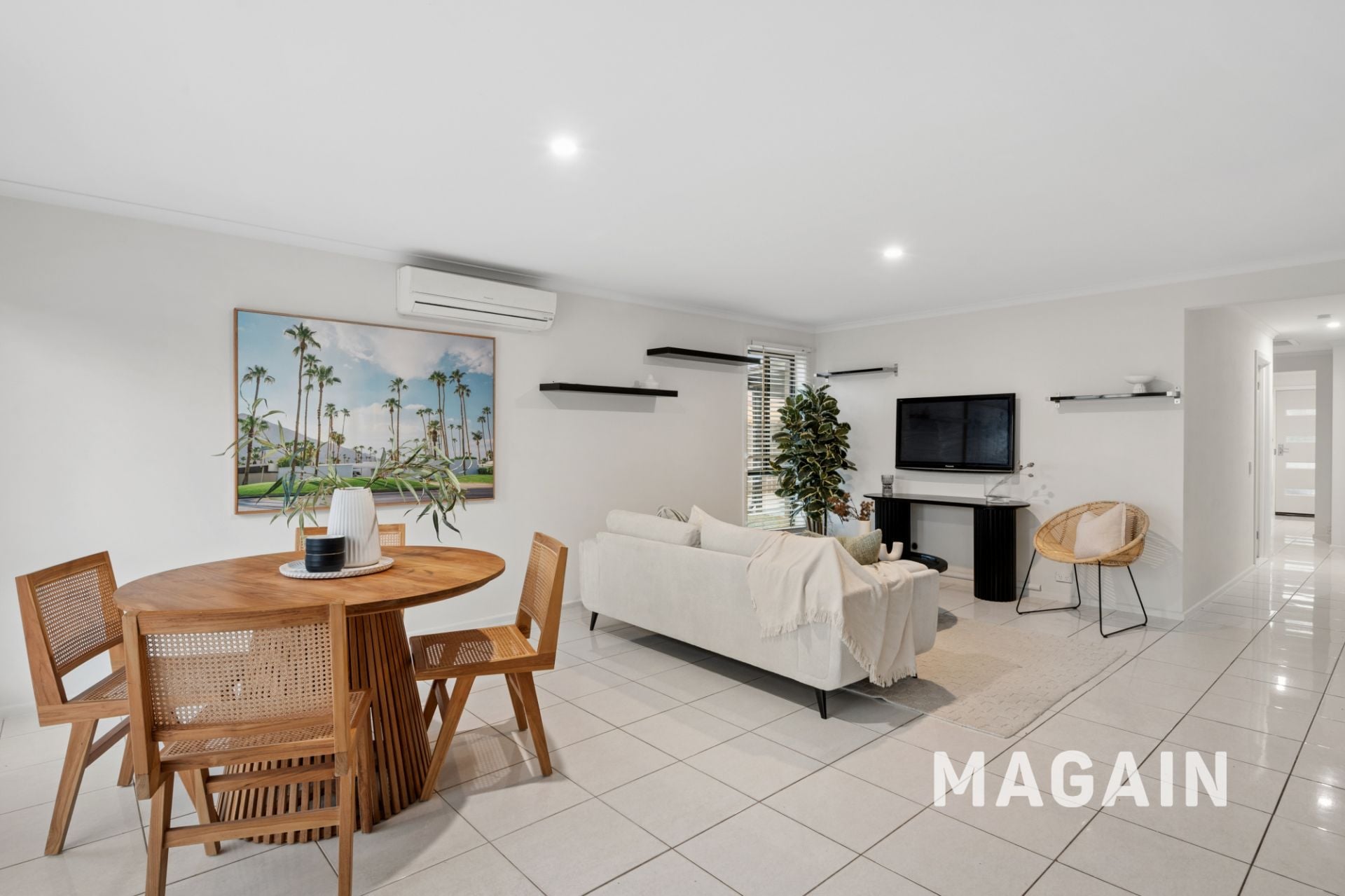 At the rear of the home, you’ll find the heart of the property – a light-filled open plan living and dining space, complemented by a well-appointed galley-style kitchen. Equipped with a dishwasher, dual sink, electric oven, gas cooktop, and rangehood, A split system air conditioner ensures year-round comfort, and the adjacent laundry offers direct external access.