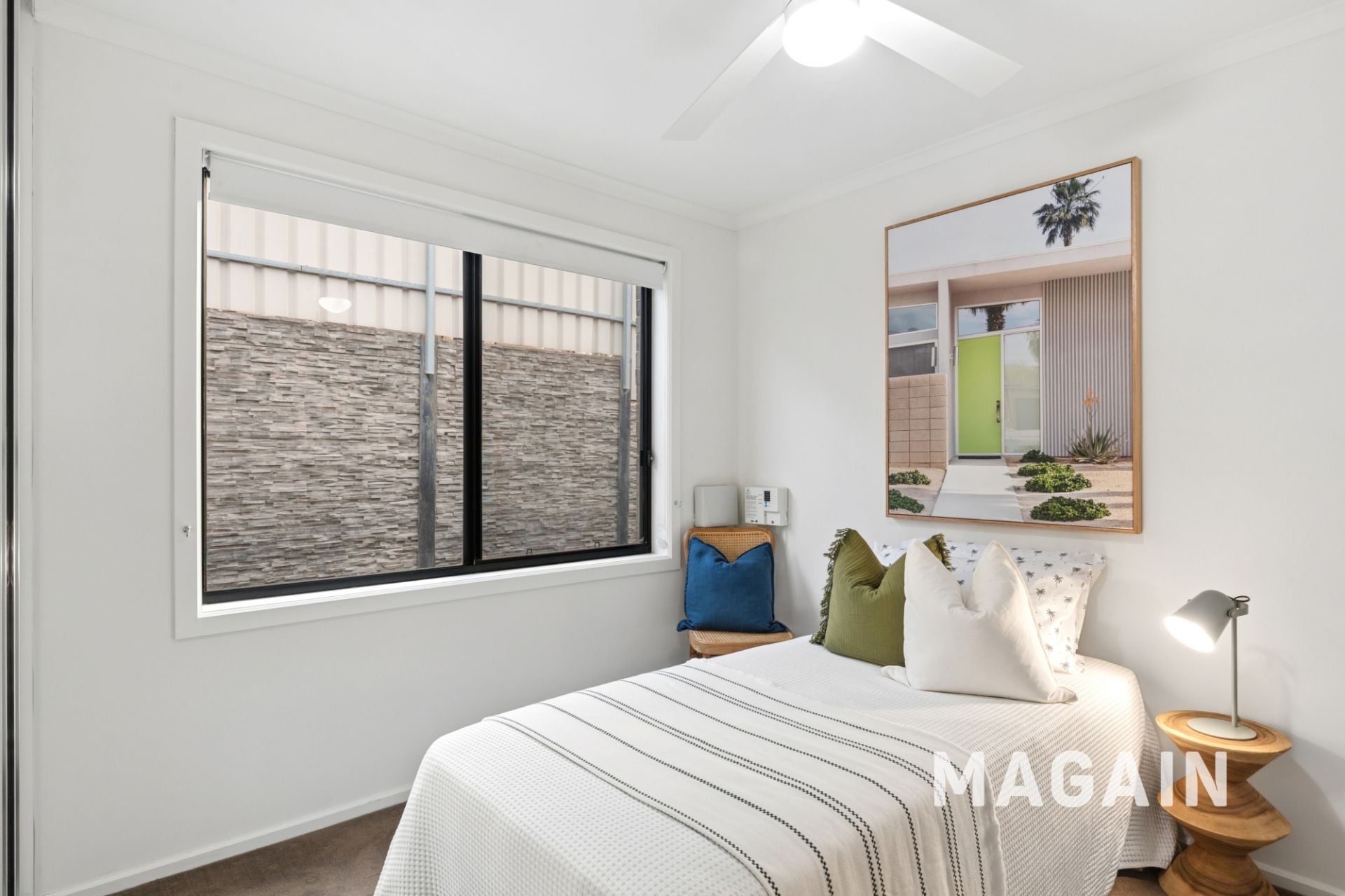 Step inside via the welcoming front portico into a tiled entry hall. The generous main bedroom is privately positioned at the front and features a split system air conditioner, ceiling fan, and walk-through robes with direct access to the neat two-way bathroom, creating a semi-ensuite feel. Bedrooms two and three are both well-proportioned and include built-in robes and ceiling fans for added comfort.