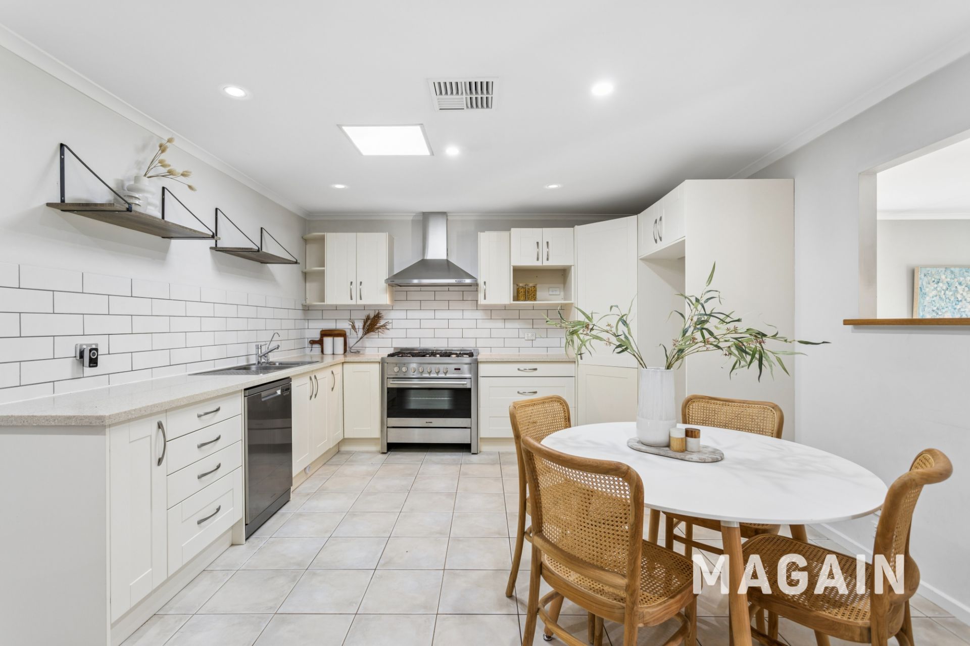Moving through, the heart of the residence unfolds into a spacious kitchen and dining area designed for real family living. The kitchen is both stylish and highly functional, featuring a 900mm oven with gas cooktop, dishwasher, generous bench space and abundant cabinetry. A corner pantry keeps everything neatly tucked away, while a skylight floods the space with natural light, creating an uplifting atmosphere throughout the day. Whether it's midweek meals or weekend entertaining, this is a space that truly performs.