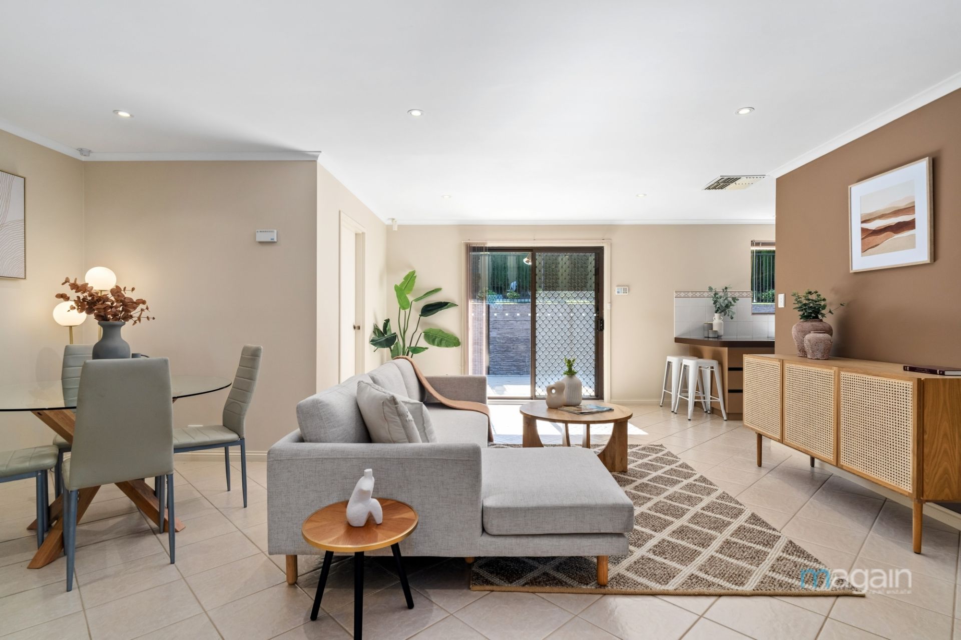 Glass sliding doors from the central living, provide a lovely view of the backyard, while also granting seamless access to an expansive paved entertaining area running along the entire back of the home.