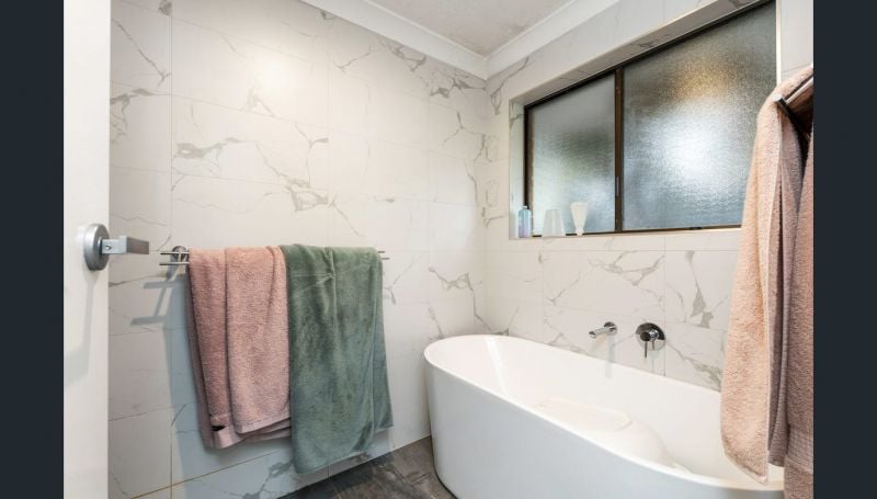 • Updated, airy bathroom – boasting floor-to-ceiling tiles, a separate shower, a freestanding bathtub, and a toilet