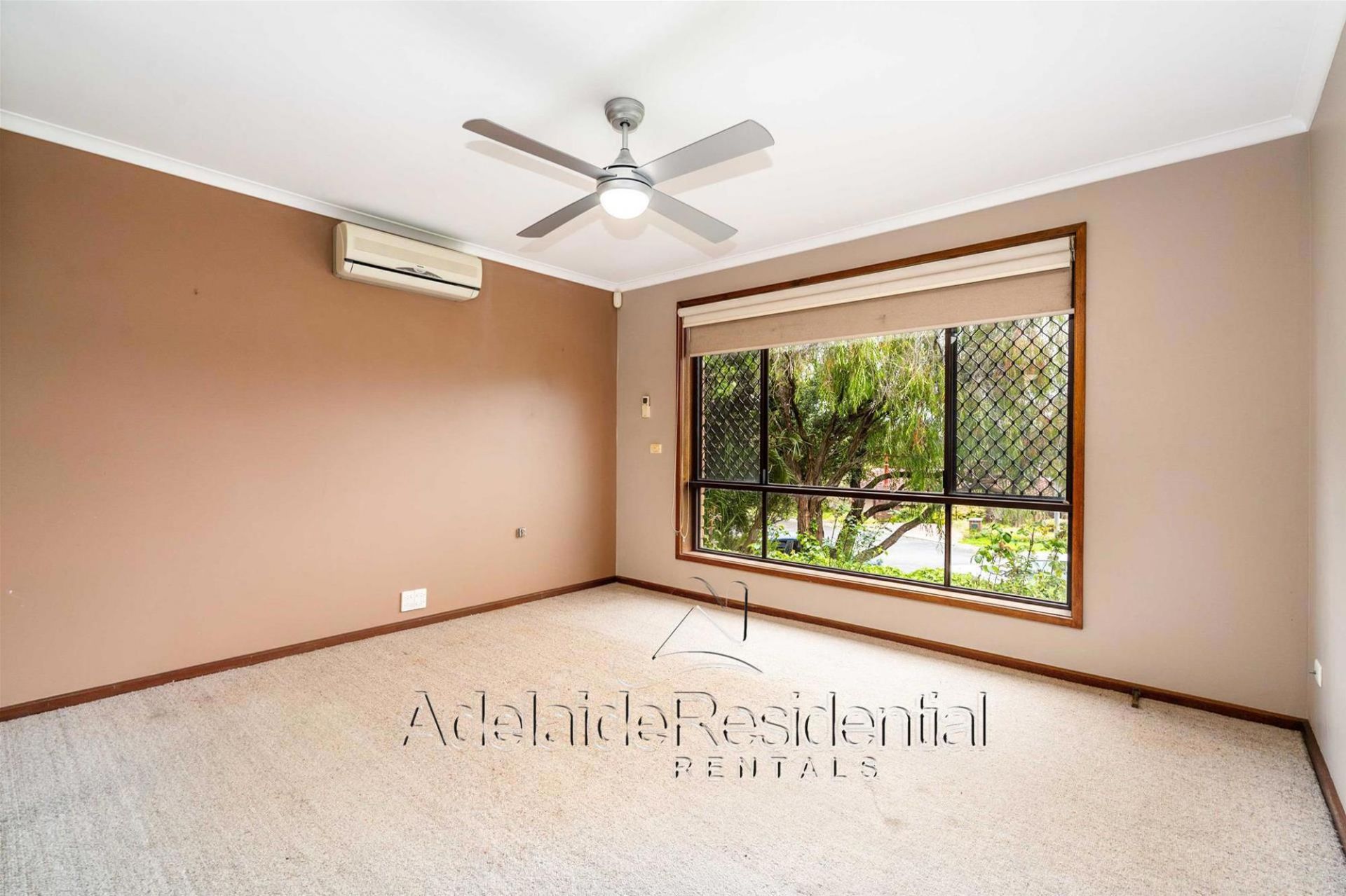 The three bedrooms are conveniently located to the right of the entrance, with the master featuring a built-in robe, split system, and ceiling fan, all in proximity to the updated main bathroom with a separate toilet. A linen cupboard in this area provides additional storage space.