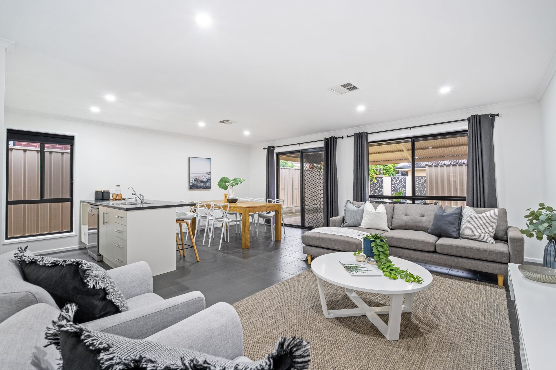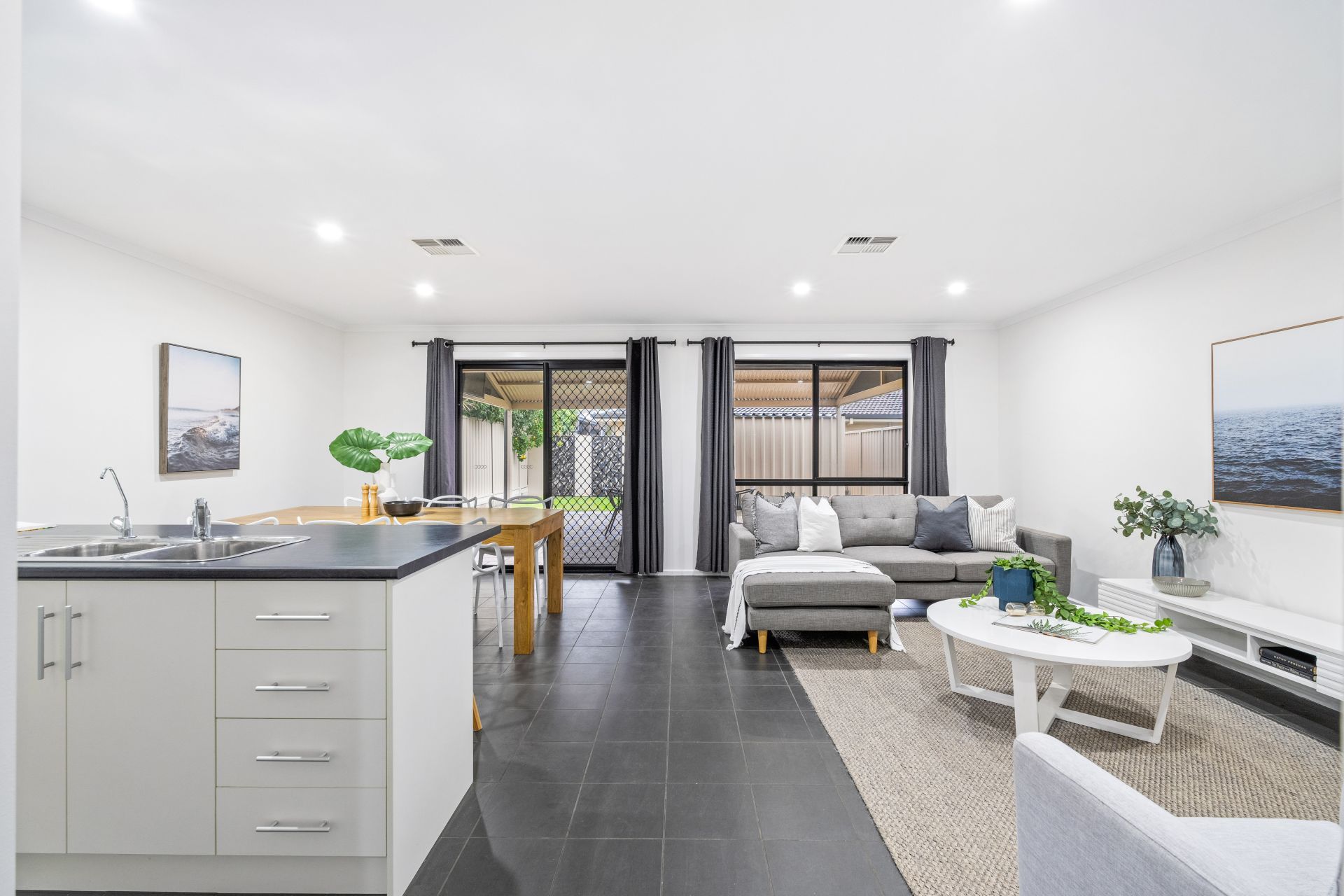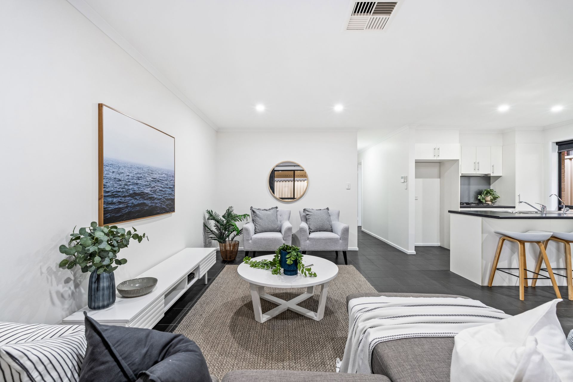 Welcoming you upon entry is a neat hallway leading past all three bedrooms, and through to a spacious open-plan kitchen, living and dining, that spills out through sliding doors to an alfresco entertaining area. The home's neutral palette and modern tiled flooring combined with cozy carpets bathed in natural light give an instant touch of elegance. You will feel comfortable year-round with the addition of ducted reverse cycle heating and cooling throughout the home.