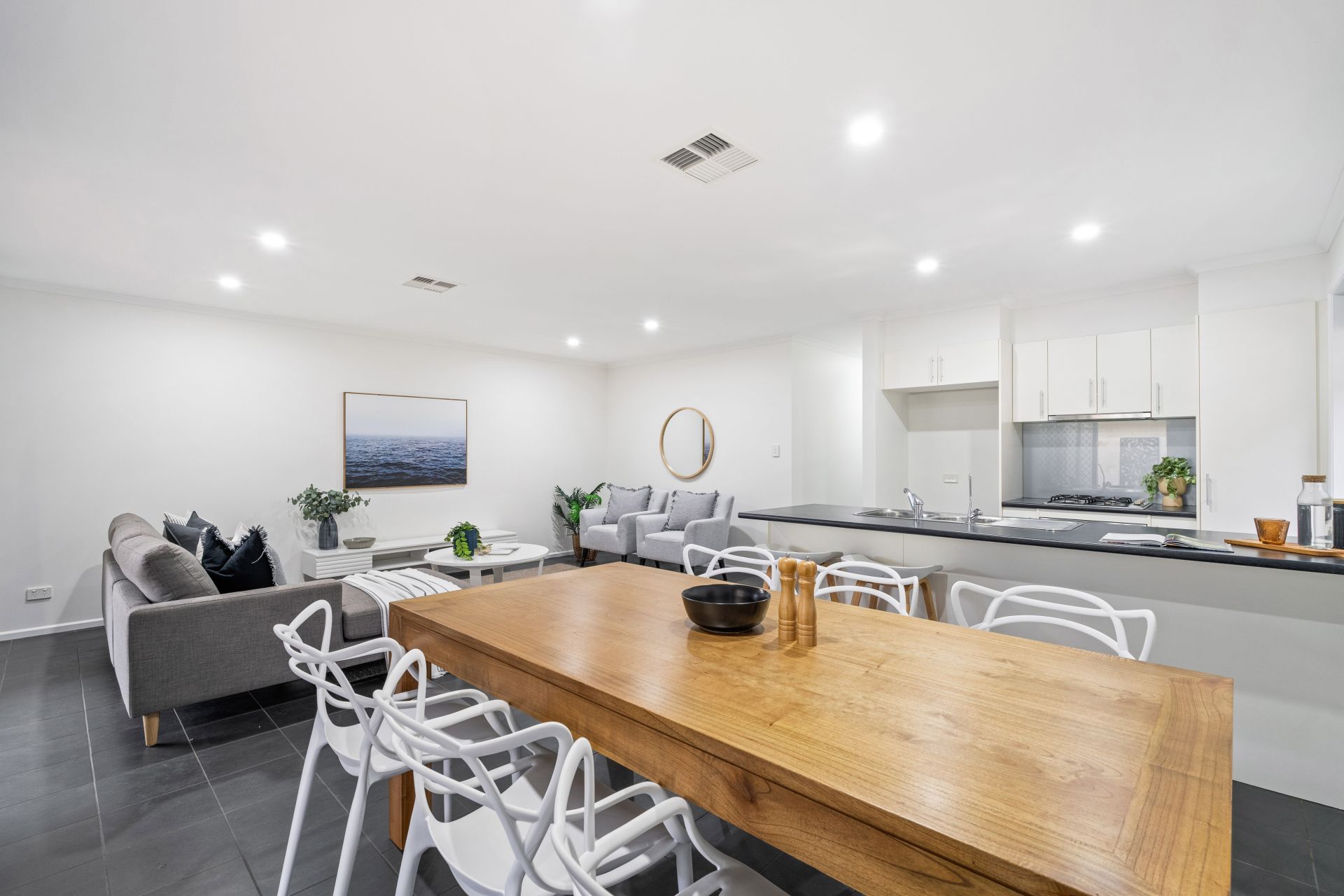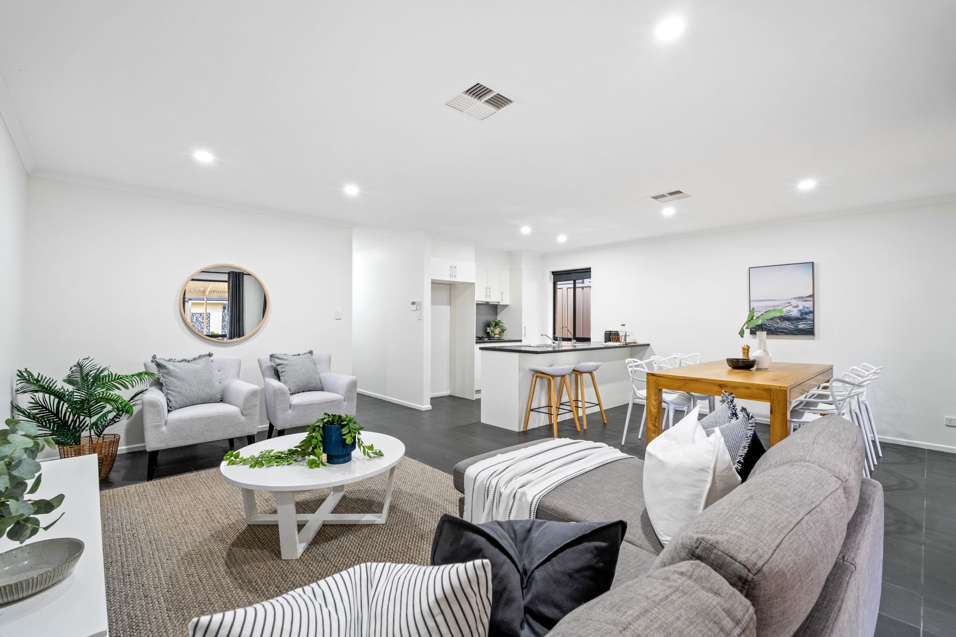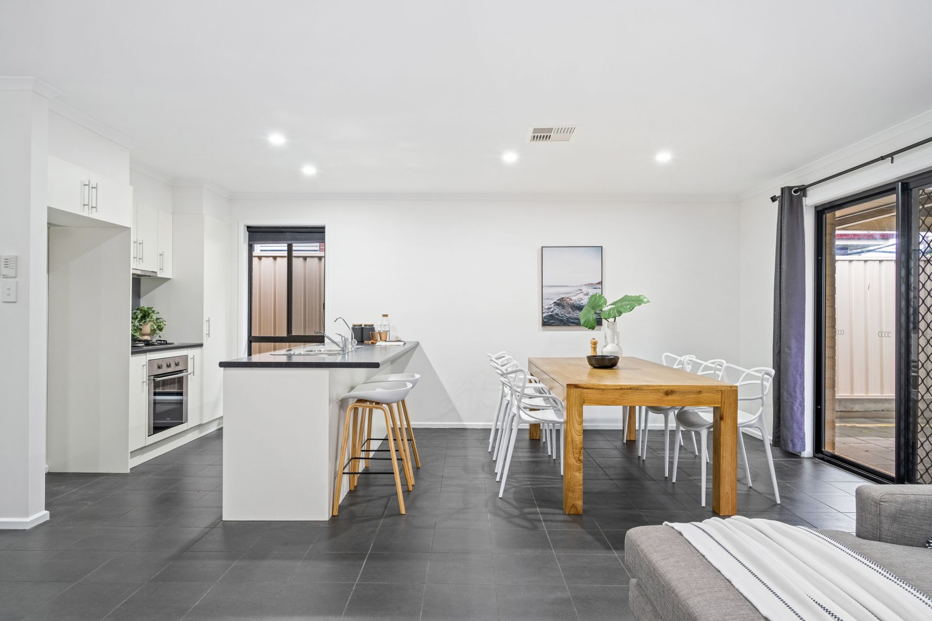 Welcoming you upon entry is a neat hallway leading past all three bedrooms, and through to a spacious open-plan kitchen, living and dining, that spills out through sliding doors to an alfresco entertaining area. The home's neutral palette and modern tiled flooring combined with cozy carpets bathed in natural light give an instant touch of elegance. You will feel comfortable year-round with the addition of ducted reverse cycle heating and cooling throughout the home.