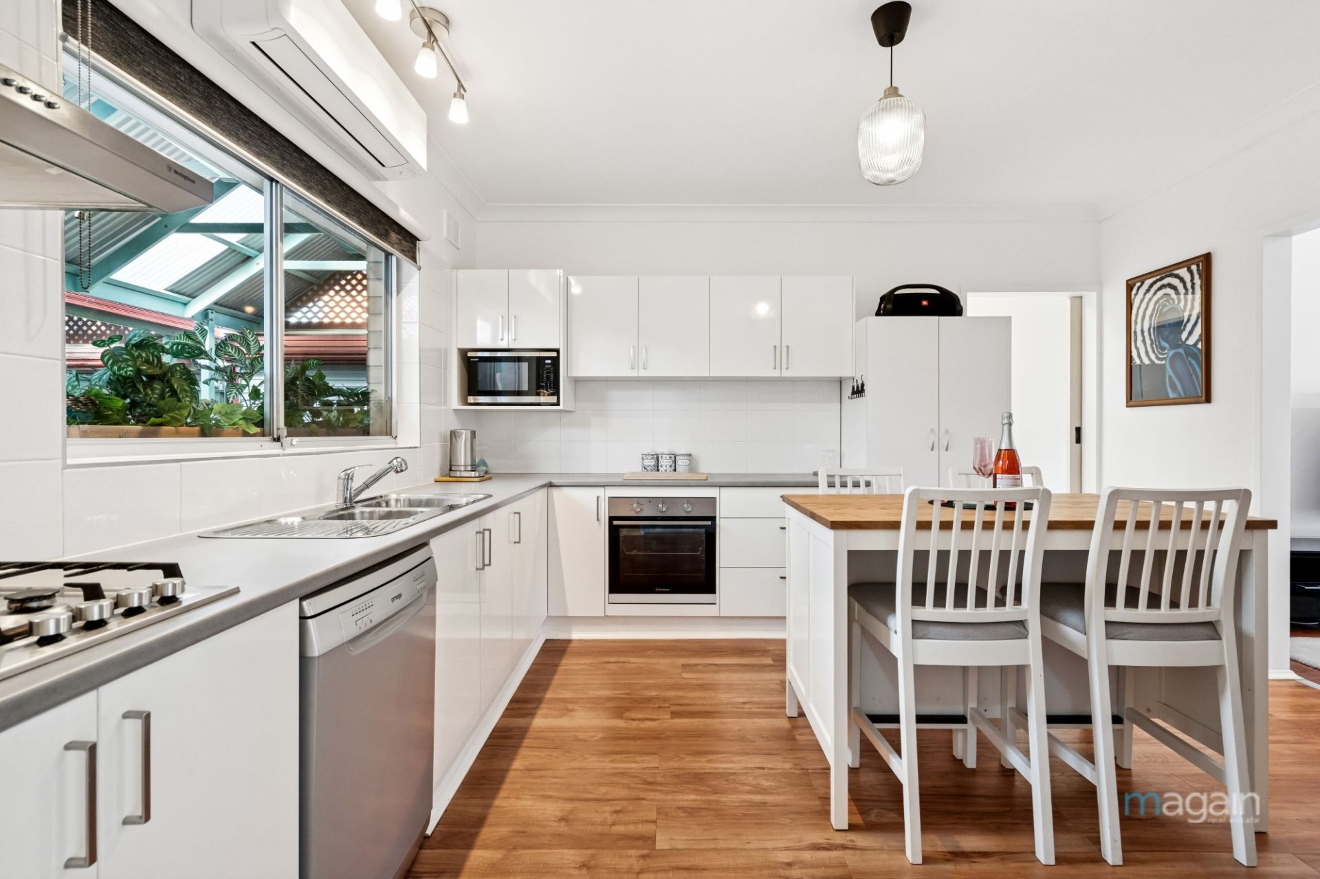 The spectacular eat-in kitchen has stainless appliances, gas cooktop and a dishwasher for easy clean-ups after a busy day. The bathroom has been upgraded too. It includes a proper bathtub and separate toilet. Storage is well taken care of with built-in-cabinetry and linen presses to the laundry, in addition there's a built-in-robe in the master bedroom.