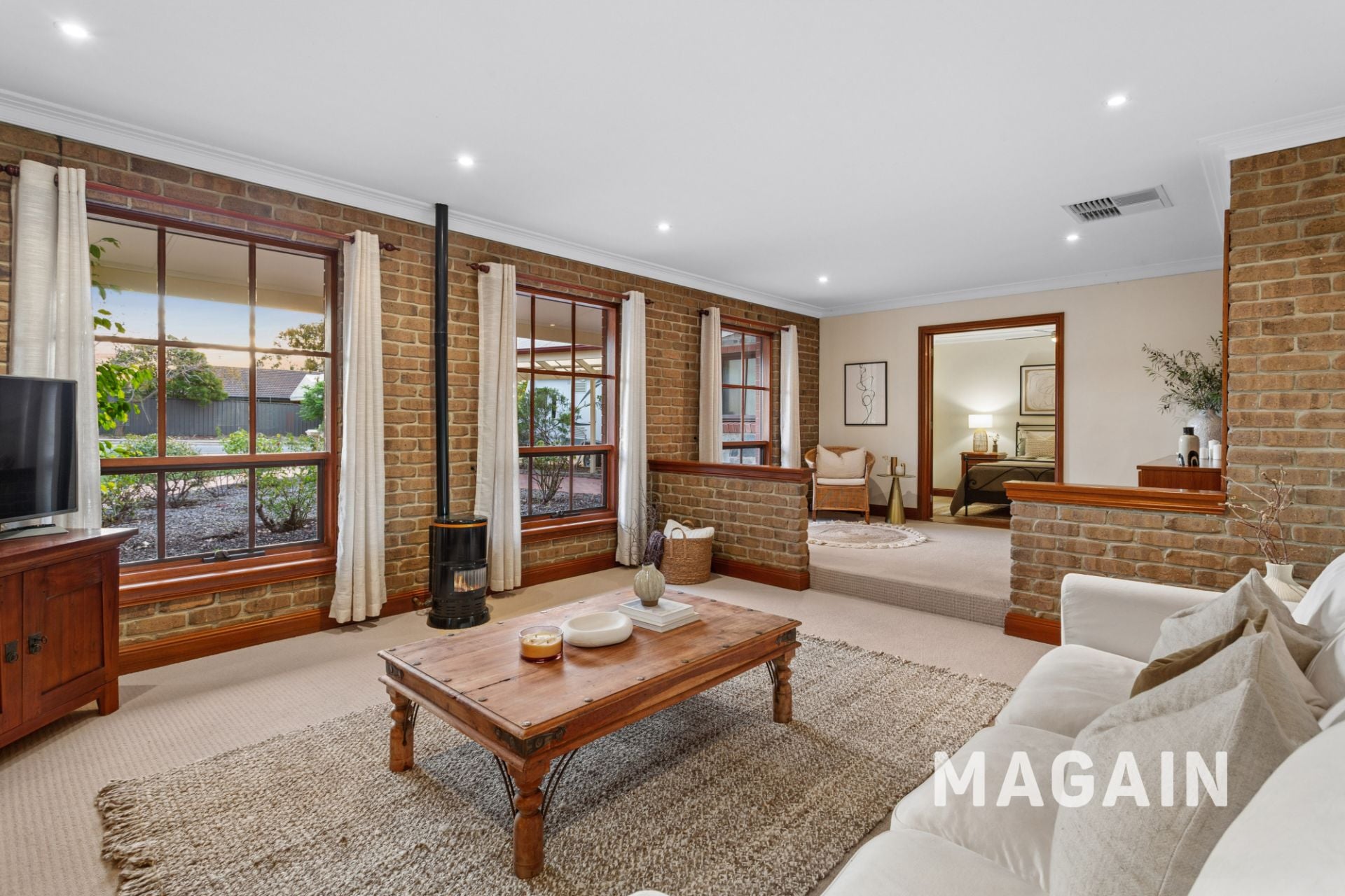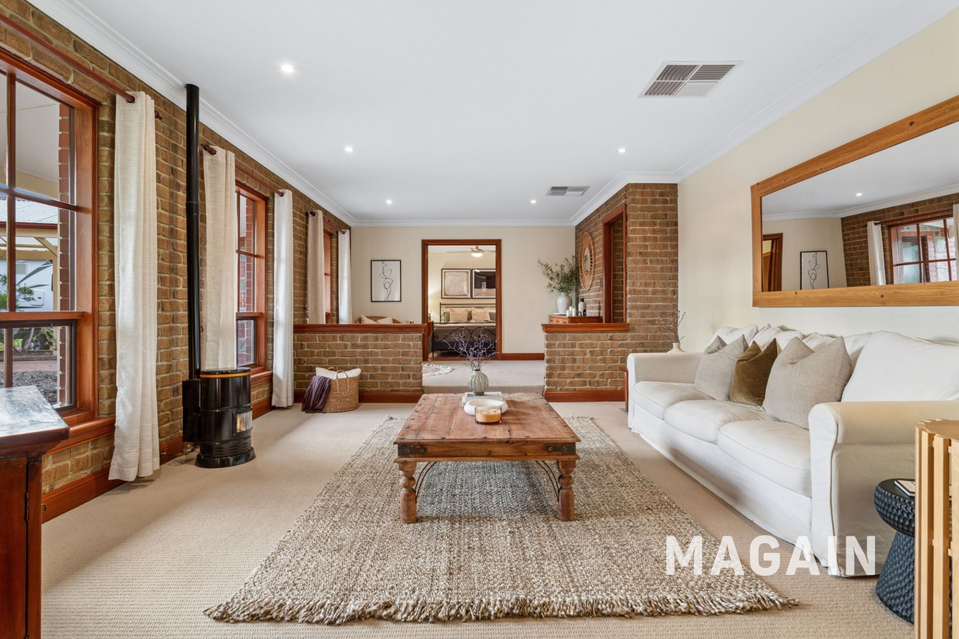 At the front of the home, the first living zone provides a cosy retreat, perfect for relaxing nights in, complete with a pot belly fireplace. This space transitions seamlessly into a formal dining area, ideal for hosting family dinners or special occasions.
