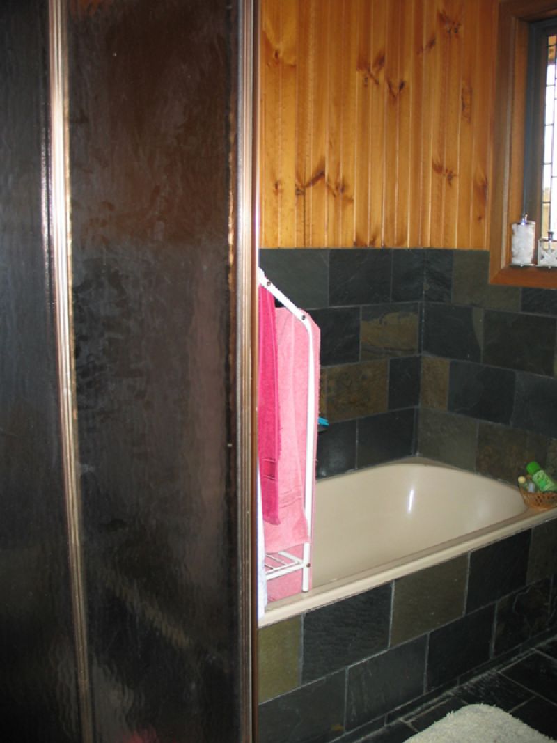 The bathroom has timber paneling and slate tiles giving that warm cosy feeling.