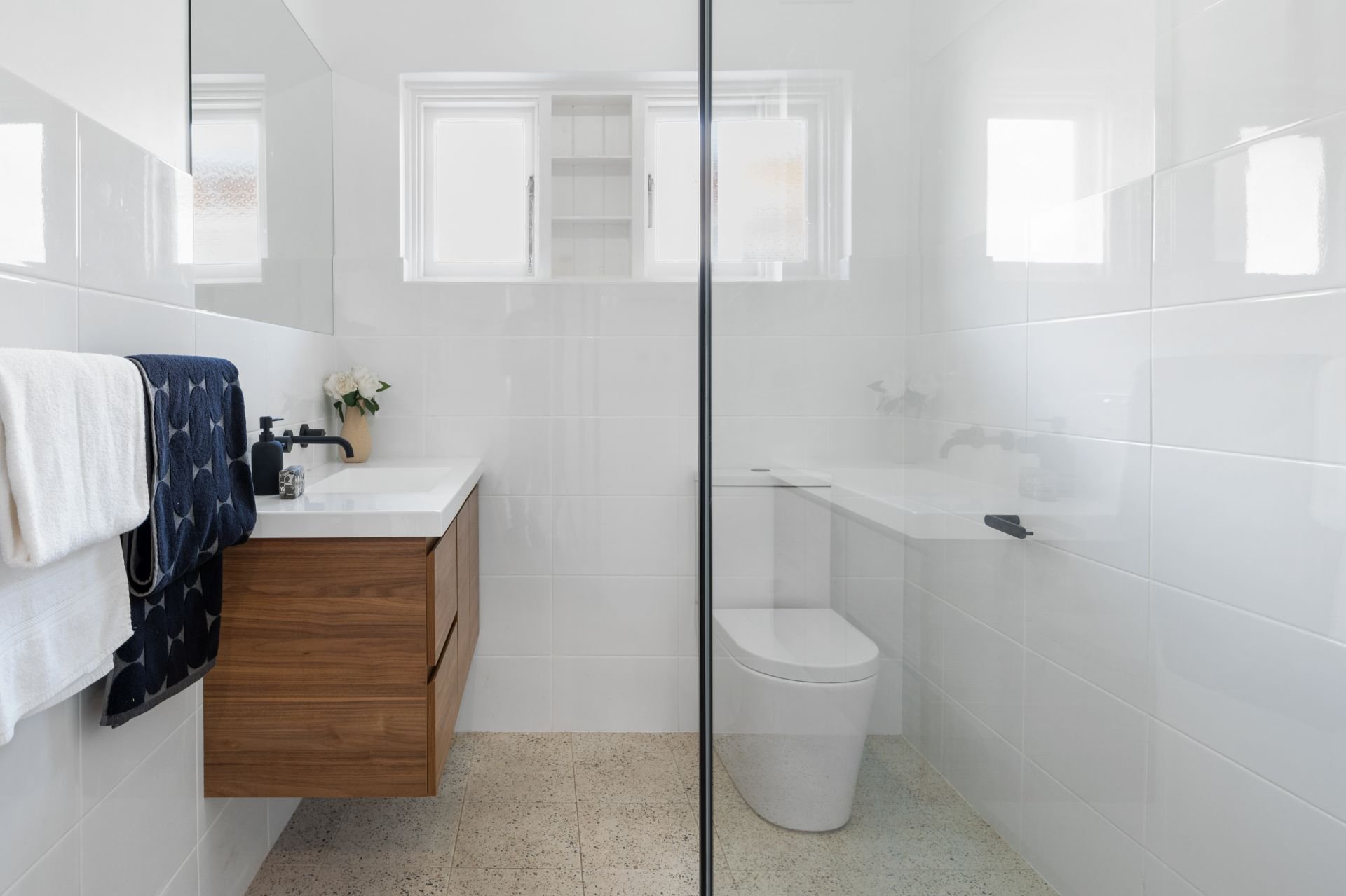 Stylish terrazzo look floor tiles combine with large white wall tiles in the bathroom